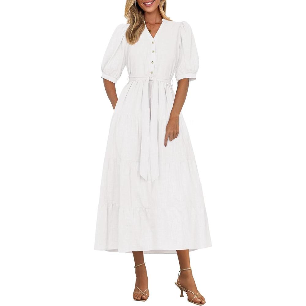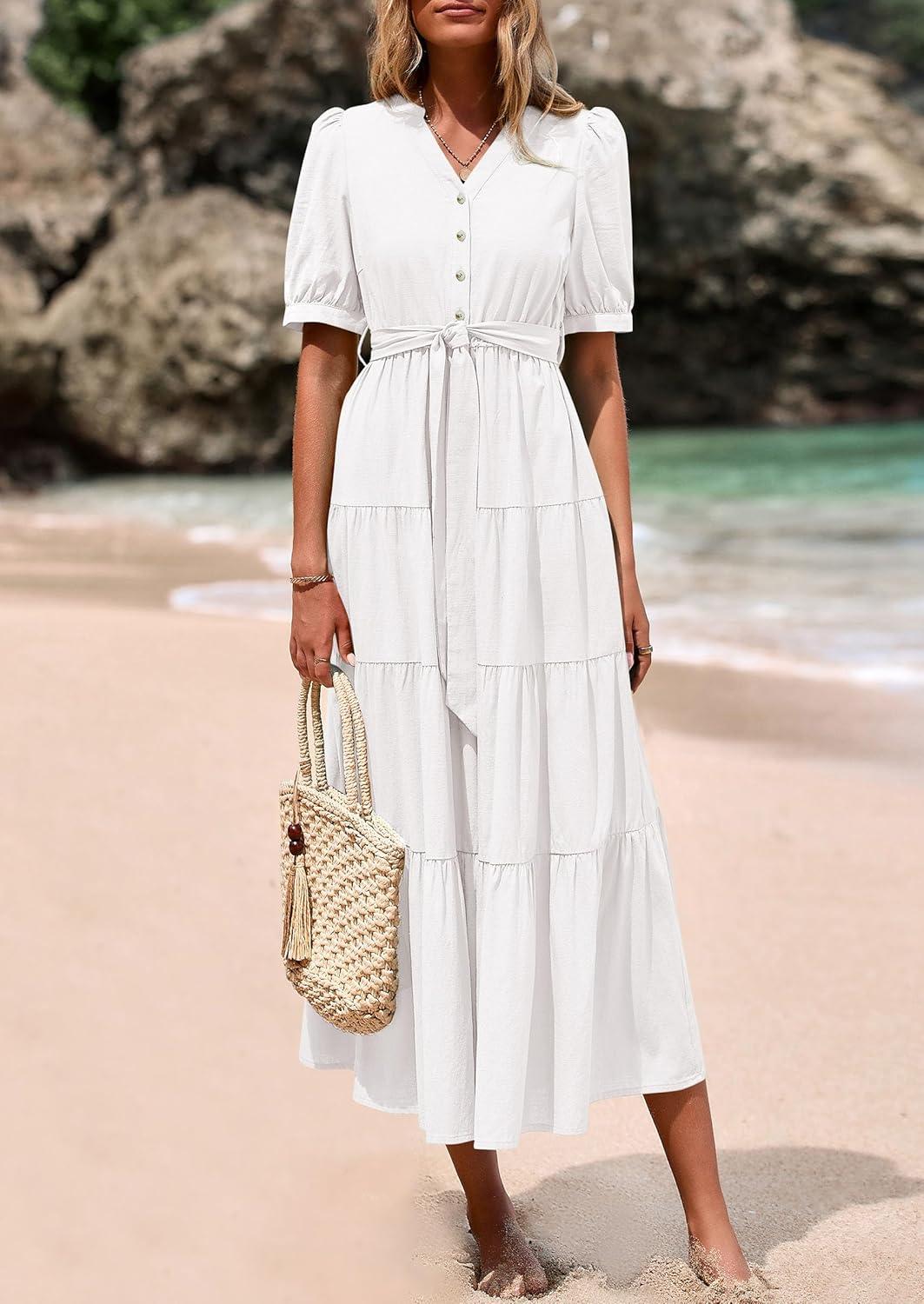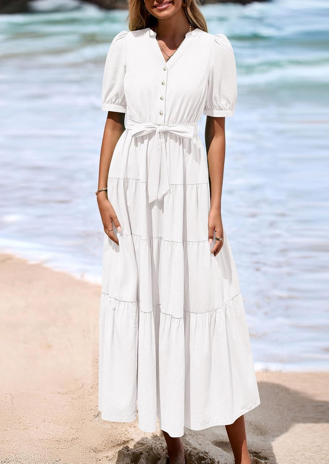 PRETTYGARDEN Summer Dresses for Women 2025 Elegant Classy Short Sleeve V Neck Ruffle A Line Belted Long Flowy Beach Dress(White)