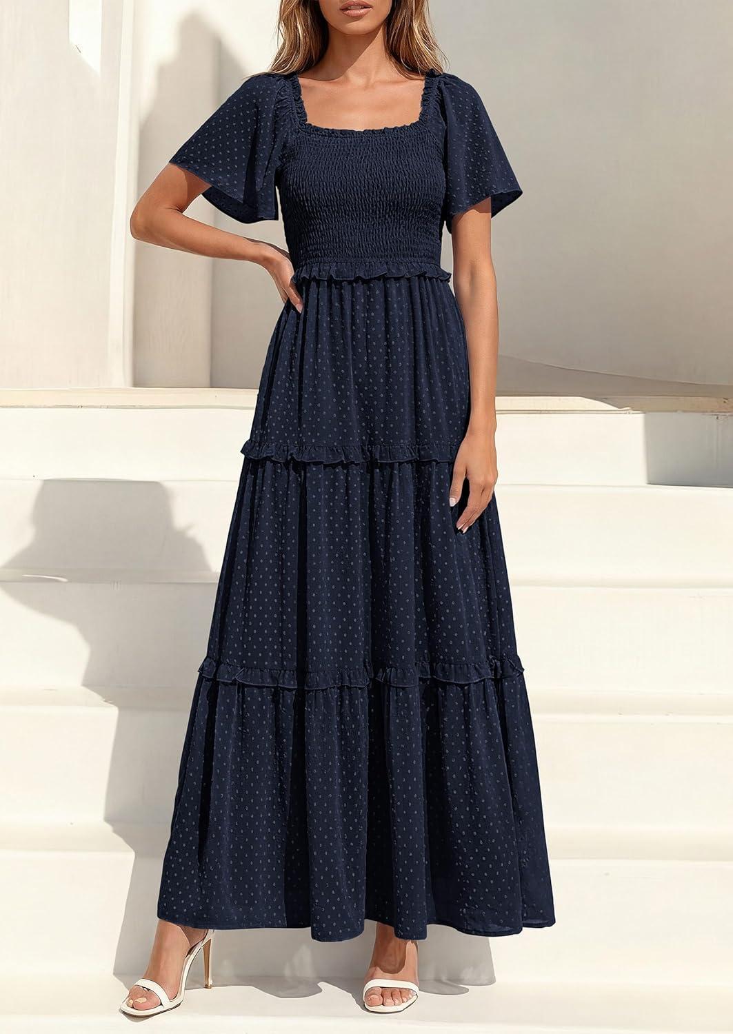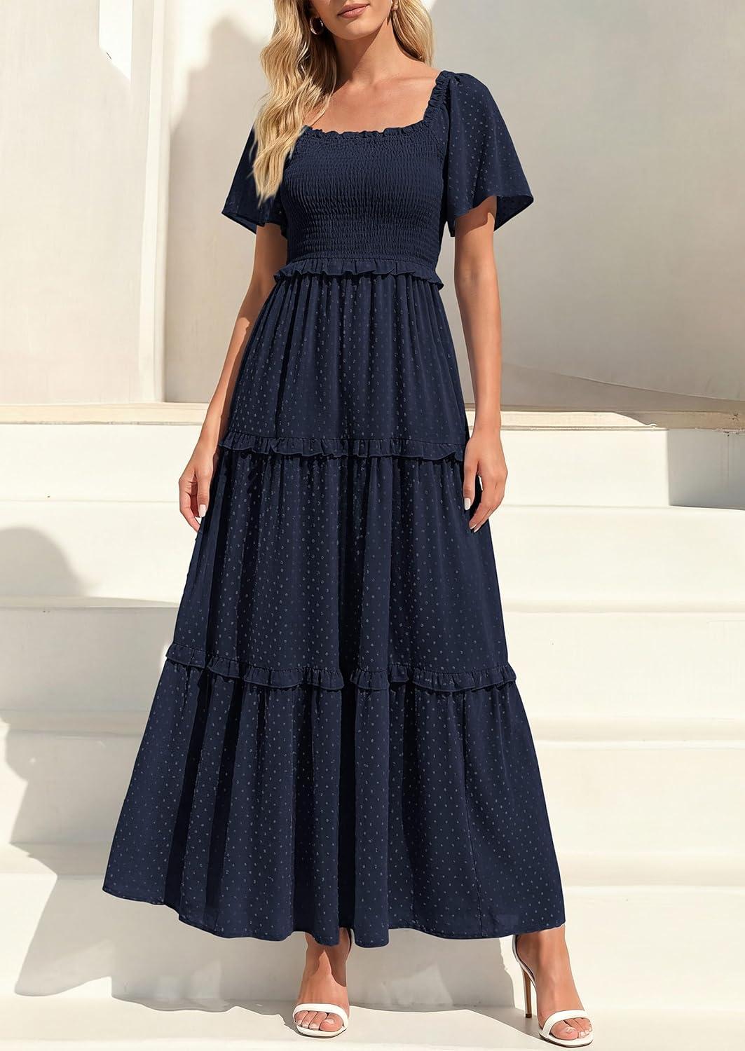 PRETTYGARDEN Summer Dresses for Women 2026 Boho Swiss Dot Smocked Square Neck Short Sleeve Spring Wedding Guest Maxi Dress(Navy Blue)