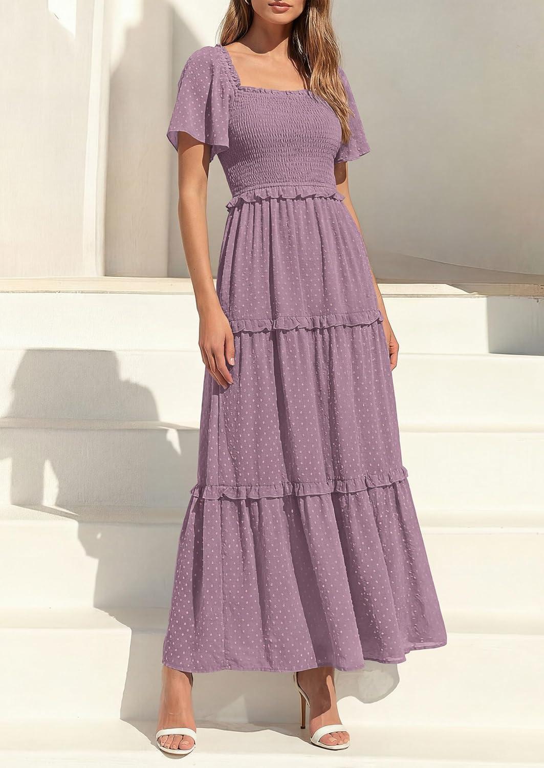 PRETTYGARDEN Summer Dresses for Women 2026 Boho Swiss Dot Smocked Square Neck Short Sleeve Spring Wedding Guest Maxi Dress(Purple)