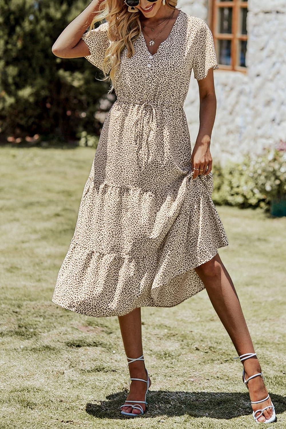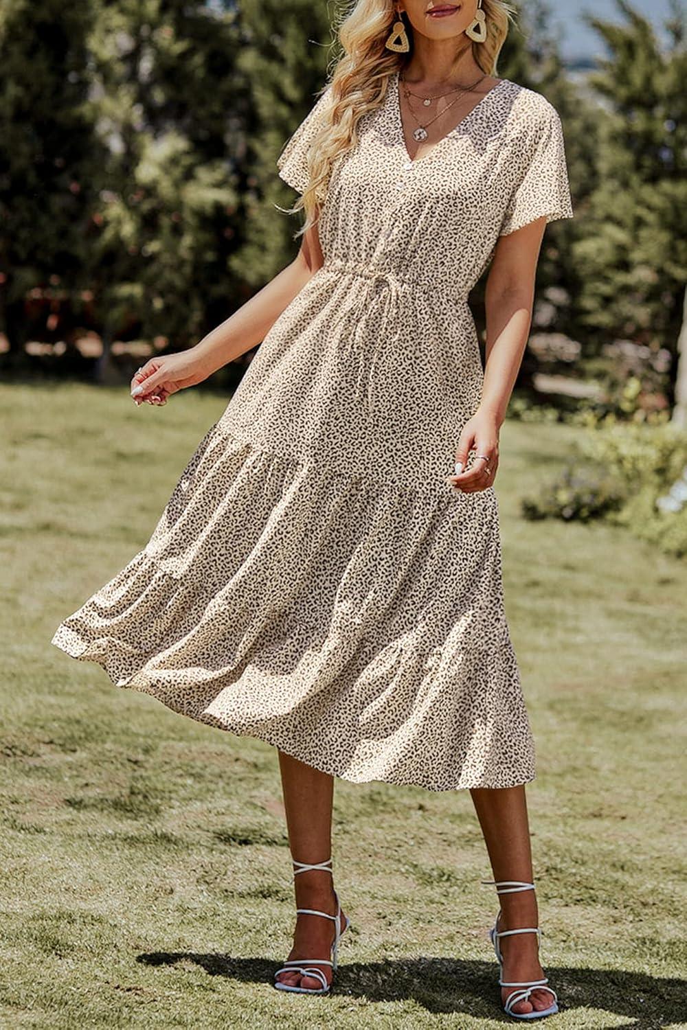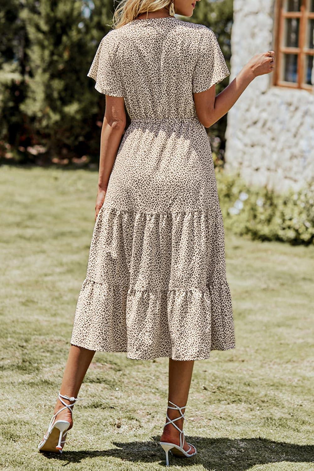 PRETTYGARDEN Summer Floral Dress for Women 2025 Casual Boho Short Sleeve Maxi Dresses V Neck Tiered Flowy Beach Sundress(Apricot Leopard)