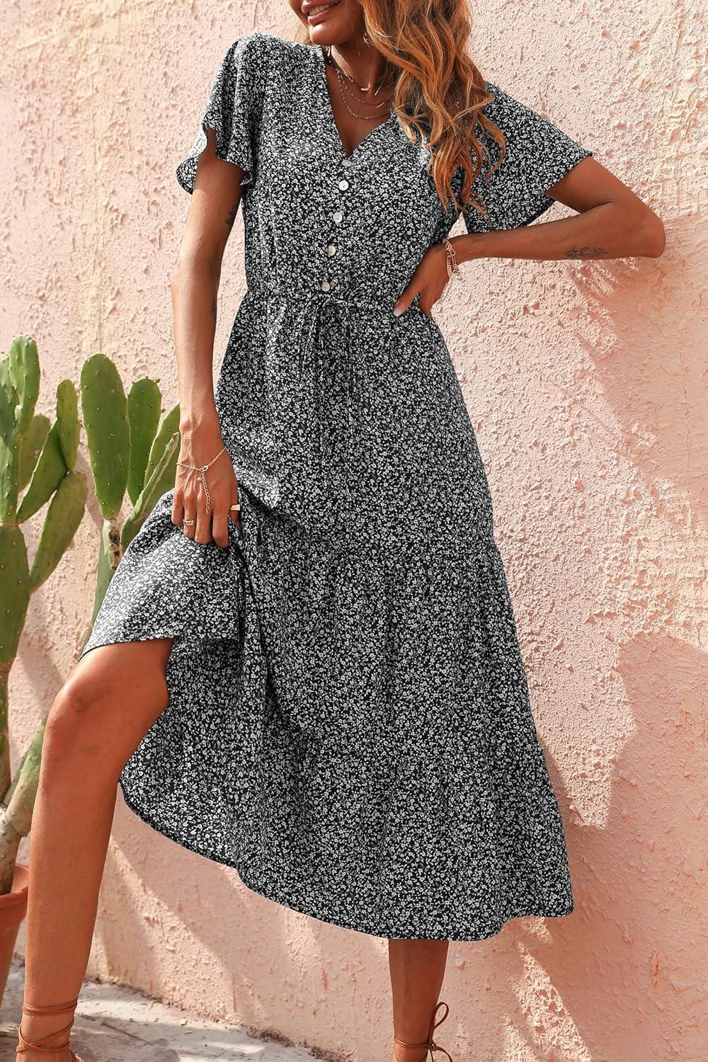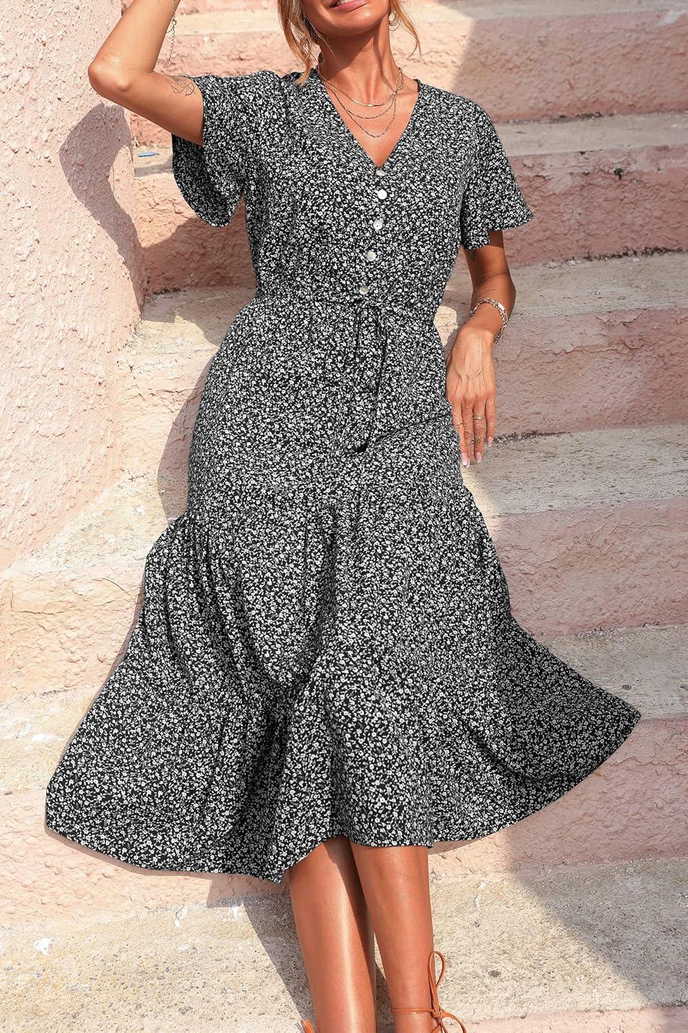 PRETTYGARDEN Summer Floral Dress for Women 2025 Casual Boho Short Sleeve Maxi Dresses V Neck Tiered Flowy Beach Sundress(Black Floral)