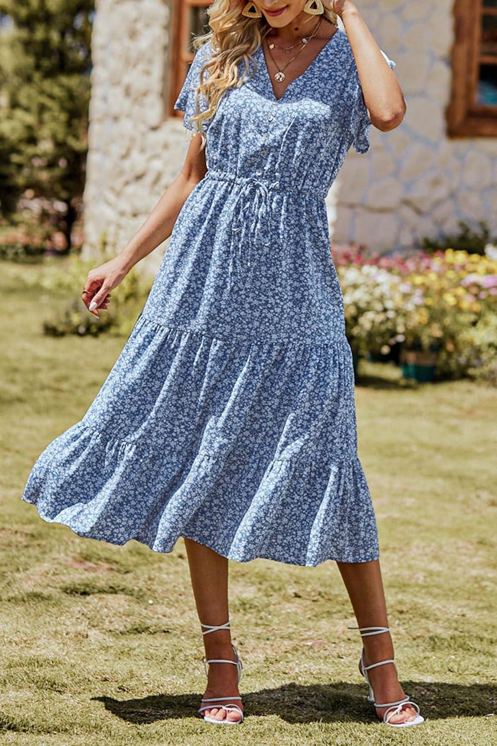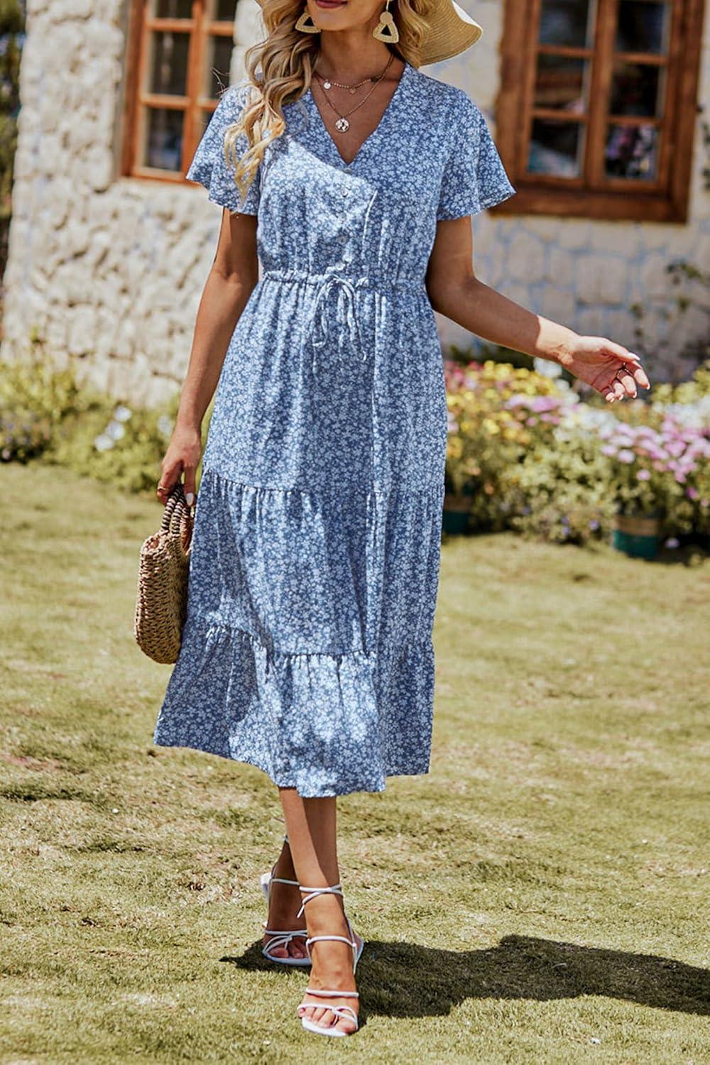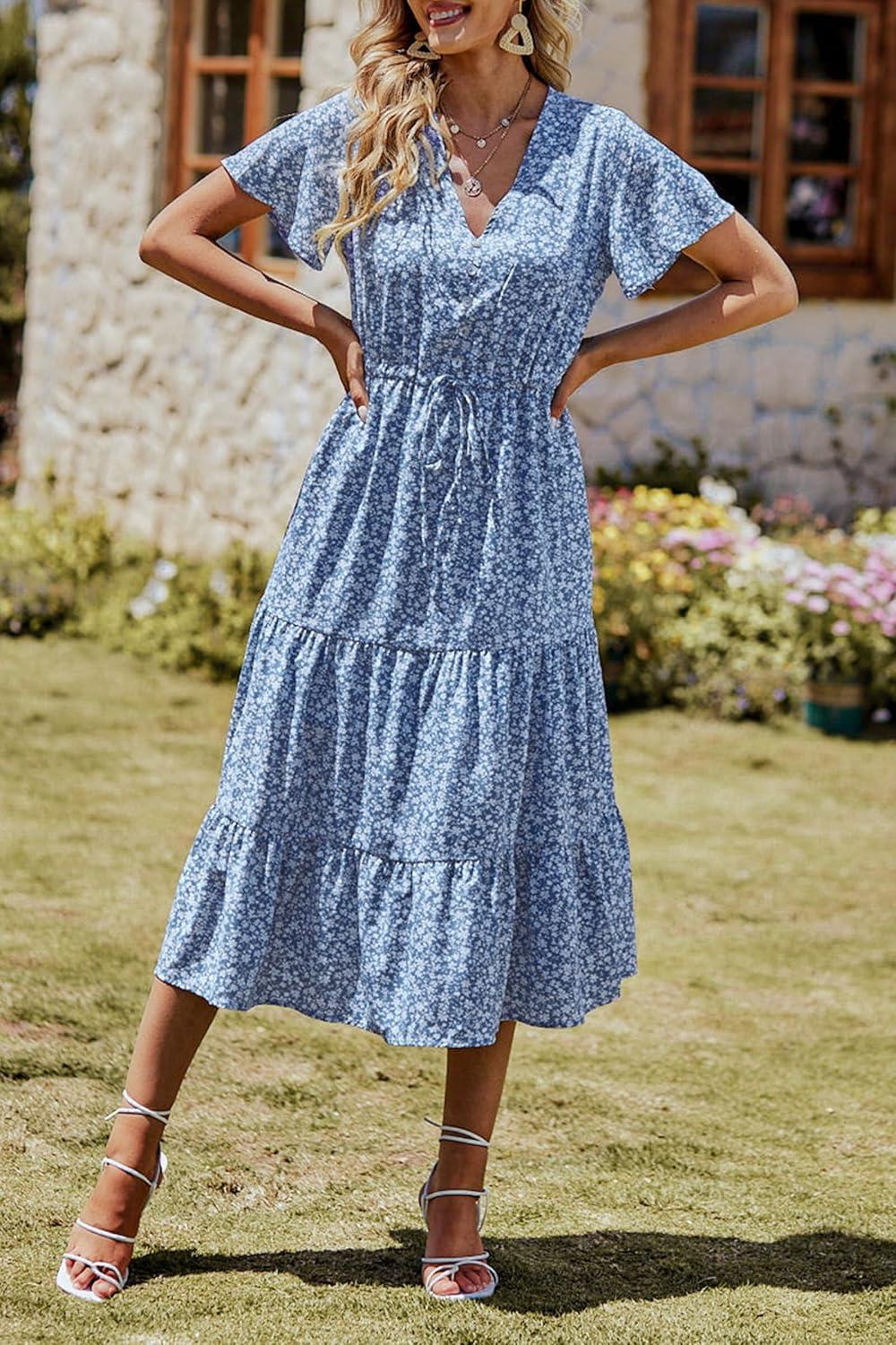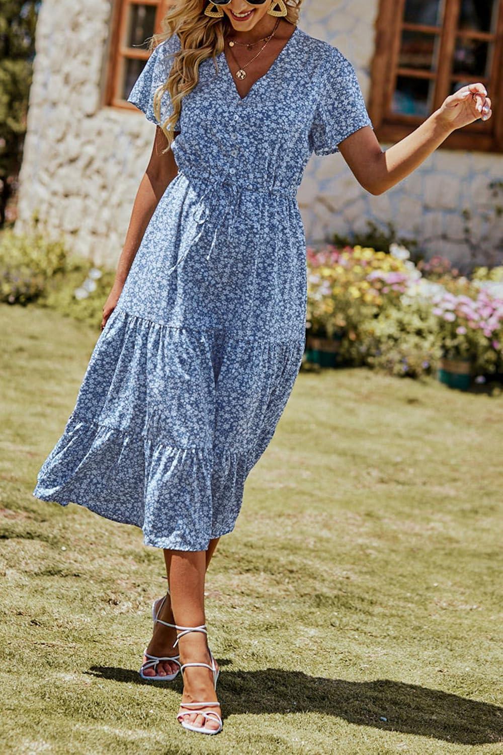 PRETTYGARDEN Summer Floral Dress for Women 2025 Casual Boho Short Sleeve Maxi Dresses V Neck Tiered Flowy Beach Sundress(Blue)