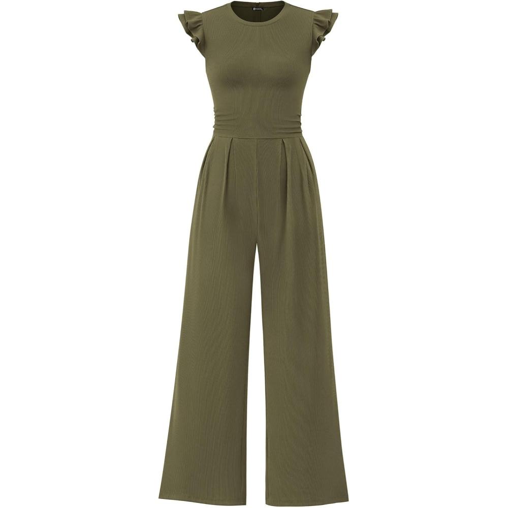 PRETTYGARDEN Summer Jumpsuits for Women Dressy 2025 Fashion Ruffle Cap Sleeve Romper Crew Neck Rib Knit One Piece Outfits(Army Green)