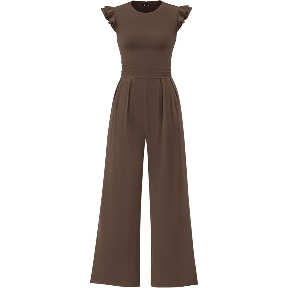 PRETTYGARDEN Summer Jumpsuits for Women Dressy 2025 Fashion Ruffle Cap Sleeve Romper Crew Neck Rib Knit One Piece Outfits(Dark Brown)
