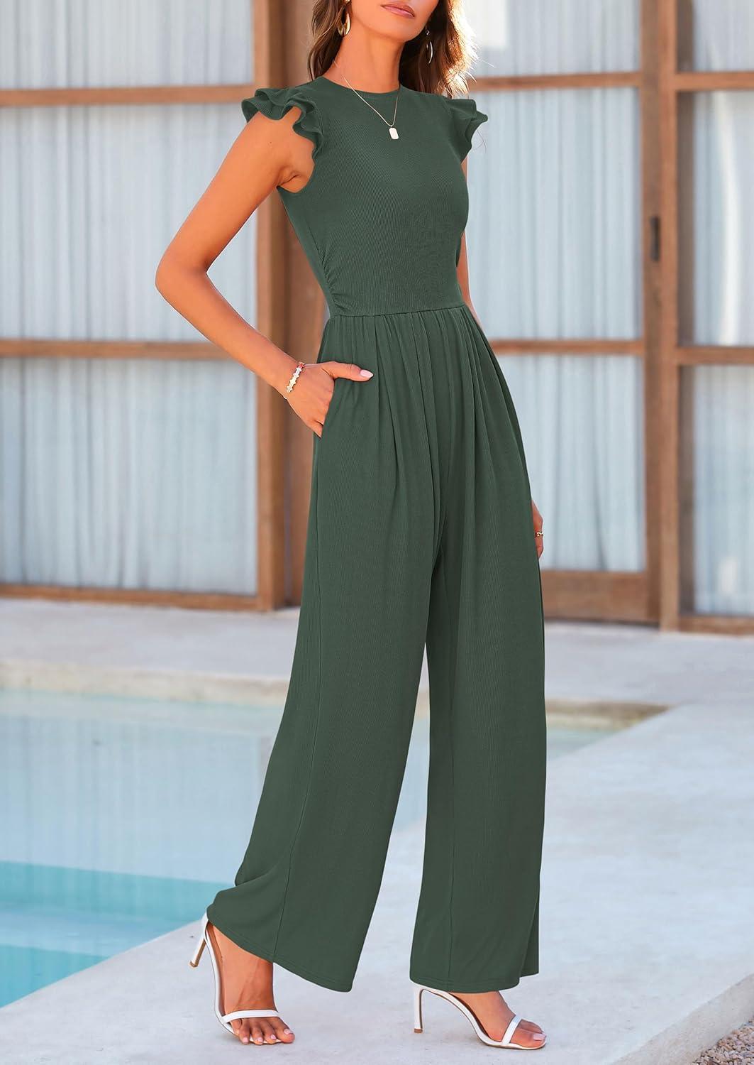 PRETTYGARDEN Summer Jumpsuits for Women Dressy 2025 Fashion Ruffle Cap Sleeve Romper Crew Neck Rib Knit One Piece Outfits(Dark Green)