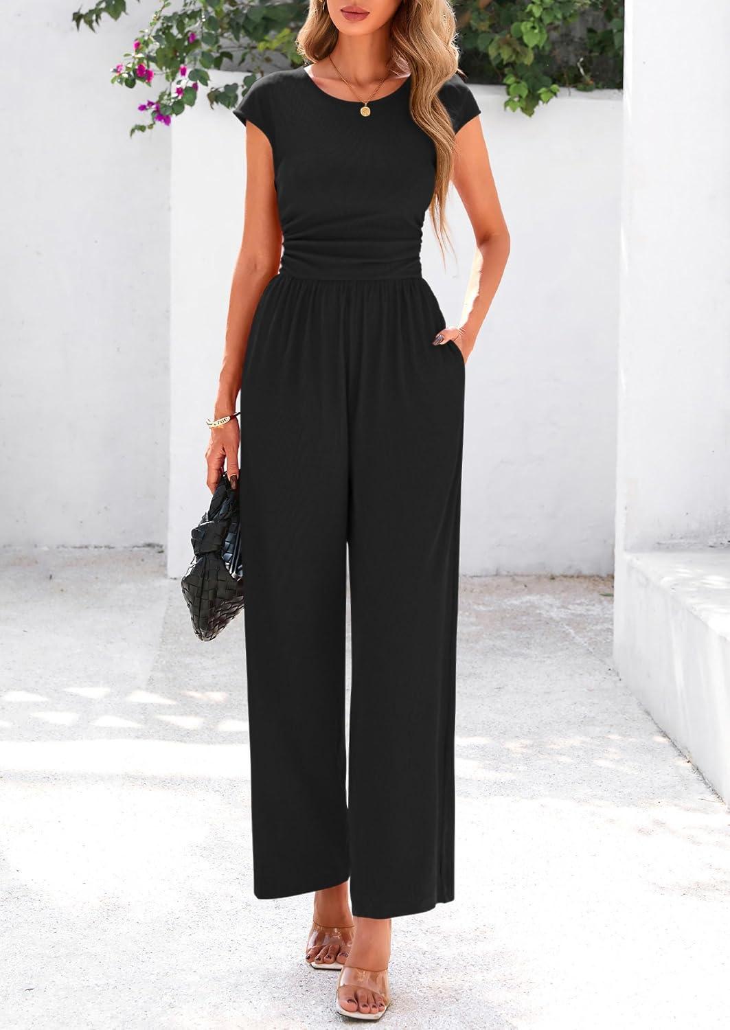 PRETTYGARDEN Summer Jumpsuits for Women Dressy 2025 Ribbed Cap Sleeve Wide Leg Pants Rompers Elegant Casual One Piece Outfits(Black)