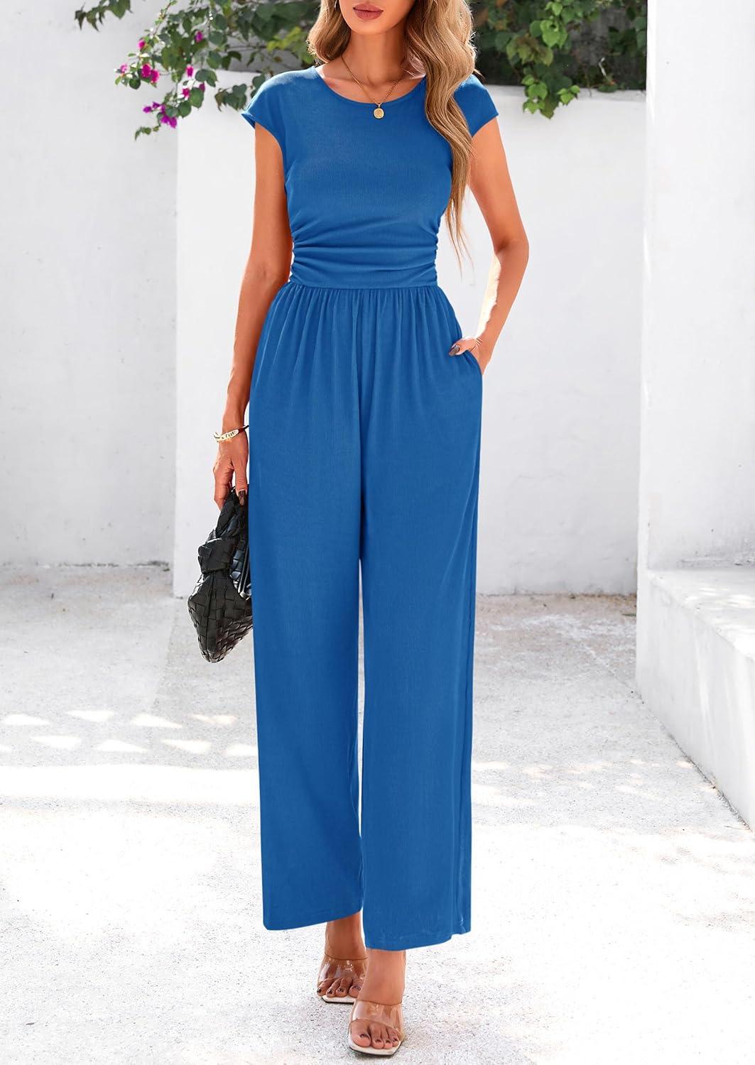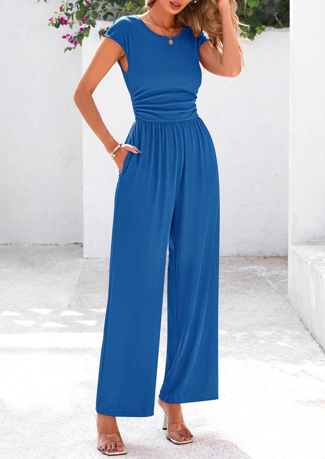 PRETTYGARDEN Summer Jumpsuits for Women Dressy 2025 Ribbed Cap Sleeve Wide Leg Pants Rompers Elegant Casual One Piece Outfits(Blue)