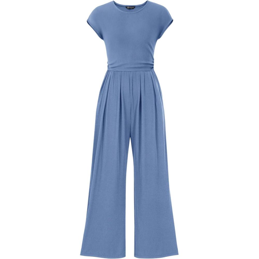 PRETTYGARDEN Summer Jumpsuits for Women Dressy 2025 Ribbed Cap Sleeve Wide Leg Pants Rompers Elegant Casual One Piece Outfits(Light Grey Blue)