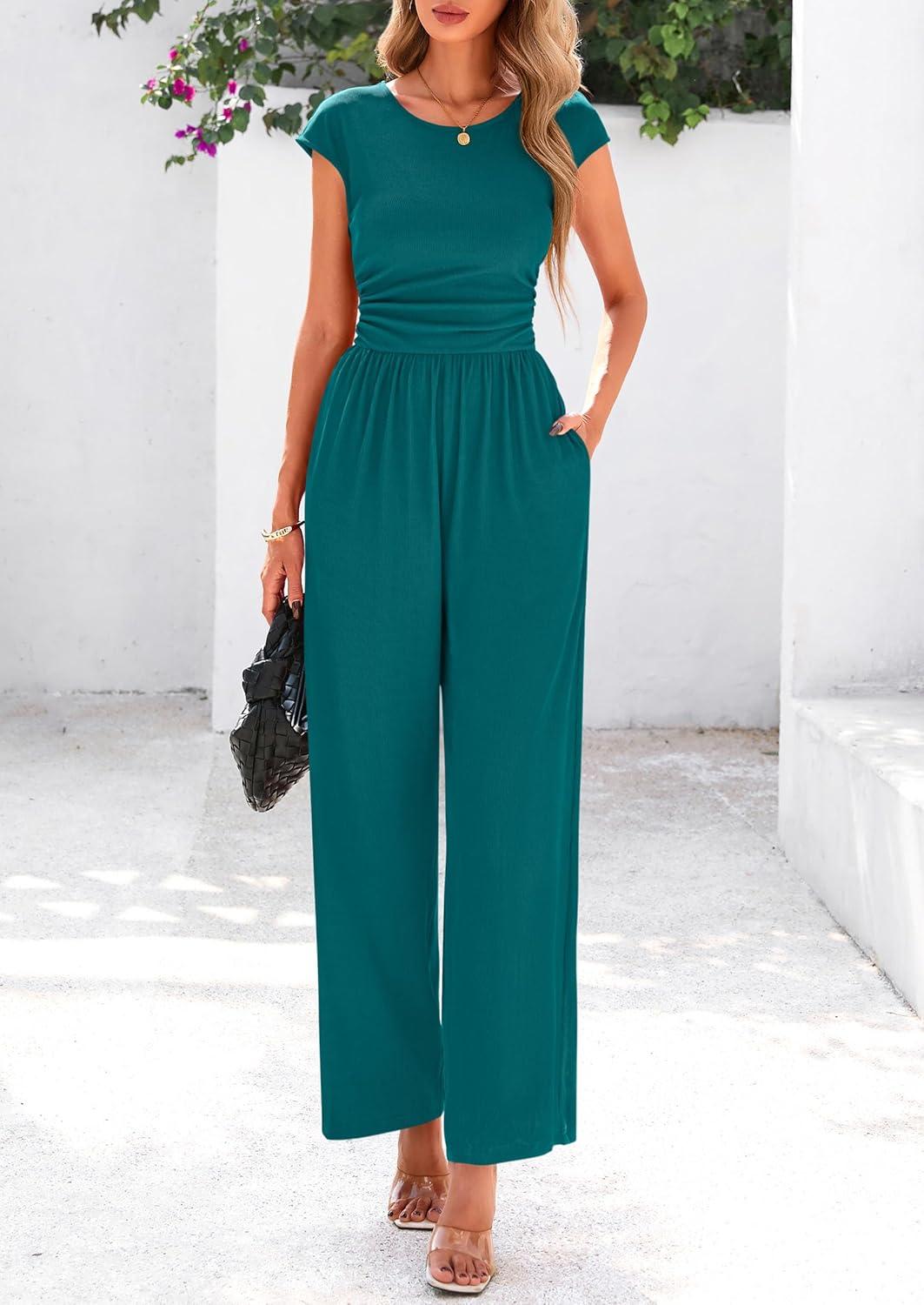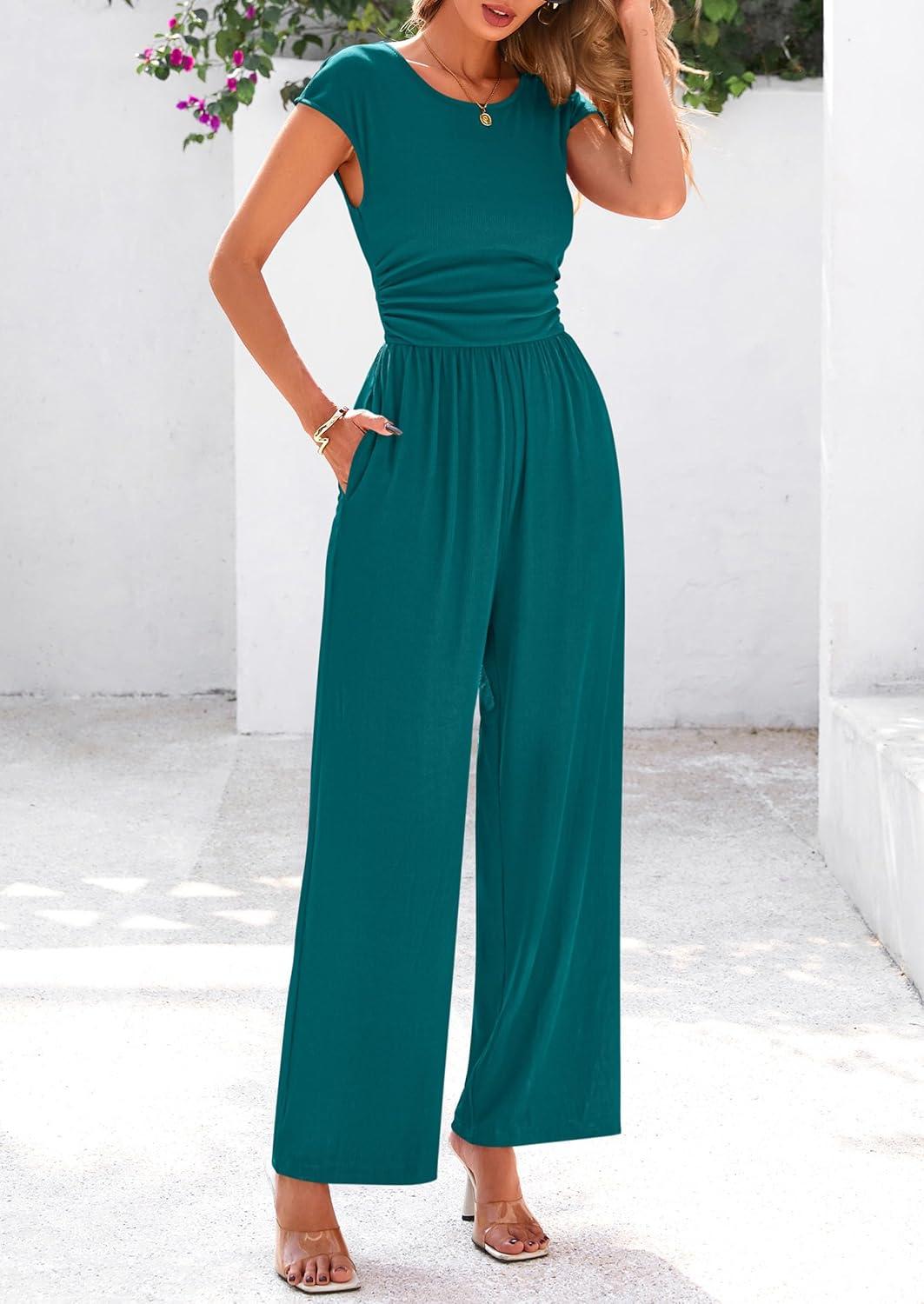 PRETTYGARDEN Summer Jumpsuits for Women Dressy 2025 Ribbed Cap Sleeve Wide Leg Pants Rompers Elegant Casual One Piece Outfits(Malachite Green)
