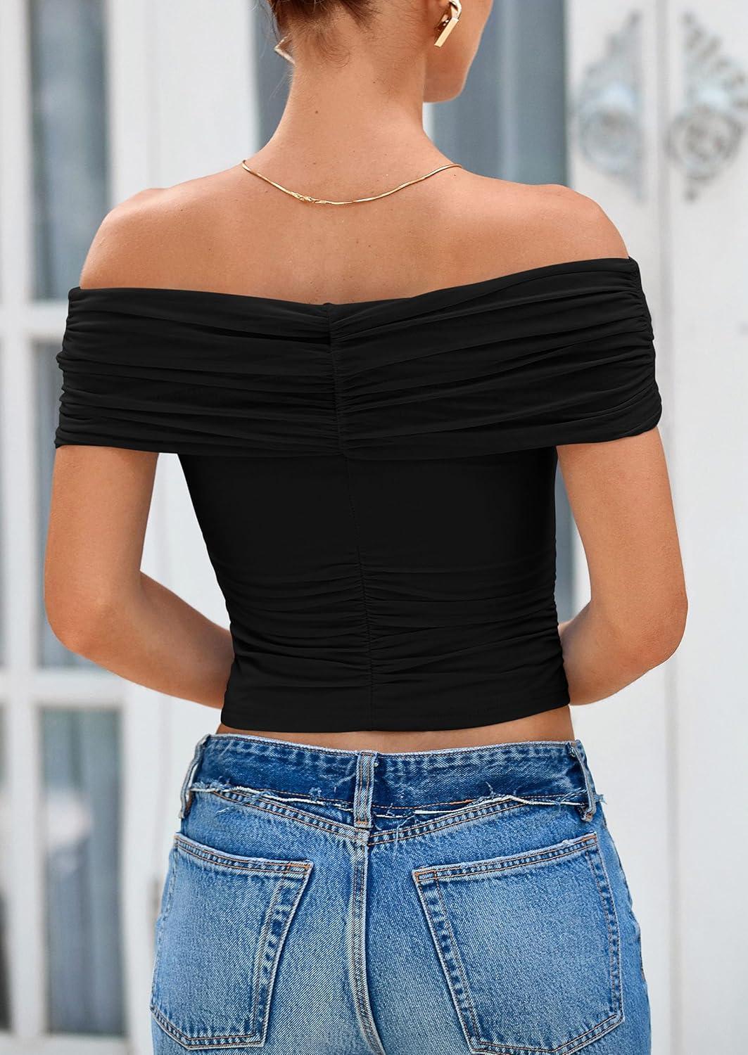 PRETTYGARDEN Summer Tops for Women 2025 Off Shoulder Short Sleeve Ruched Slim Fit Shirts Blouses Y2K Going Out Top(Black)