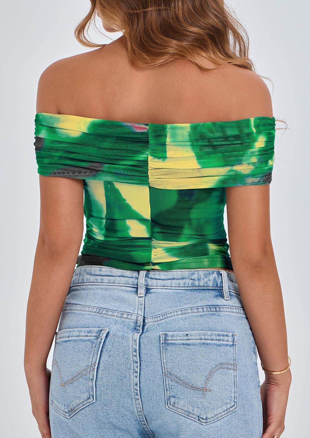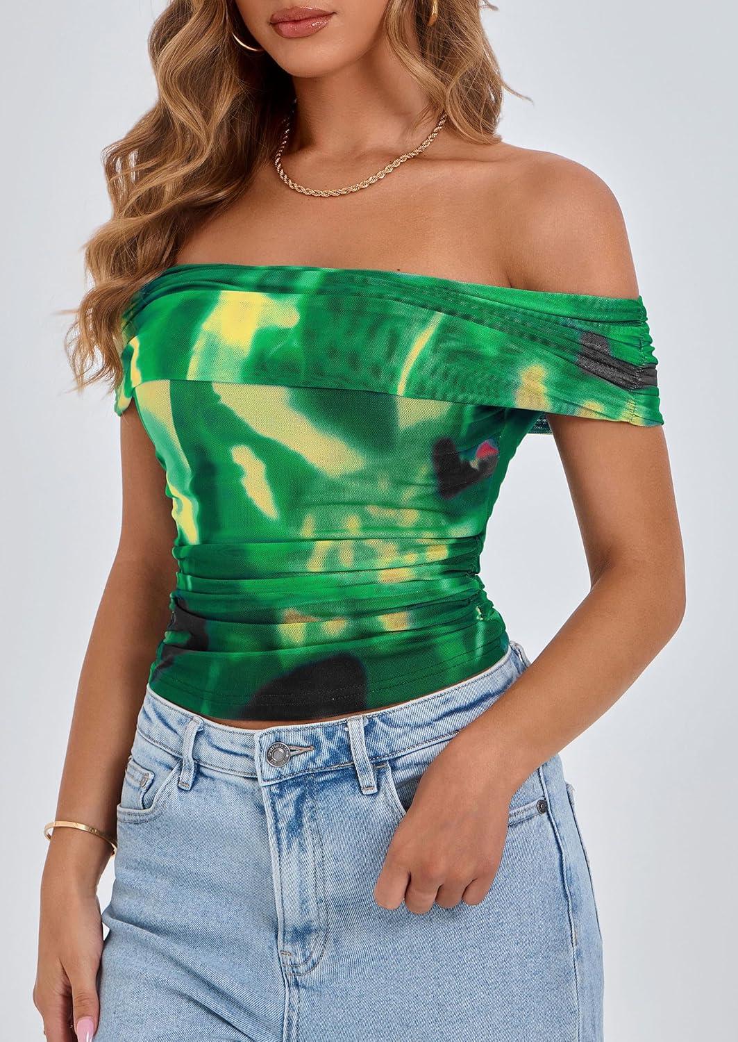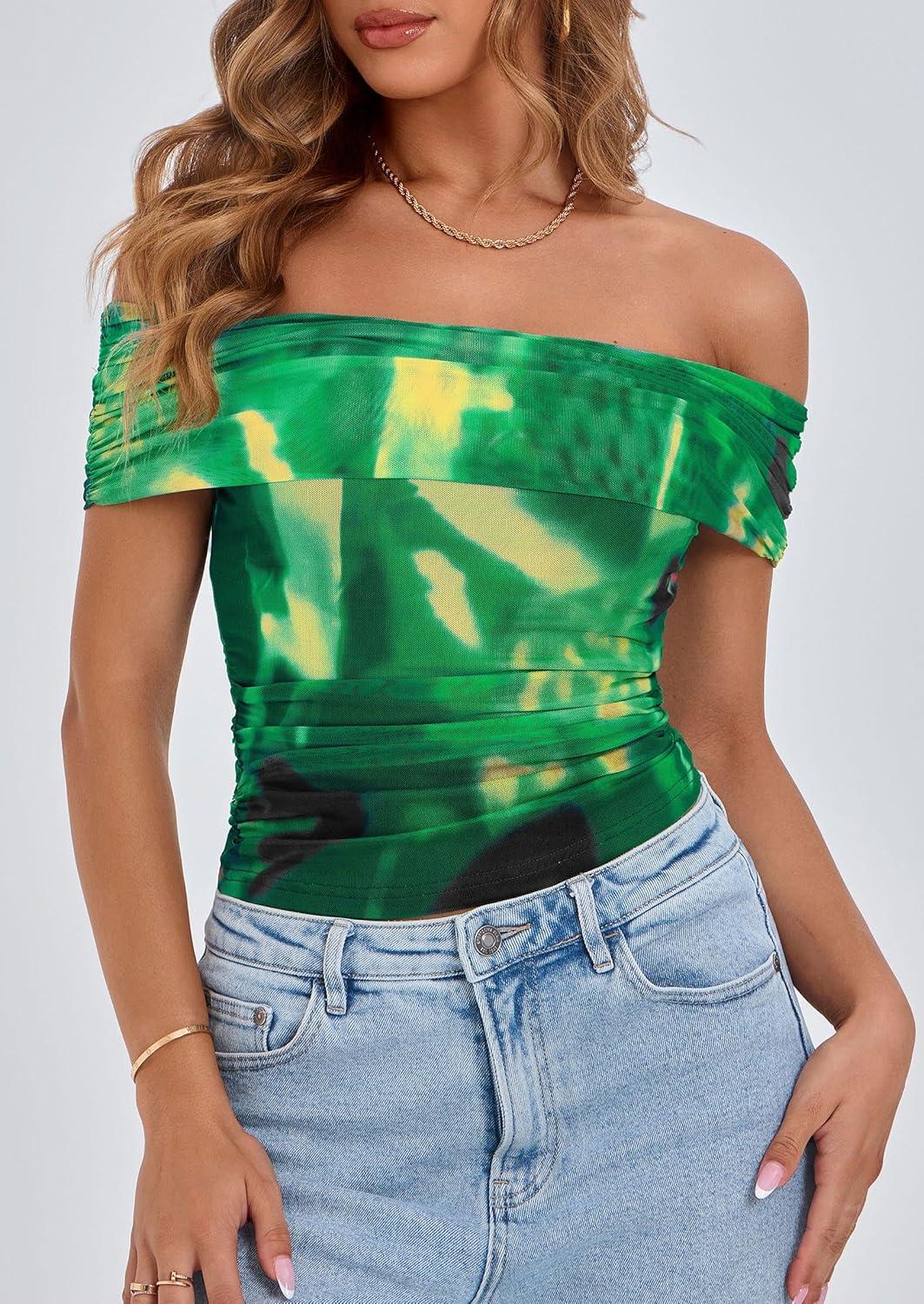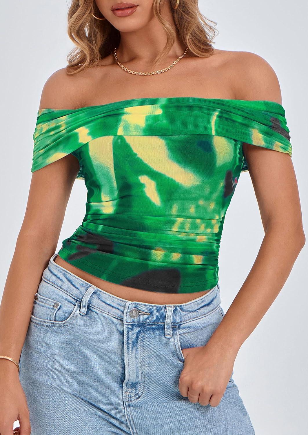PRETTYGARDEN Summer Tops for Women 2025 Off Shoulder Short Sleeve Ruched Slim Fit Shirts Blouses Y2K Going Out Top(Floral Green)