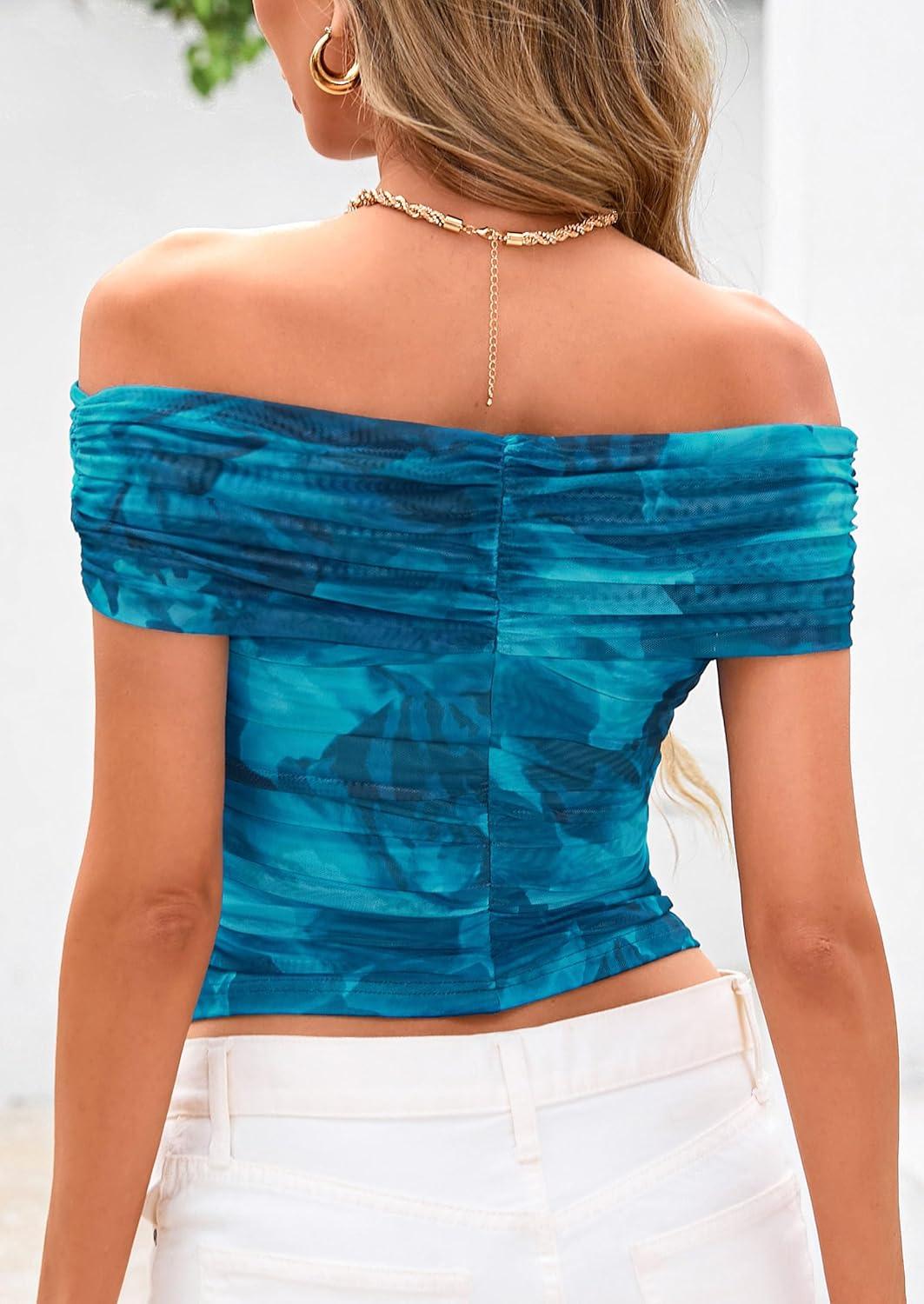 PRETTYGARDEN Summer Tops for Women 2025 Off Shoulder Short Sleeve Ruched Slim Fit Shirts Blouses Y2K Going Out Top(Floral Lake Blue)