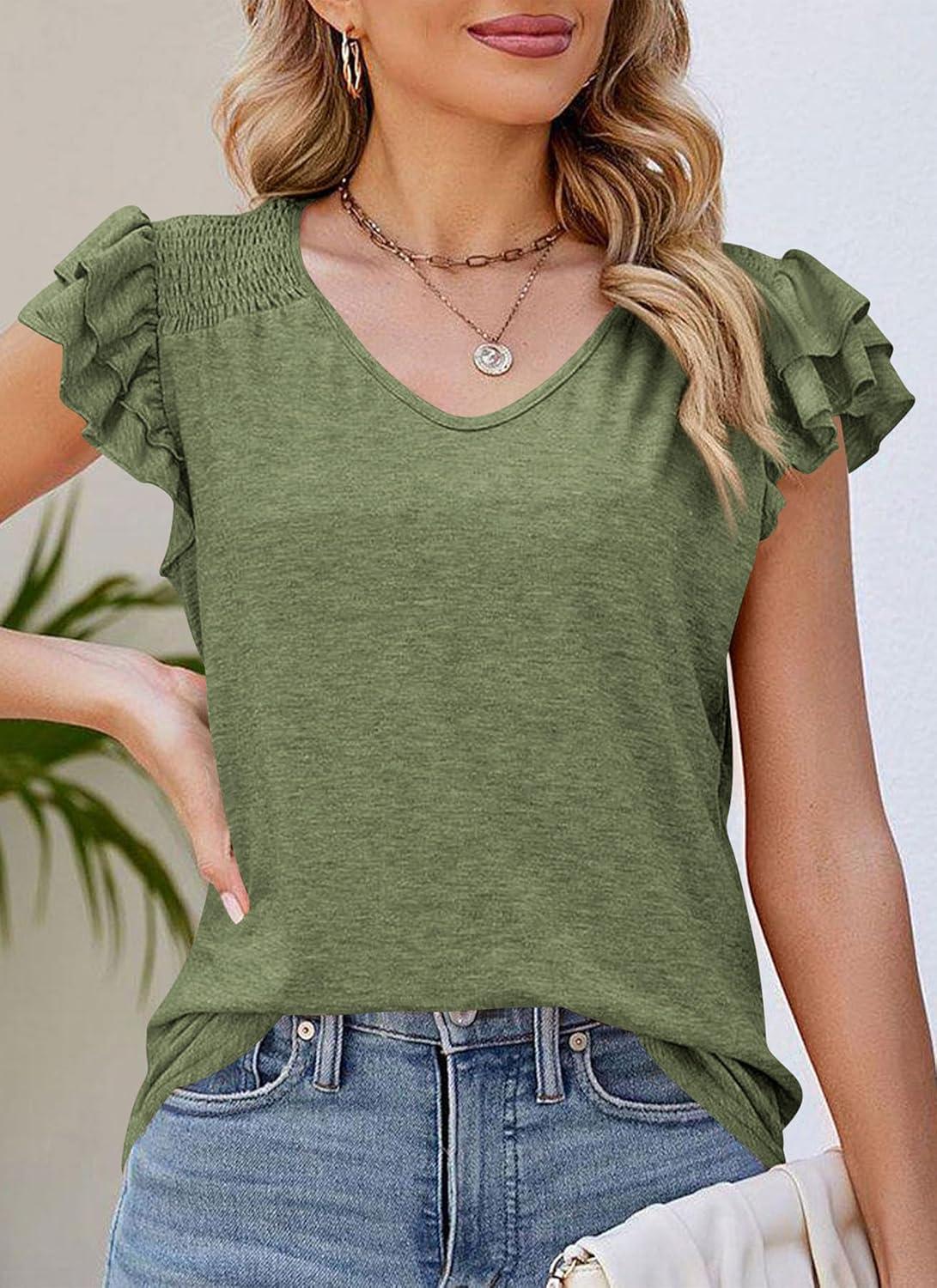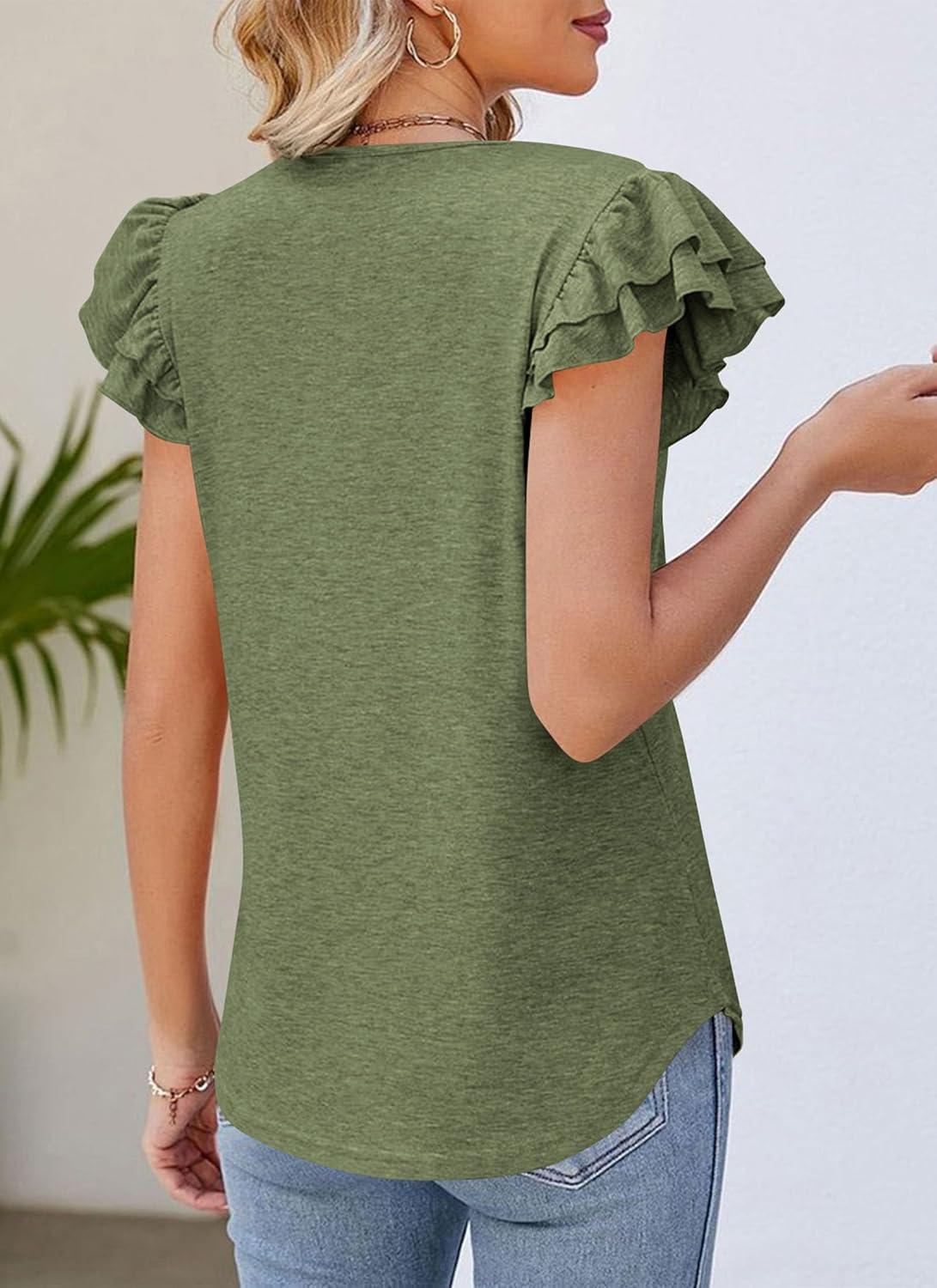 PRETTYGARDEN Summer Tops for Women 2025 Spring Trendy Fashion Clothes Casual Ruffle V Neck Short Sleeve Shirts Blouses(Army Green)