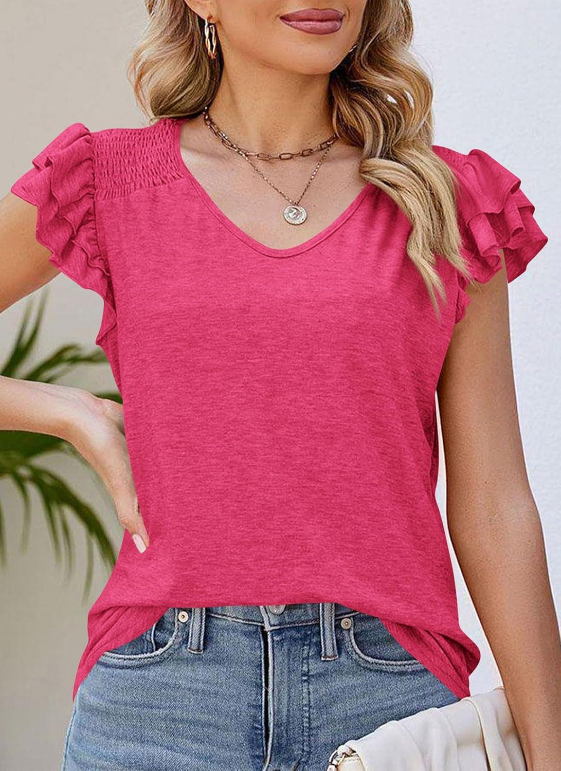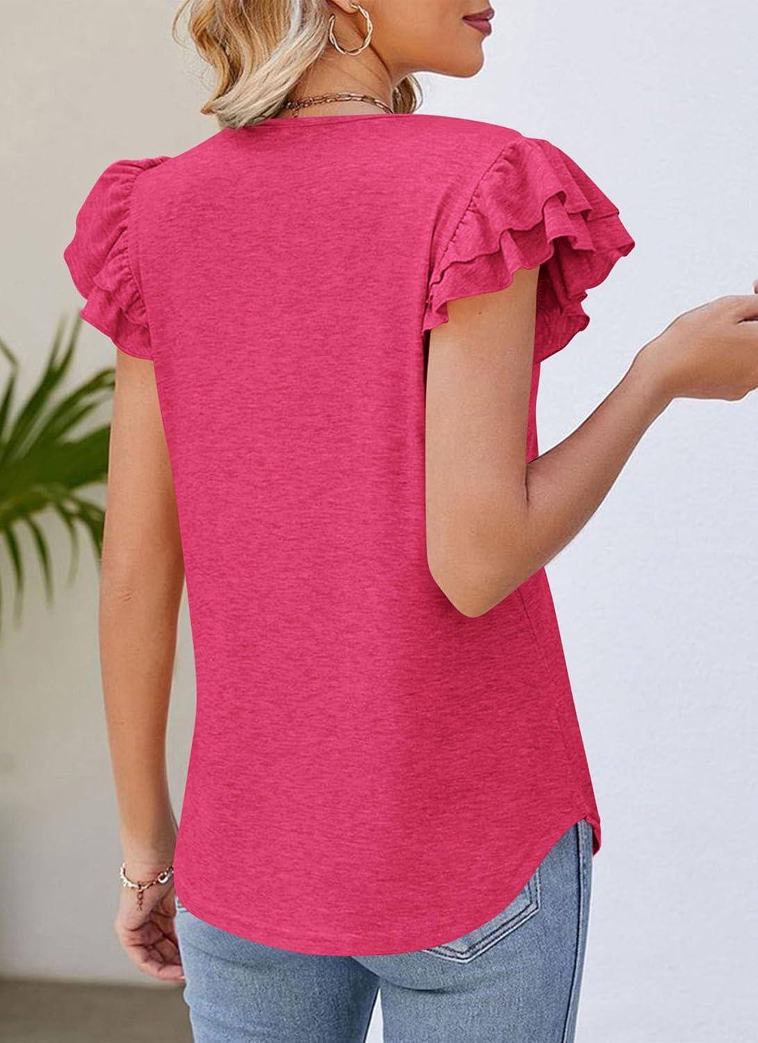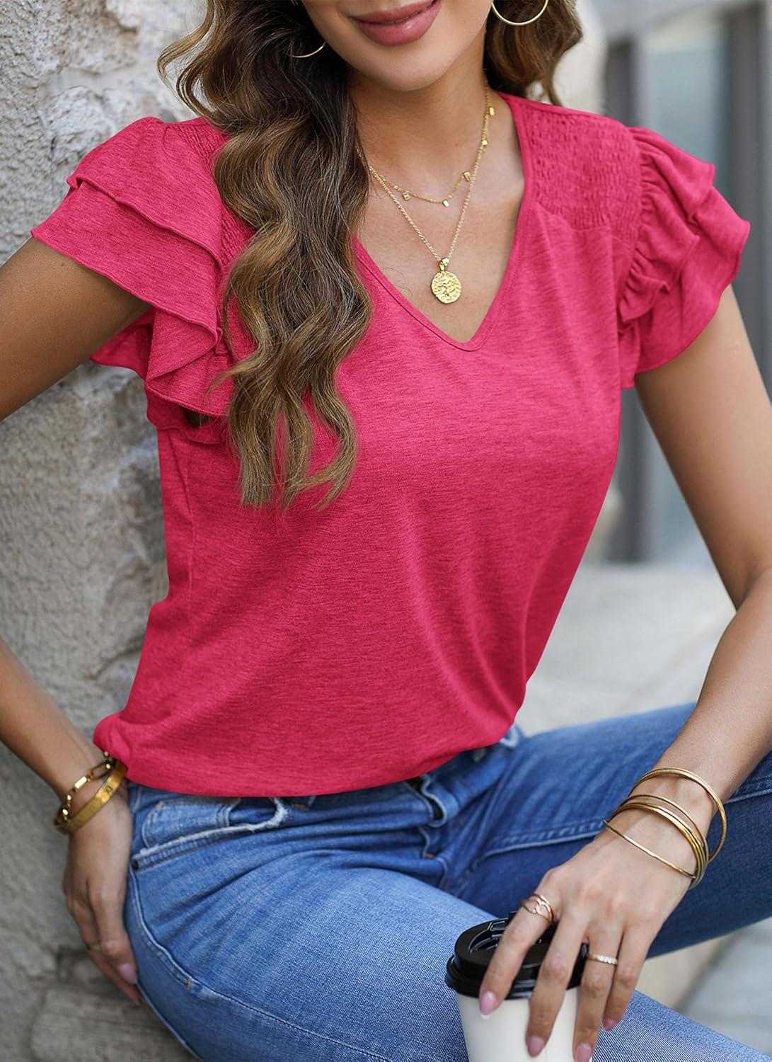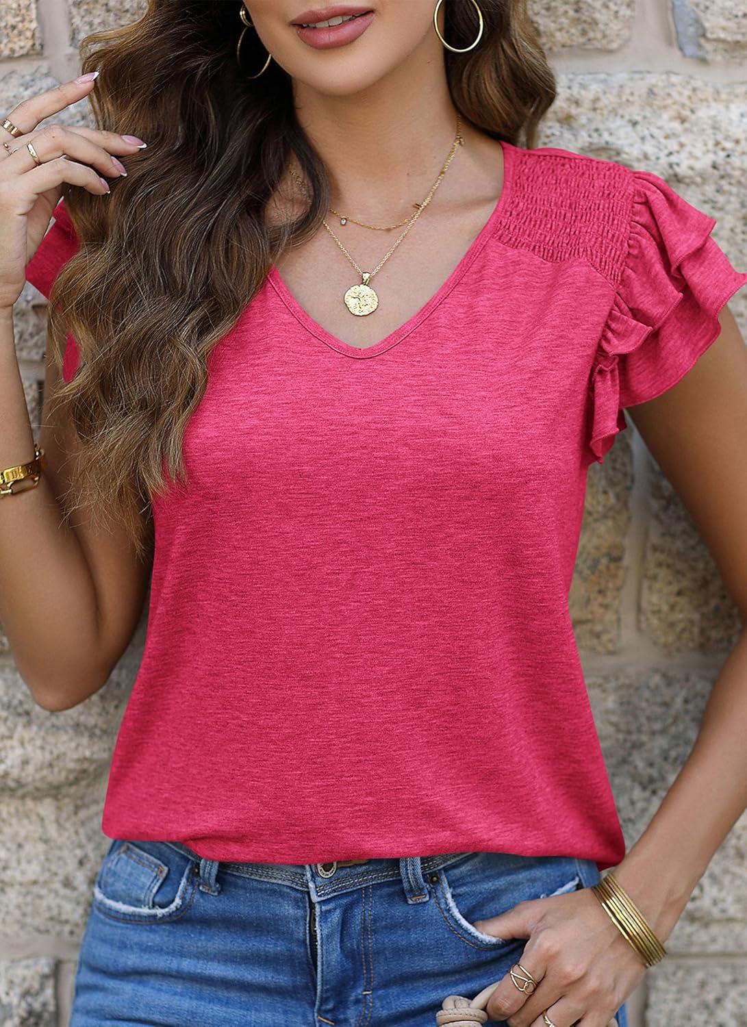 PRETTYGARDEN Summer Tops for Women 2025 Spring Trendy Fashion Clothes Casual Ruffle V Neck Short Sleeve Shirts Blouses(Rose Red)