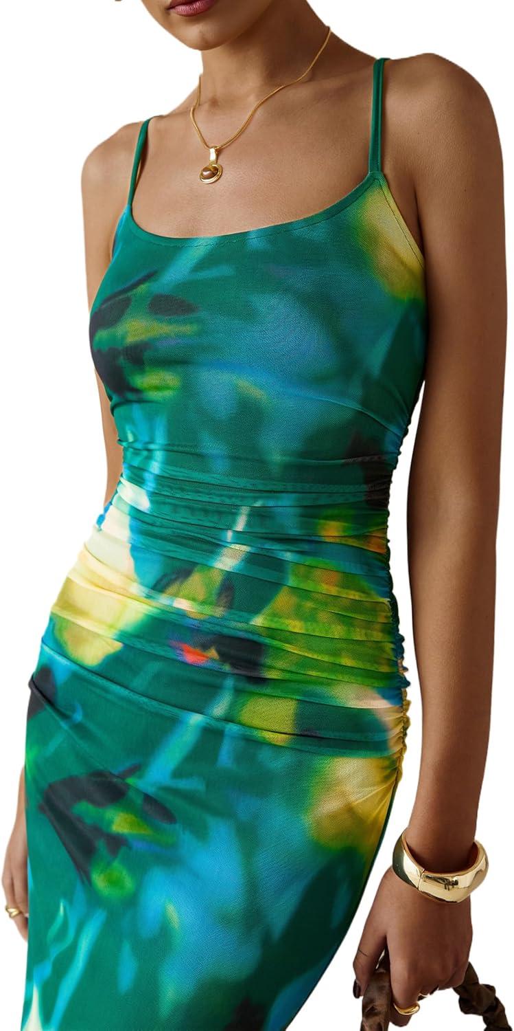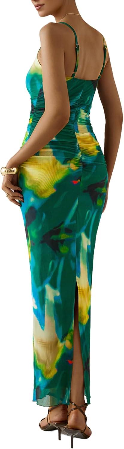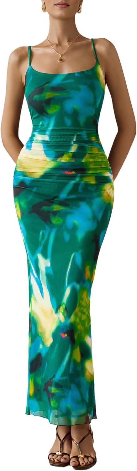 PRETTYGARDEN Summer Wedding Guest Dresses for Women 2025 Spaghetti Strap Mesh Bodycon Beach Floral Maxi Long Dresses(Floral Green)