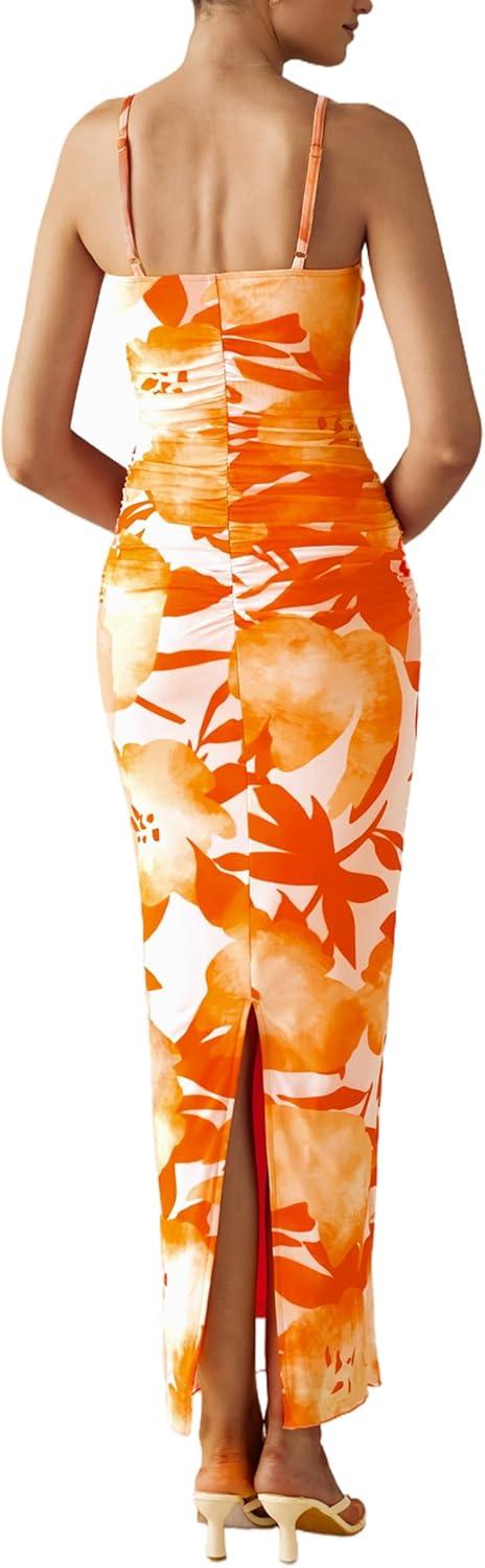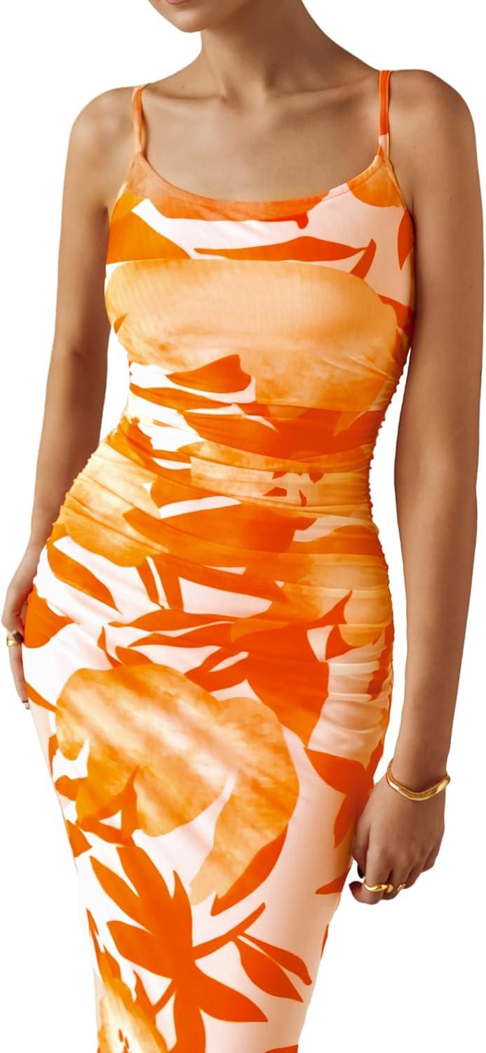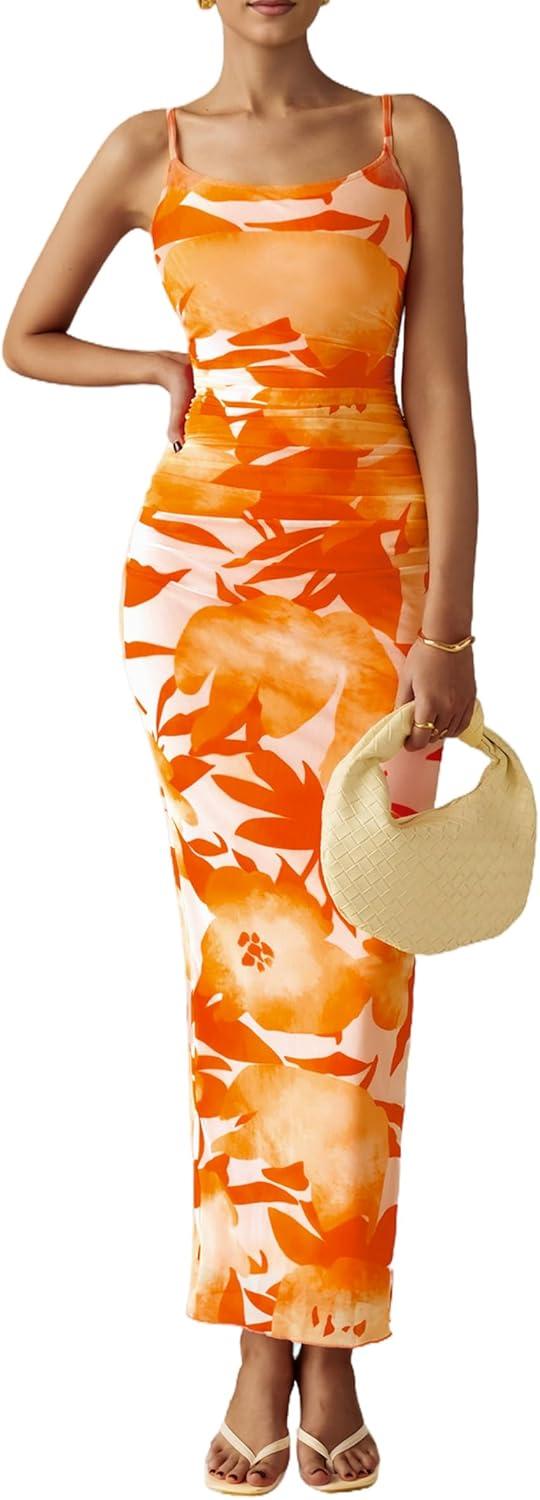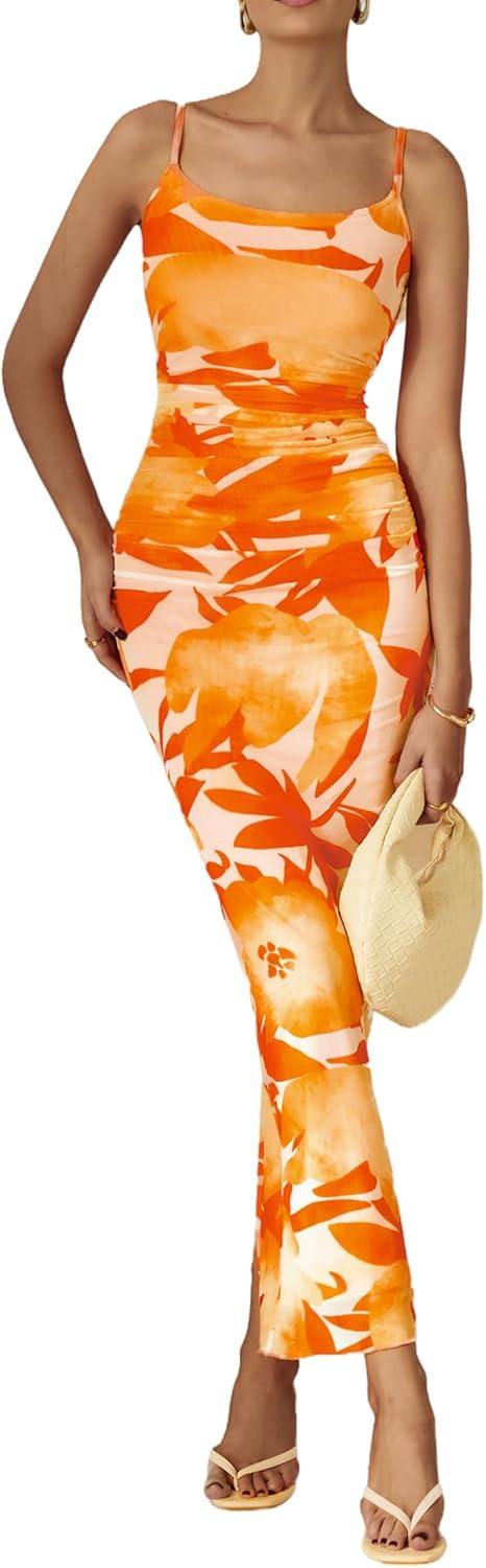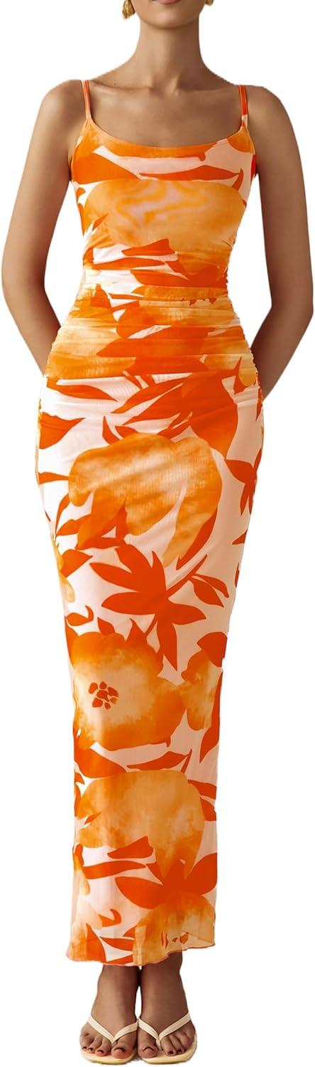PRETTYGARDEN Summer Wedding Guest Dresses for Women 2025 Spaghetti Strap Mesh Bodycon Beach Floral Maxi Long Dresses(Floral Light Orange)