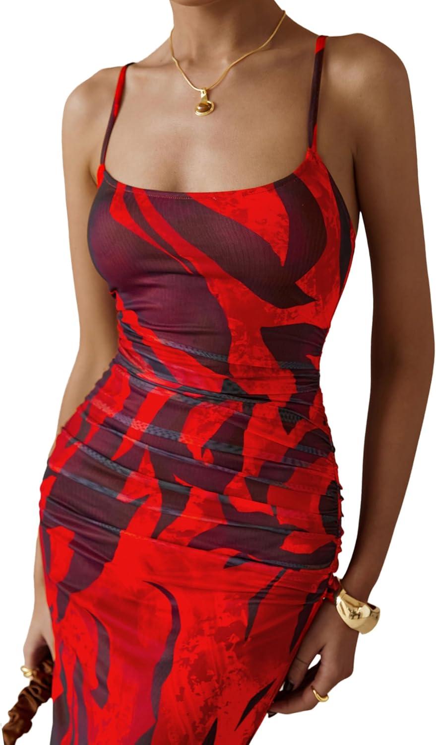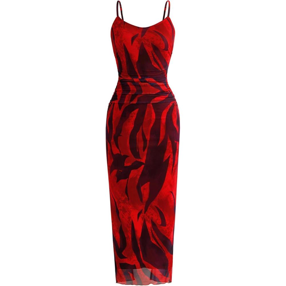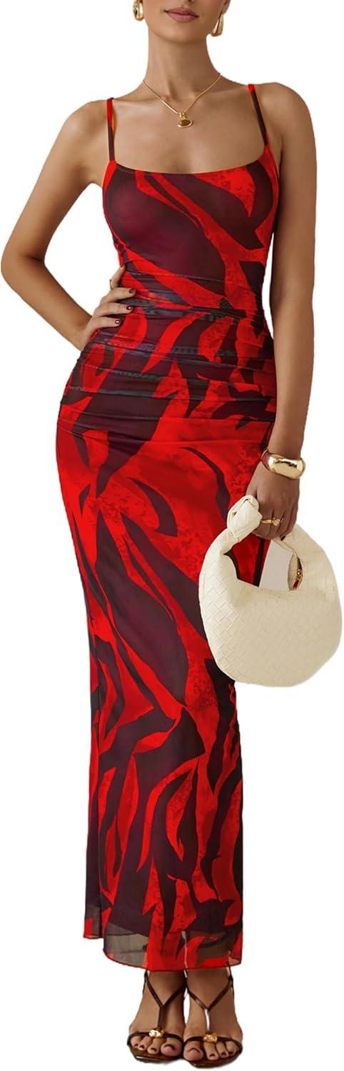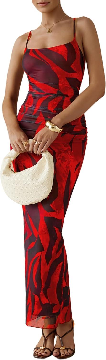 PRETTYGARDEN Summer Wedding Guest Dresses for Women 2025 Spaghetti Strap Mesh Bodycon Beach Floral Maxi Long Dresses(Floral Red)