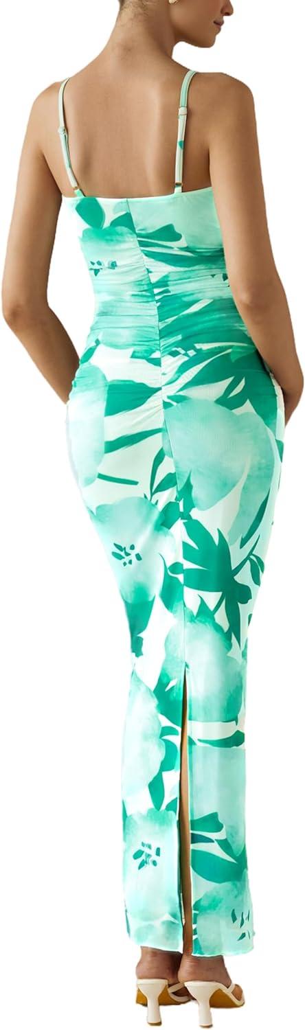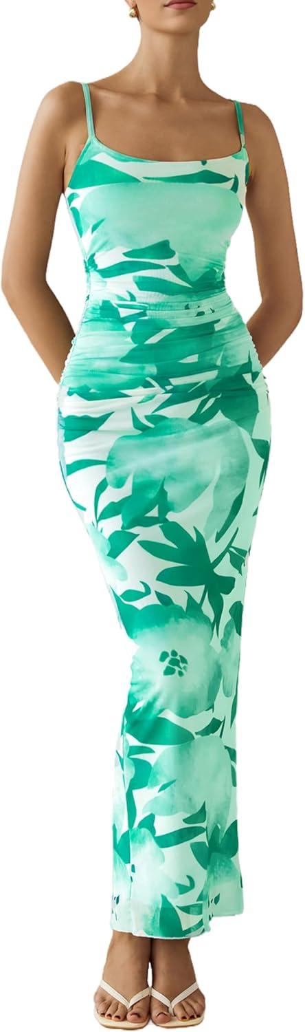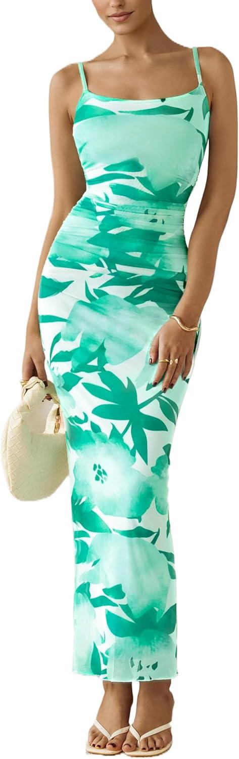 PRETTYGARDEN Summer Wedding Guest Dresses for Women 2025 Spaghetti Strap Mesh Bodycon Beach Floral Maxi Long Dresses(Floral White Light Green)