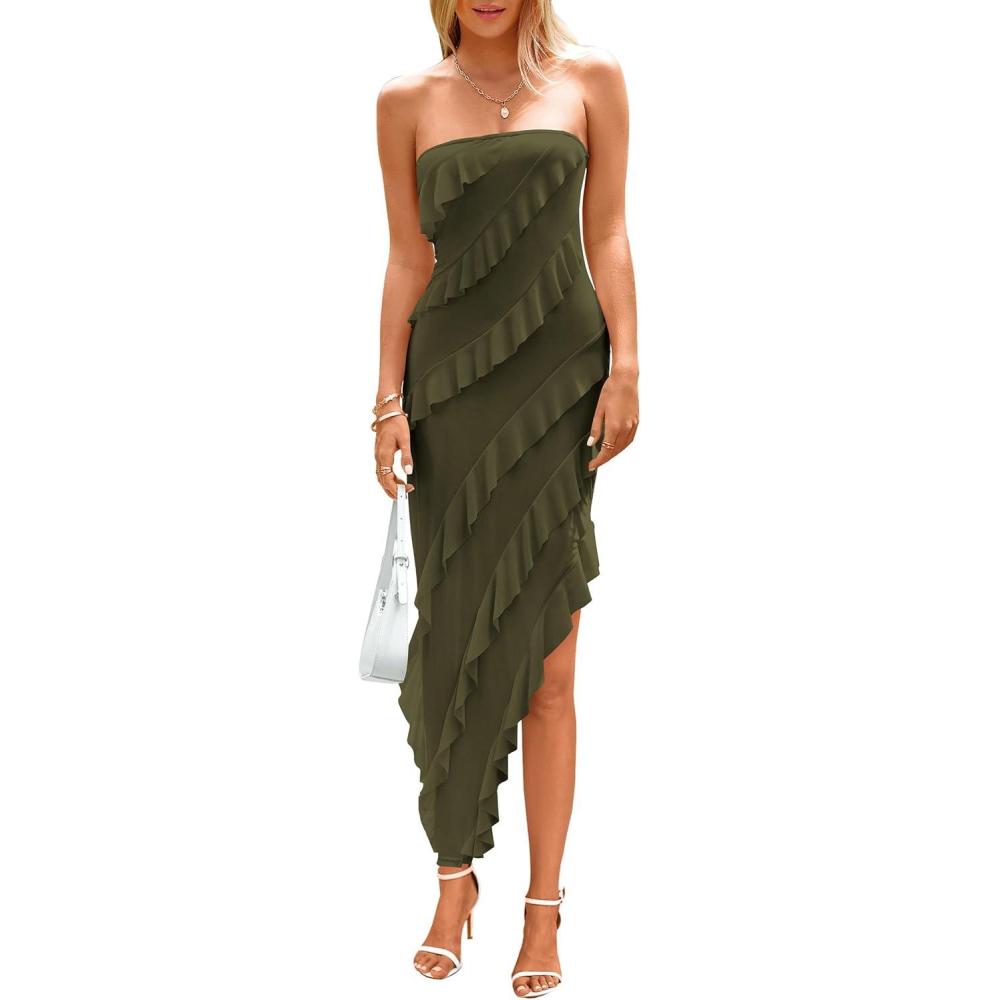 PRETTYGARDEN Summer Wedding Guest Dresses for Women 2025 Strapless Tube Ruffle Elegant Dinner Cocktail Long Dress(Army Green)