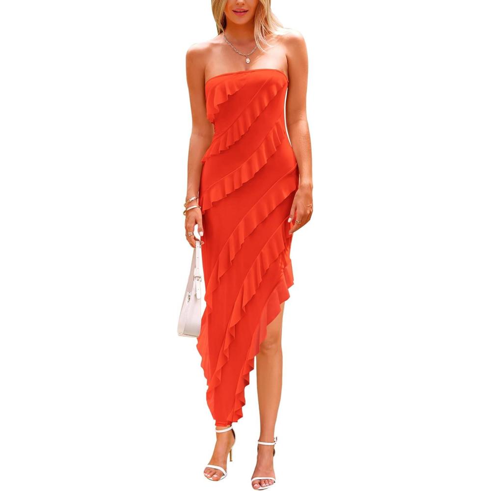 PRETTYGARDEN Summer Wedding Guest Dresses for Women 2025 Strapless Tube Ruffle Elegant Dinner Cocktail Long Dress(Orange)