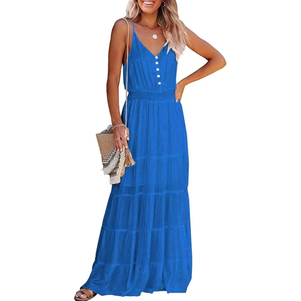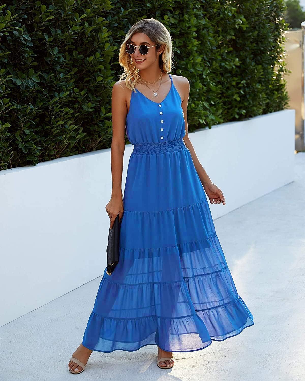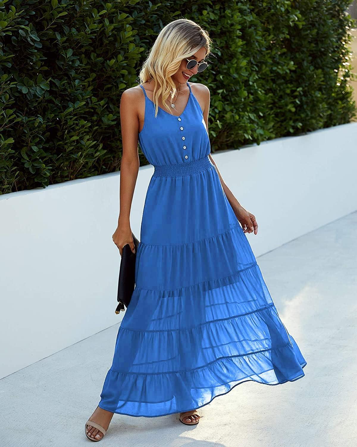 PRETTYGARDEN Sundress for Women 2025 Summer Spaghetti Strap Sleeveless High Waist Beach Long Maxi Dresses(Lake Blue)