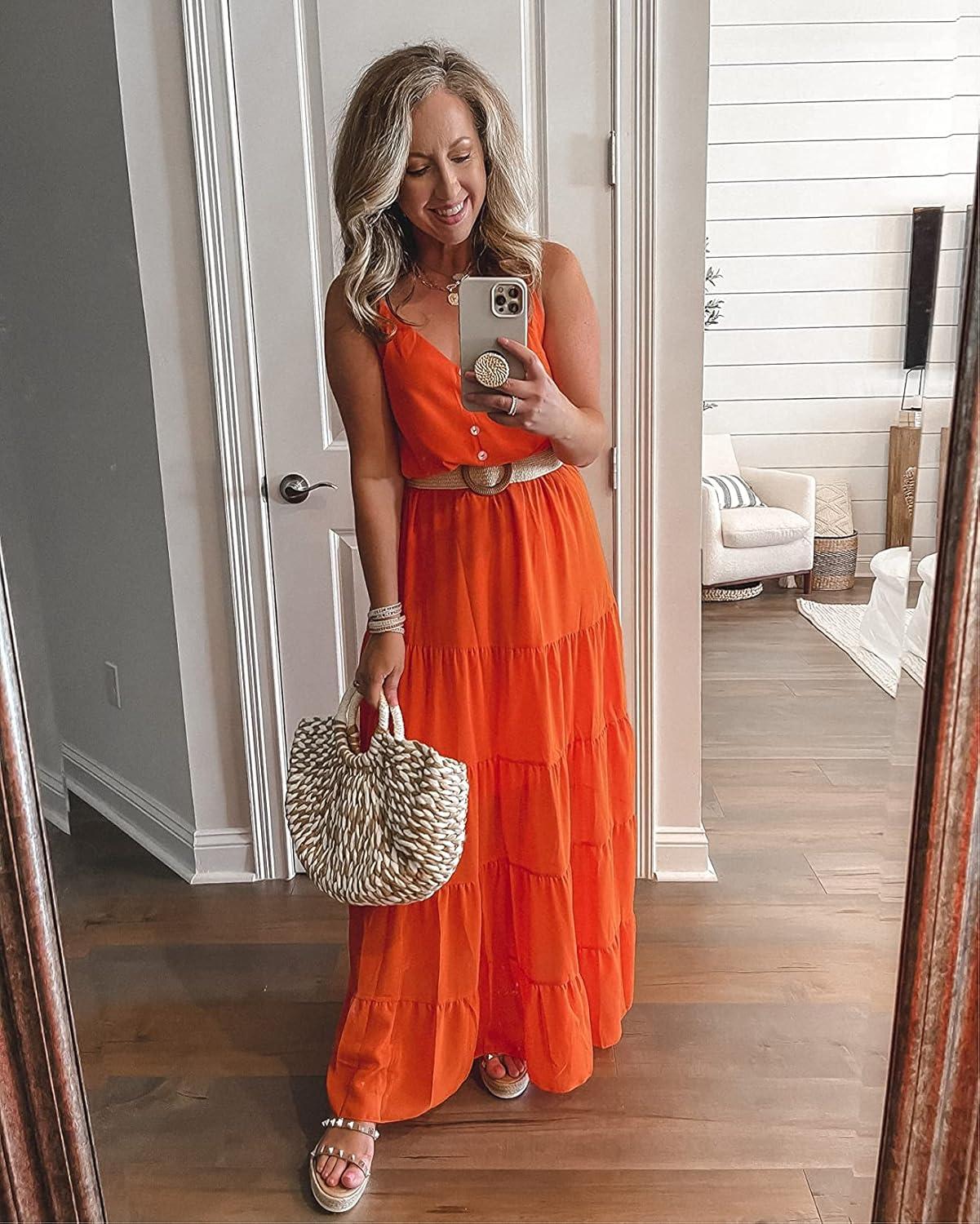 PRETTYGARDEN Sundress for Women 2025 Summer Spaghetti Strap Sleeveless High Waist Beach Long Maxi Dresses(Orange)