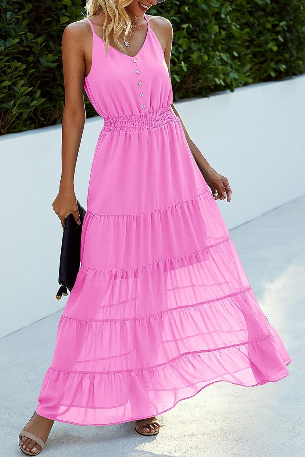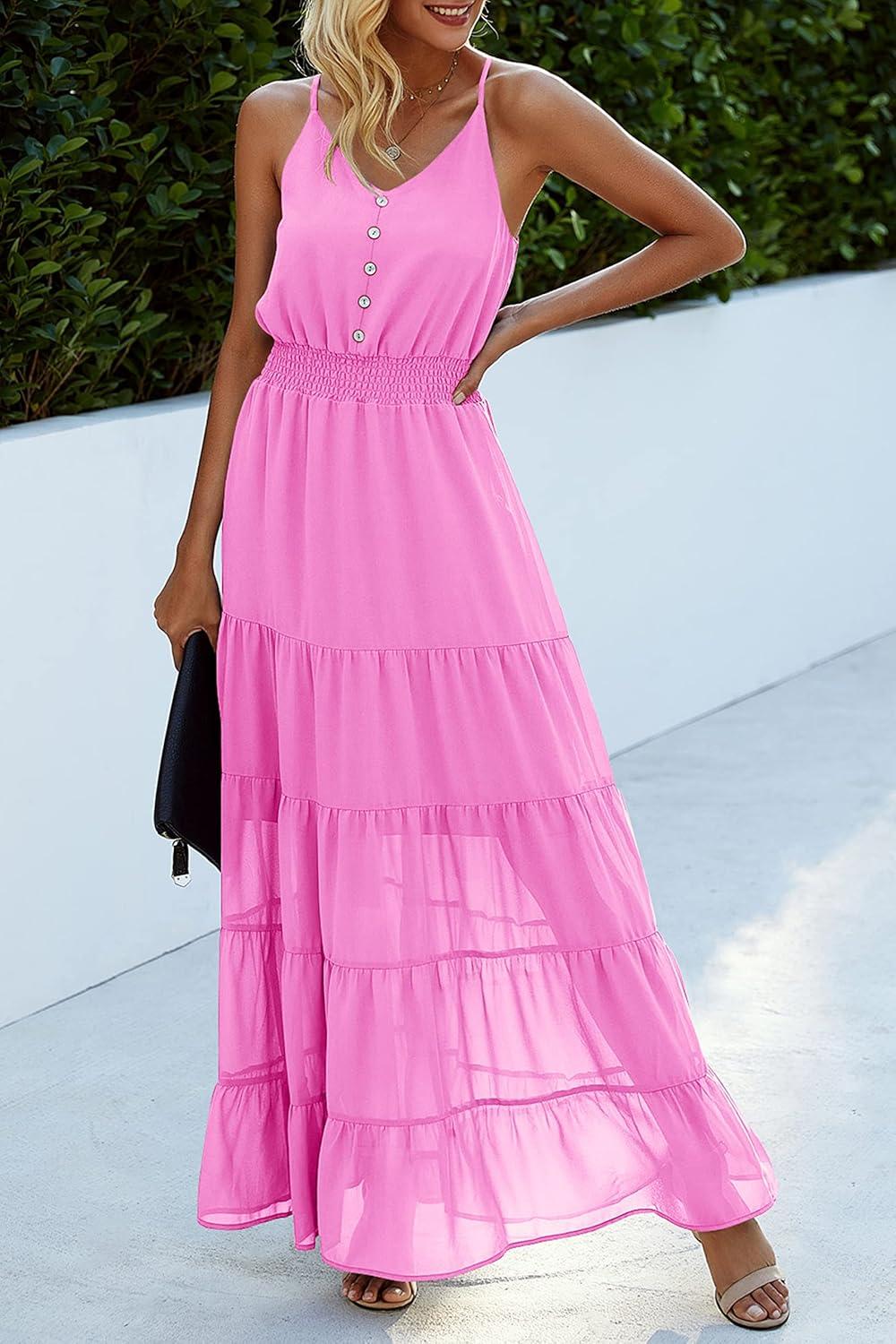 PRETTYGARDEN Sundress for Women 2025 Summer Spaghetti Strap Sleeveless High Waist Beach Long Maxi Dresses(Rose Pink)
