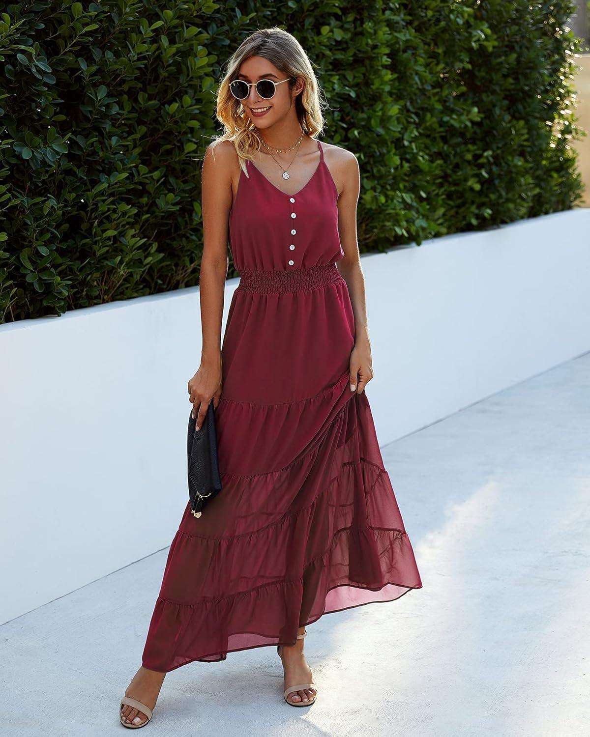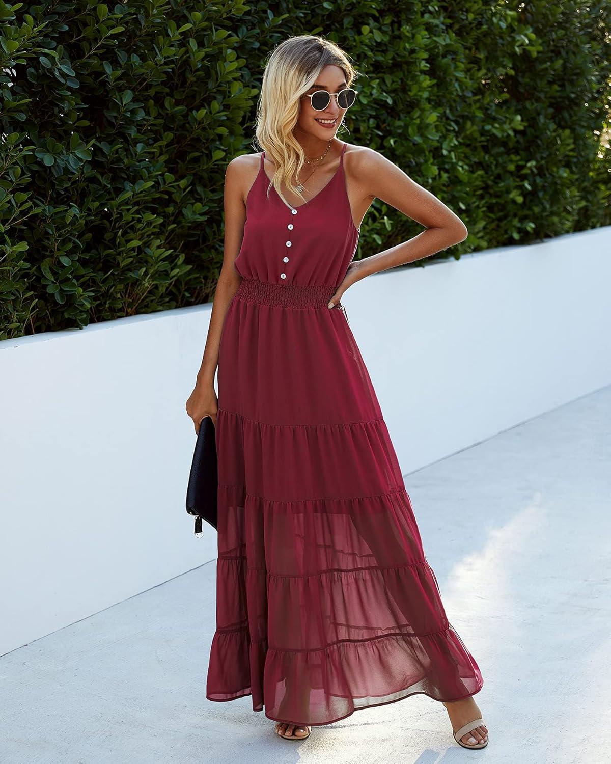 PRETTYGARDEN Sundress for Women 2025 Summer Spaghetti Strap Sleeveless High Waist Beach Long Maxi Dresses(Wine Red)