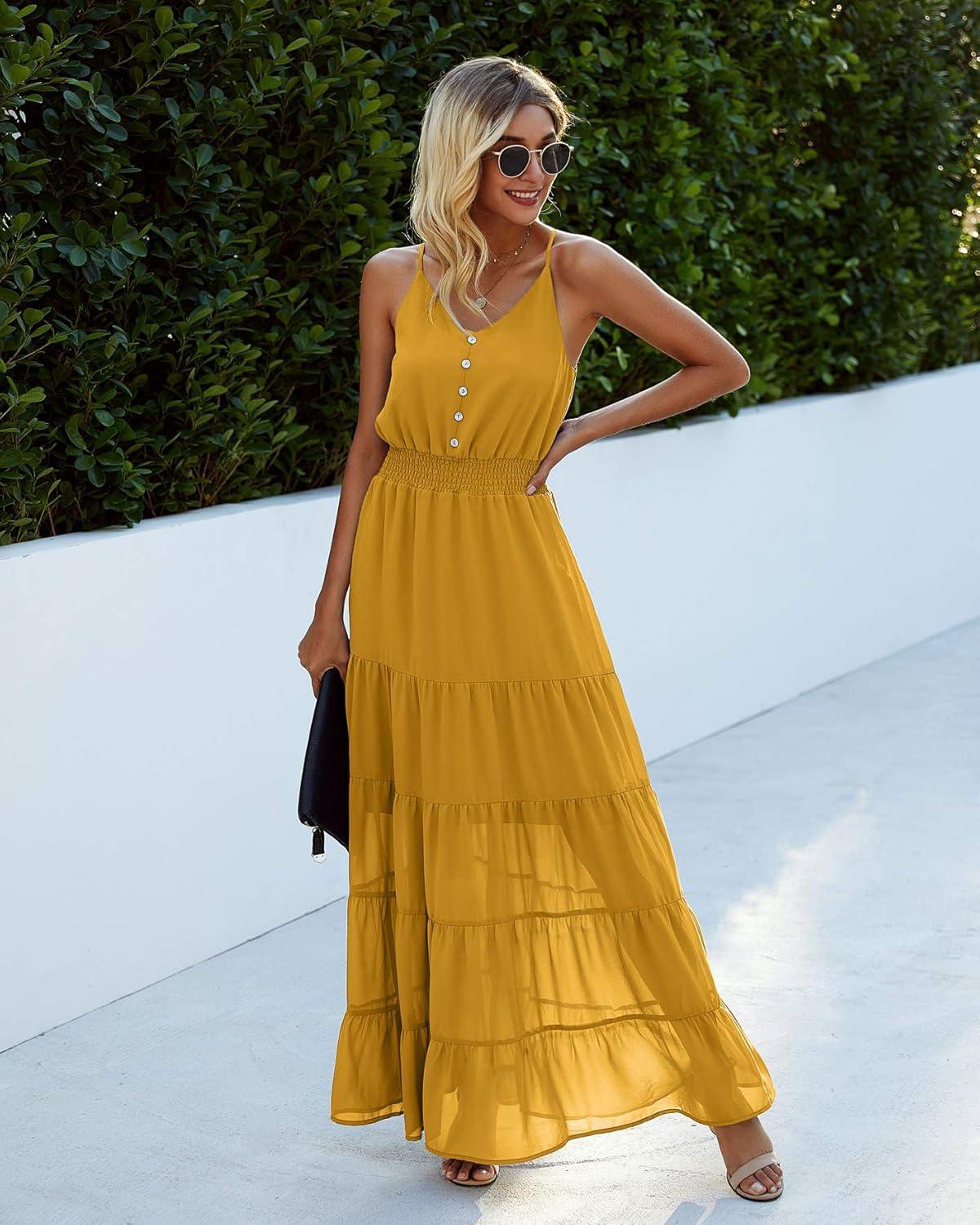 PRETTYGARDEN Sundress for Women 2025 Summer Spaghetti Strap Sleeveless High Waist Beach Long Maxi Dresses(Yellow)
