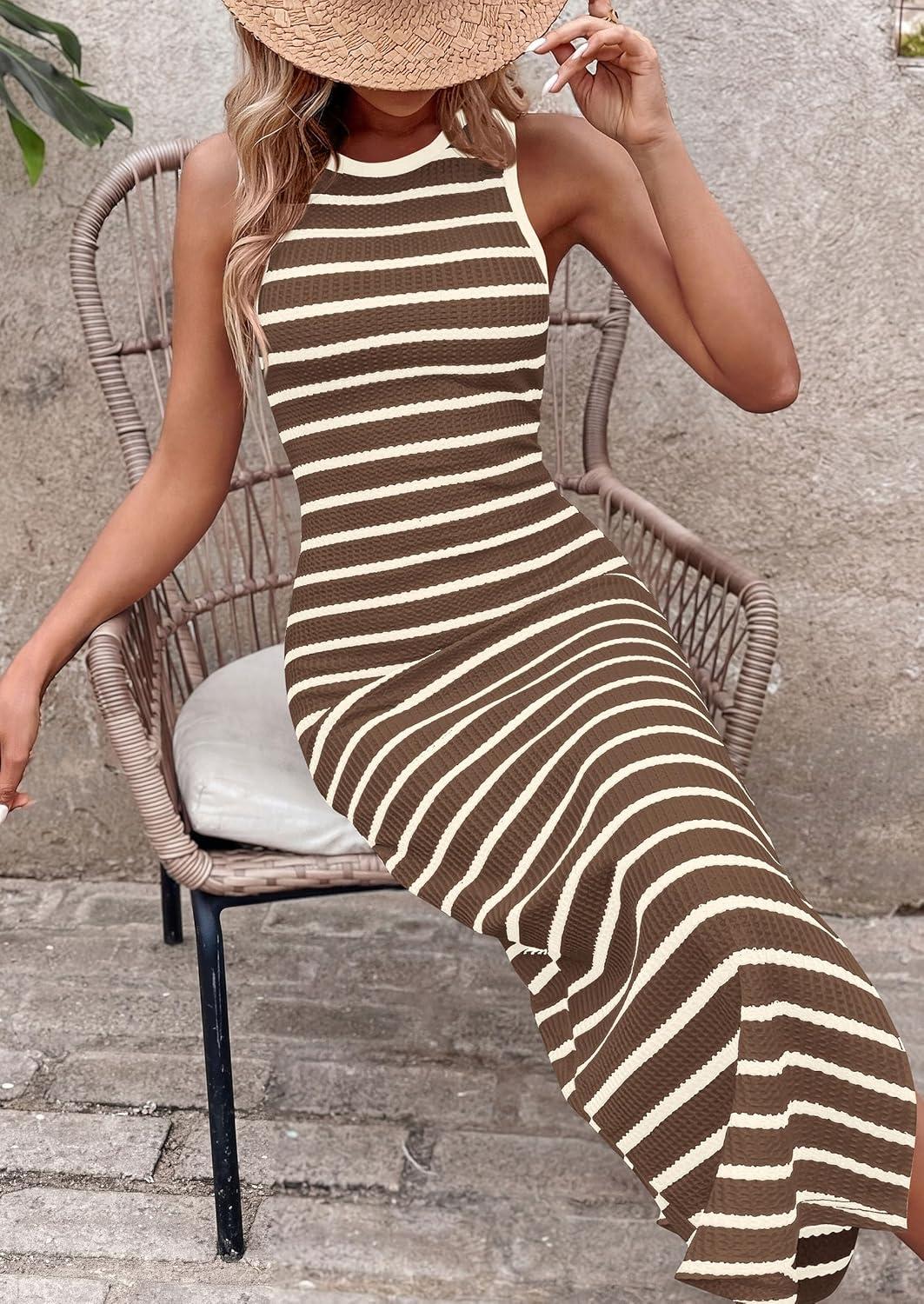 PRETTYGARDEN Sundresses for Women 2026 Summer Striped Knit Side Slit Spring Fashion Bodycon Maxi Dress Beach Vacation Clothes(Brown)