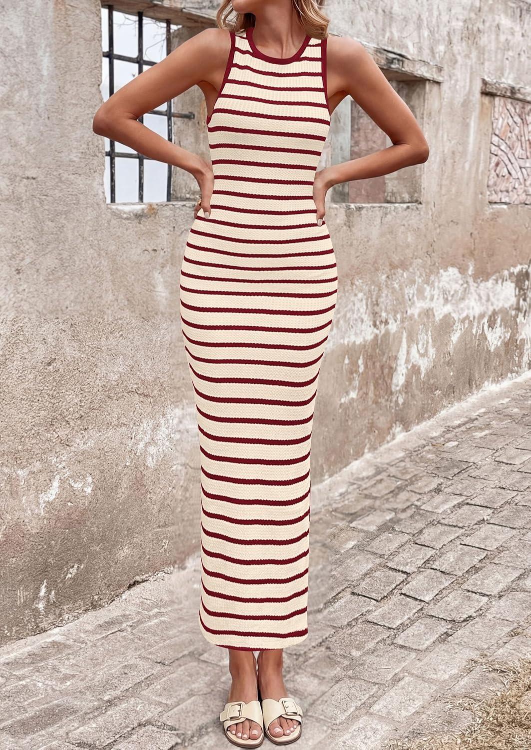 PRETTYGARDEN Sundresses for Women 2026 Summer Striped Knit Side Slit Spring Fashion Bodycon Maxi Dress Beach Vacation Clothes(Red)