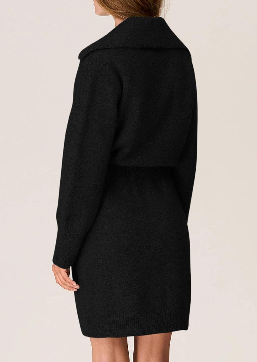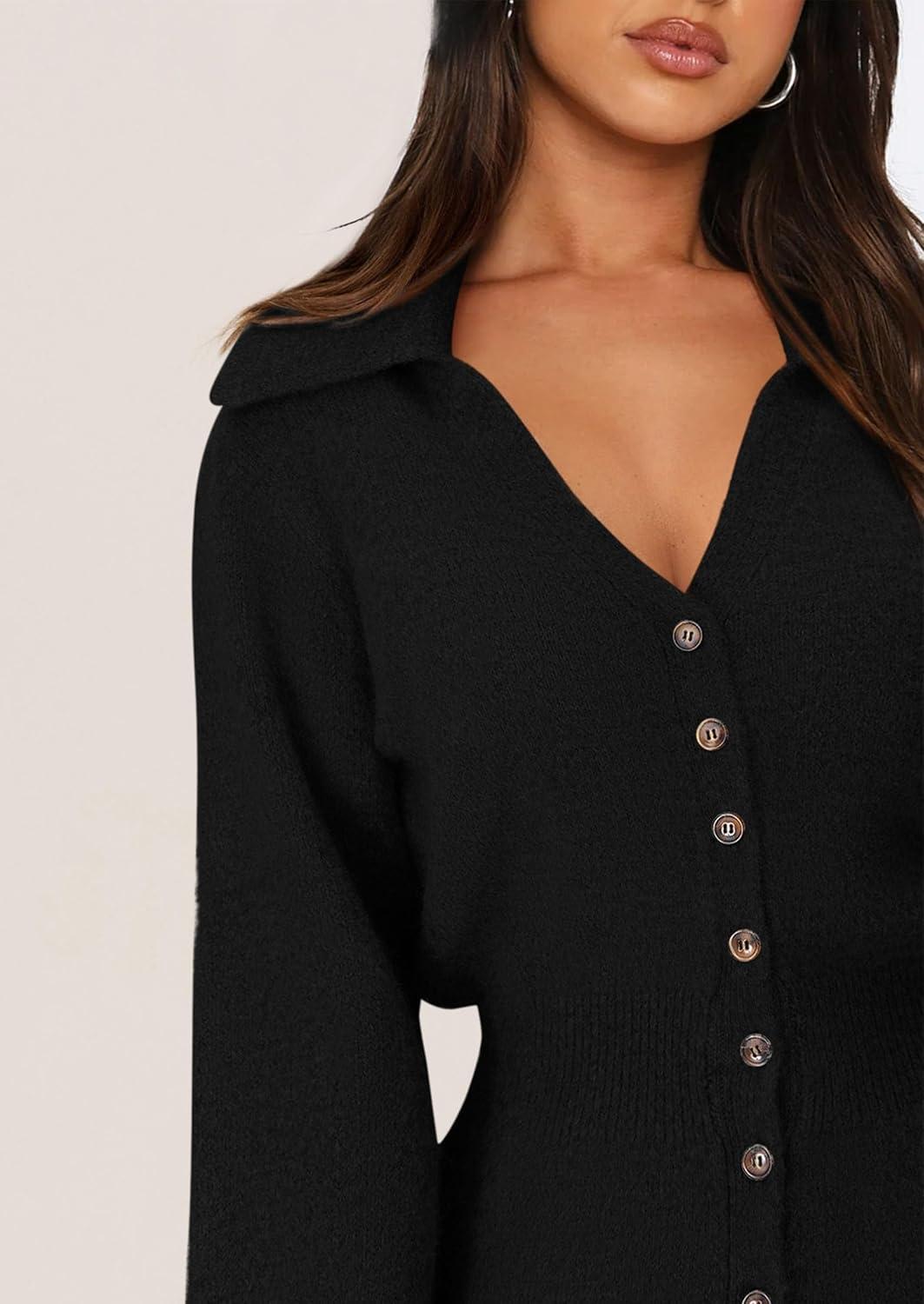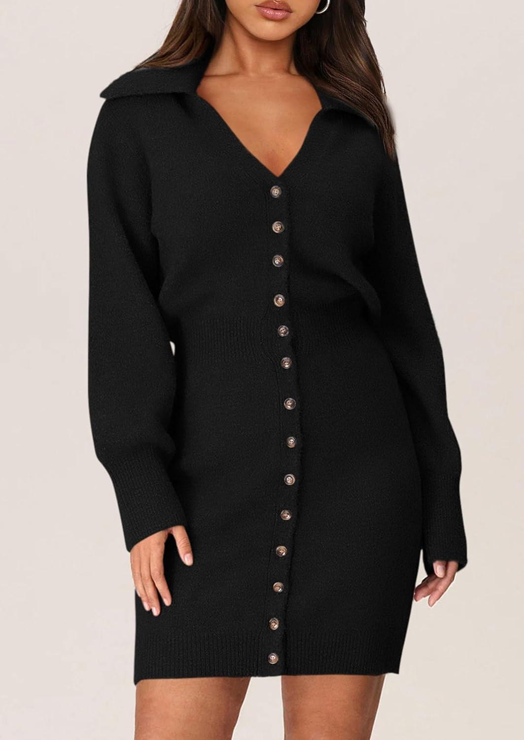 PRETTYGARDEN Sweater Dresses for Women 2025 Trendy Long Sleeve Button Down Short Mini Fall Winter Dress(Black)