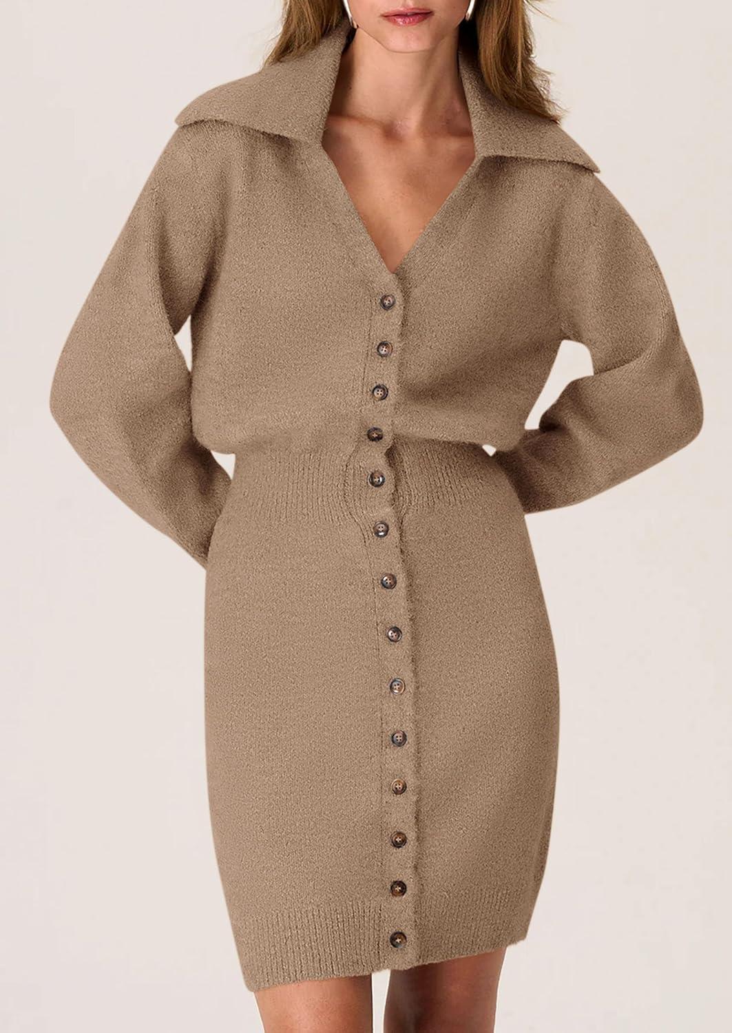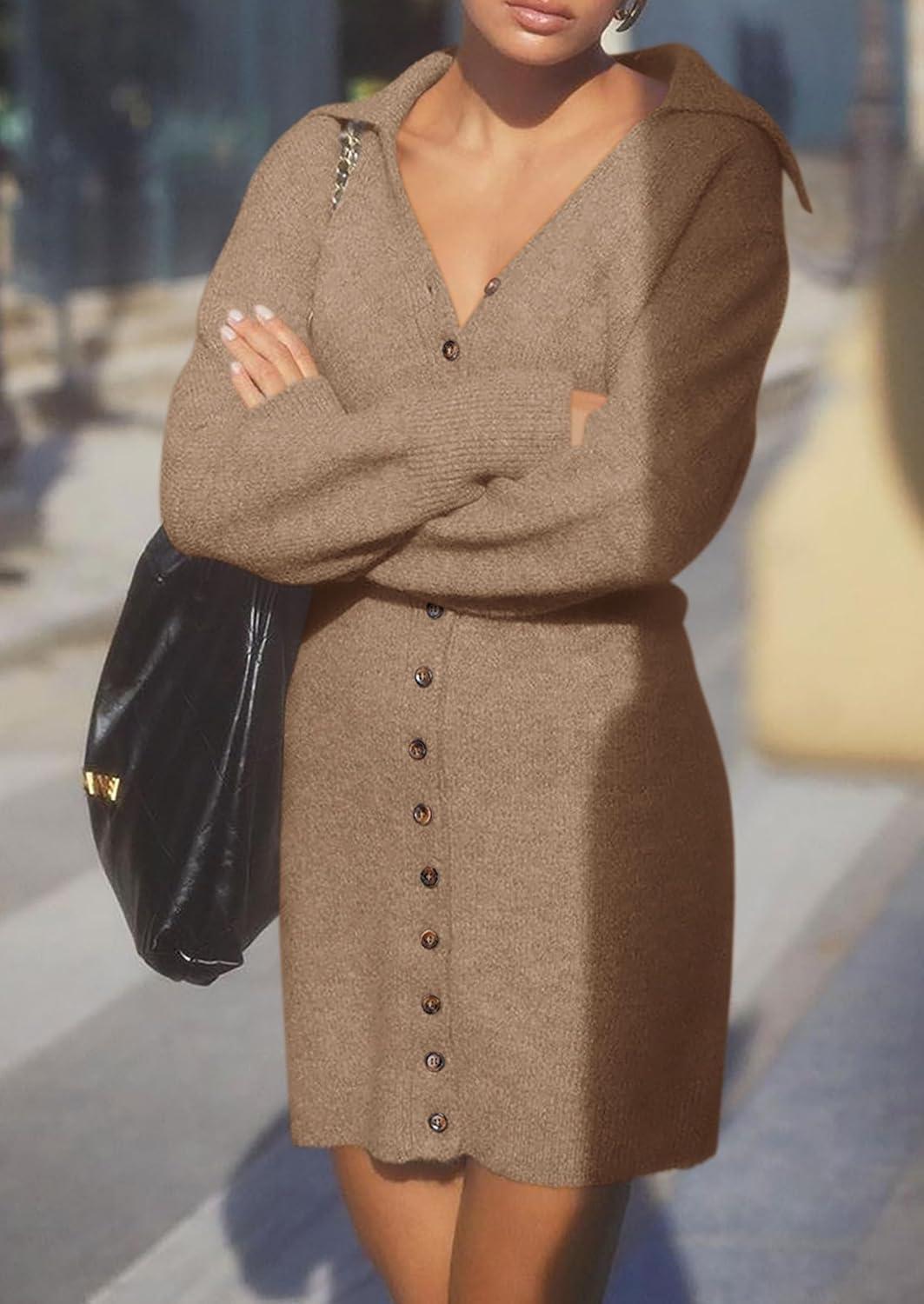 PRETTYGARDEN Sweater Dresses for Women 2025 Trendy Long Sleeve Button Down Short Mini Fall Winter Dress(Coffee)