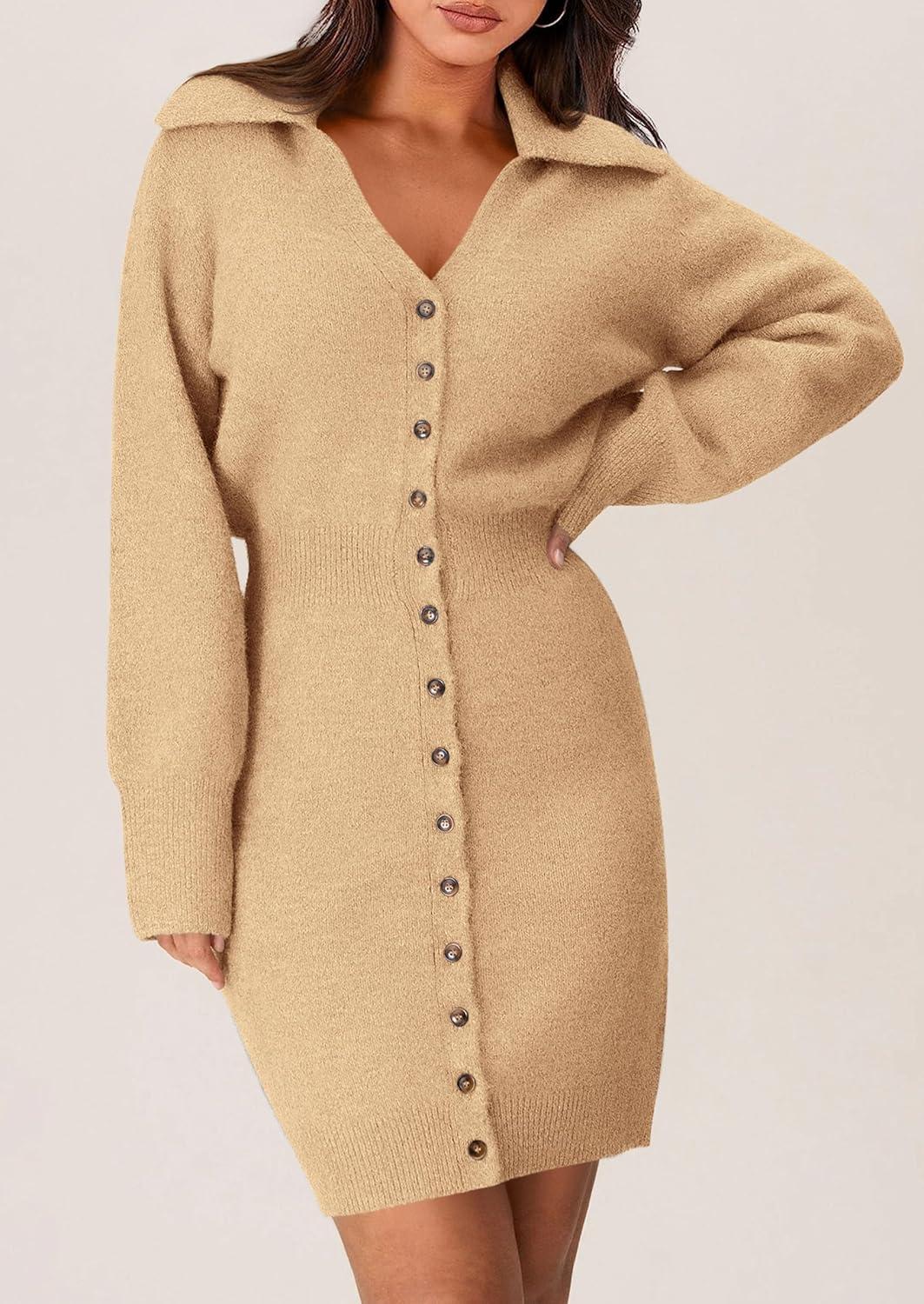 PRETTYGARDEN Sweater Dresses for Women 2025 Trendy Long Sleeve Button Down Short Mini Fall Winter Dress(Khaki)