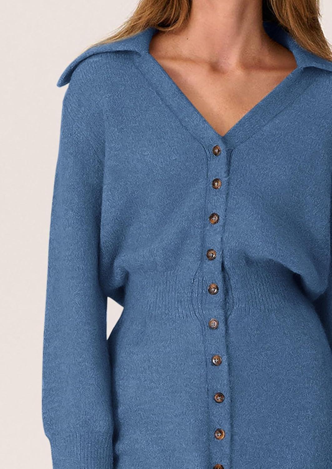 PRETTYGARDEN Sweater Dresses for Women 2025 Trendy Long Sleeve Button Down Short Mini Fall Winter Dress(Mist Blue)