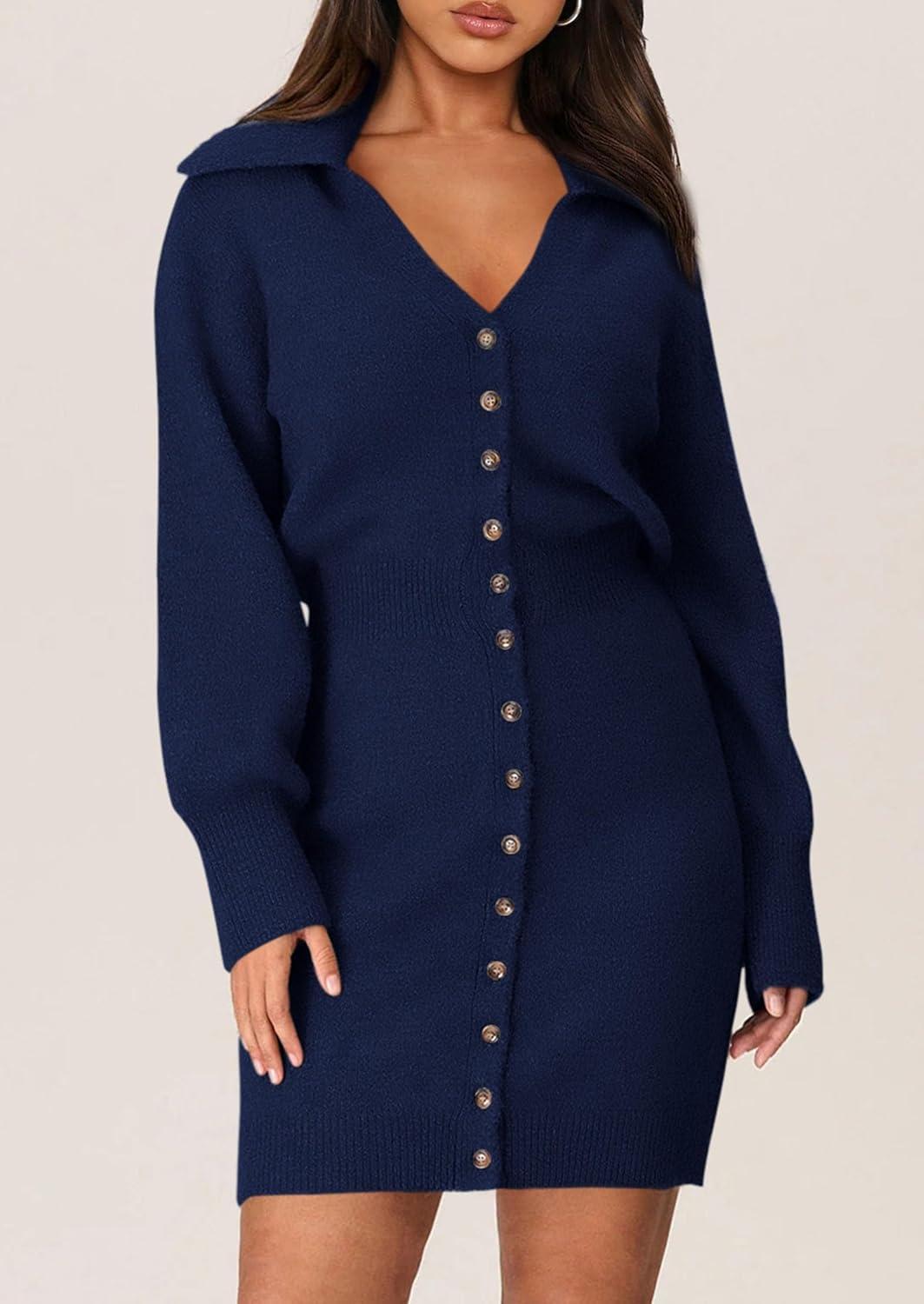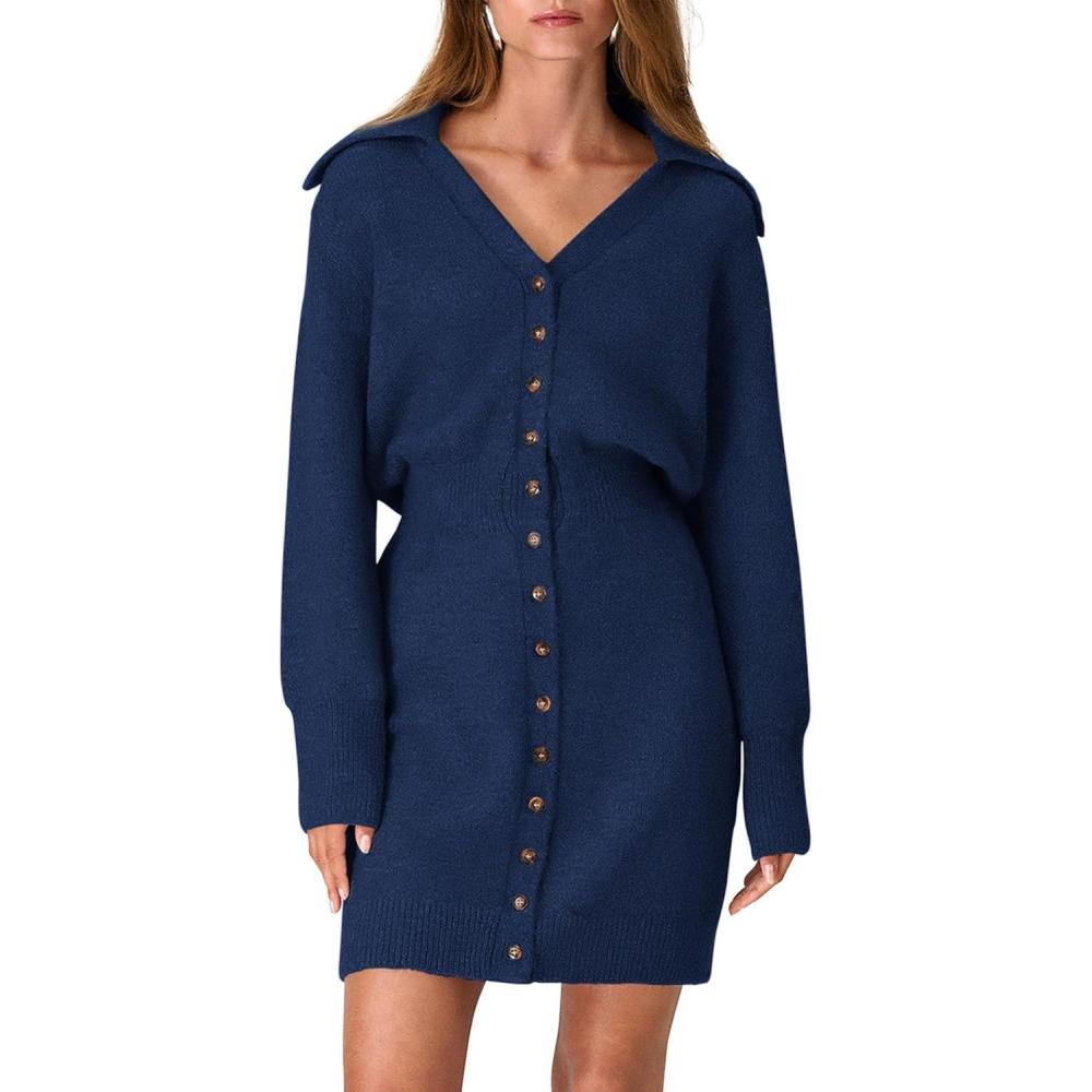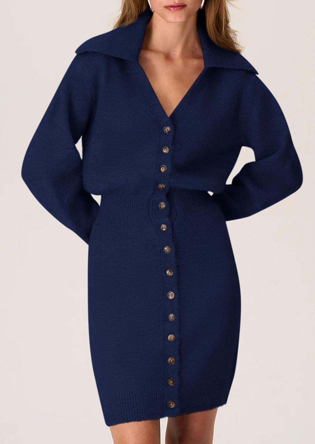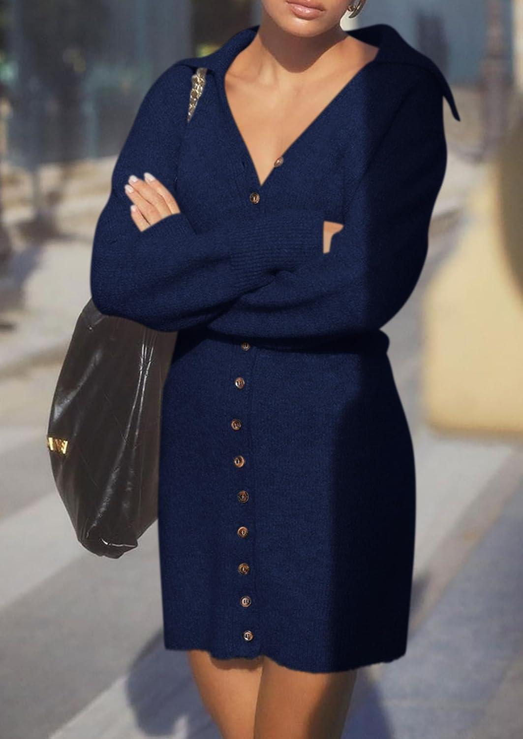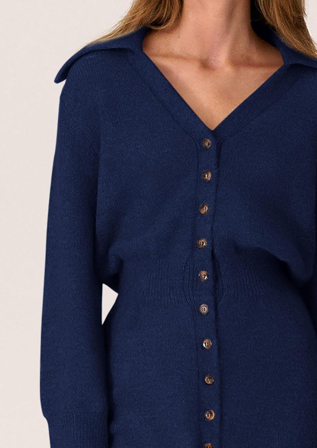 PRETTYGARDEN Sweater Dresses for Women 2025 Trendy Long Sleeve Button Down Short Mini Fall Winter Dress(Navy)