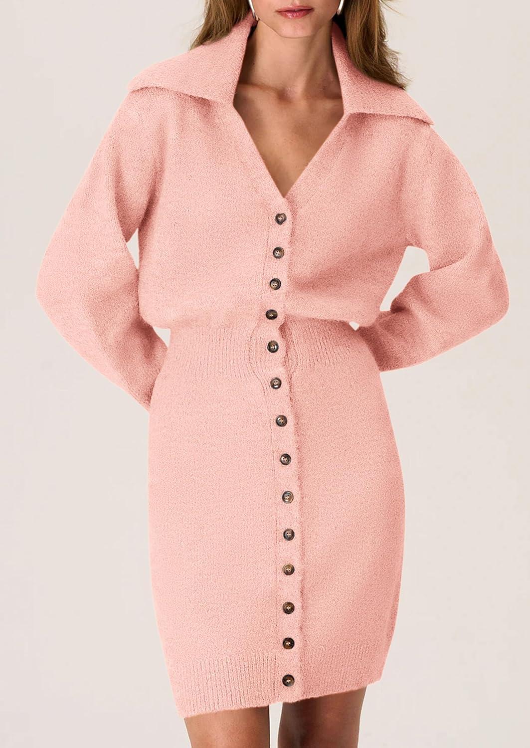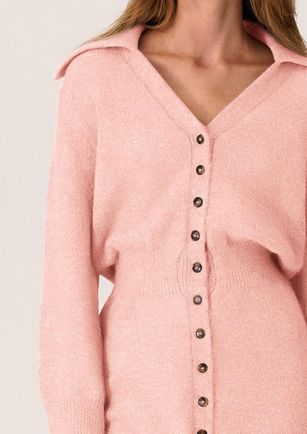 PRETTYGARDEN Sweater Dresses for Women 2025 Trendy Long Sleeve Button Down Short Mini Fall Winter Dress(Pink)