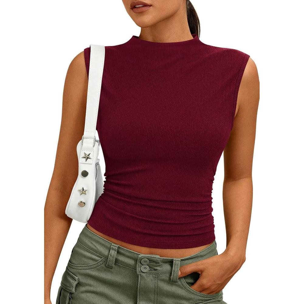 PRETTYGARDEN Tank Tops for Women 2026 Summer Mock Neck Ribbed Knit Slim Fitted Shirts Going Out Top Spring Fashion Clothes(Burgundy)