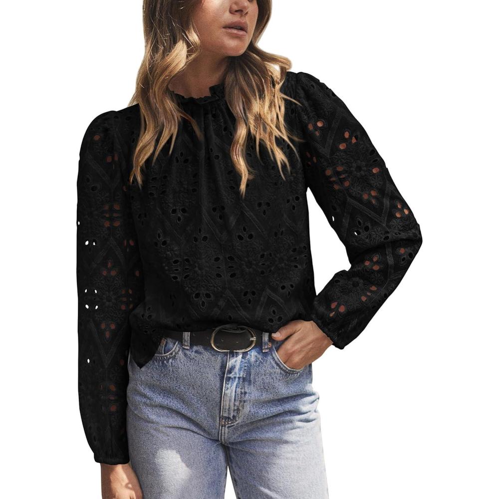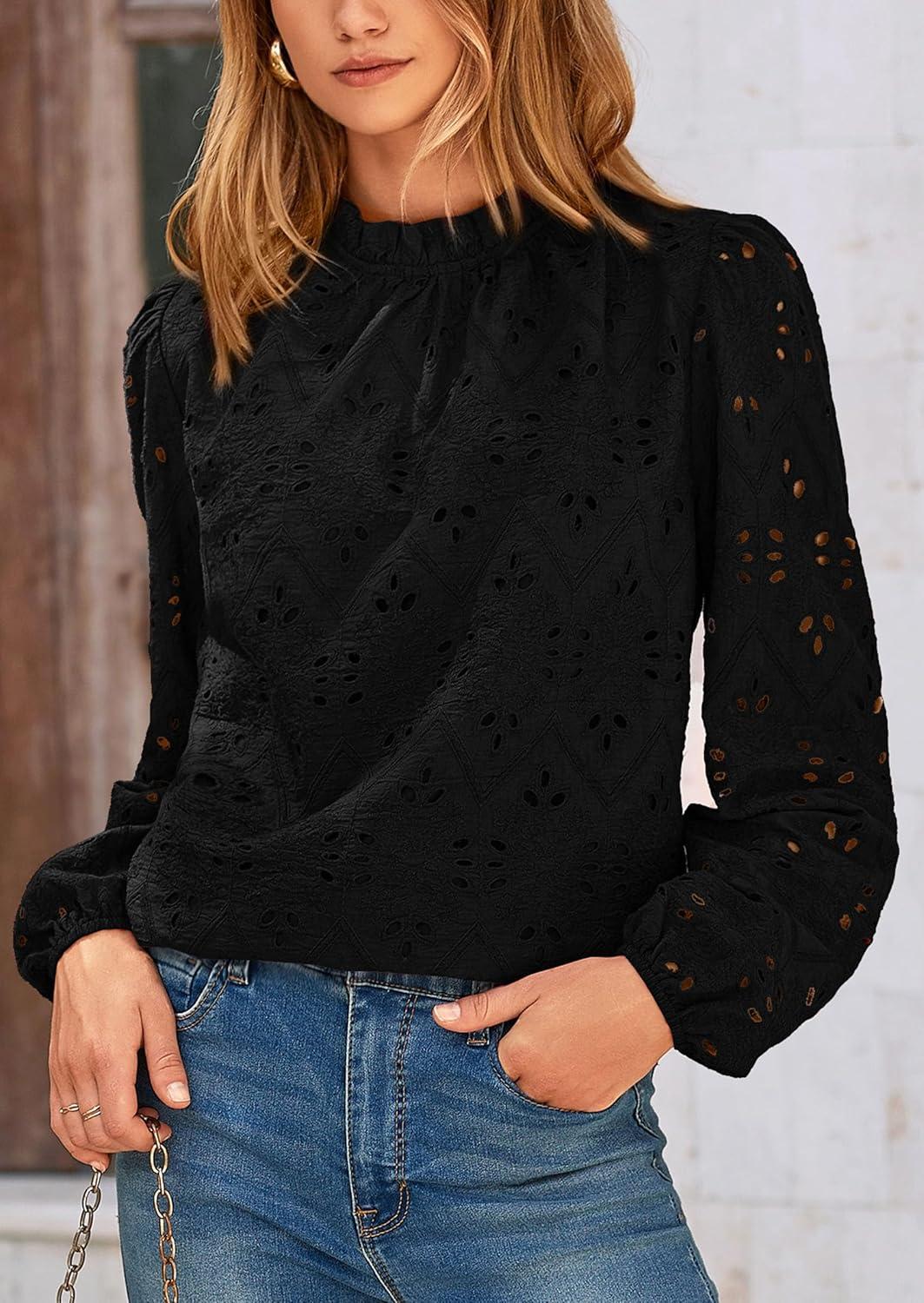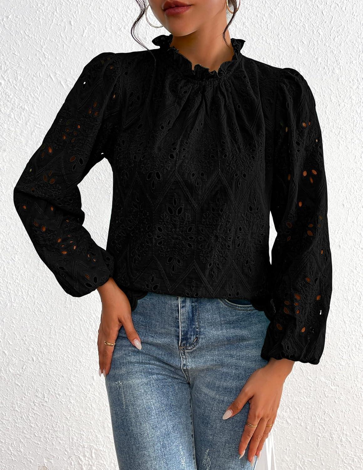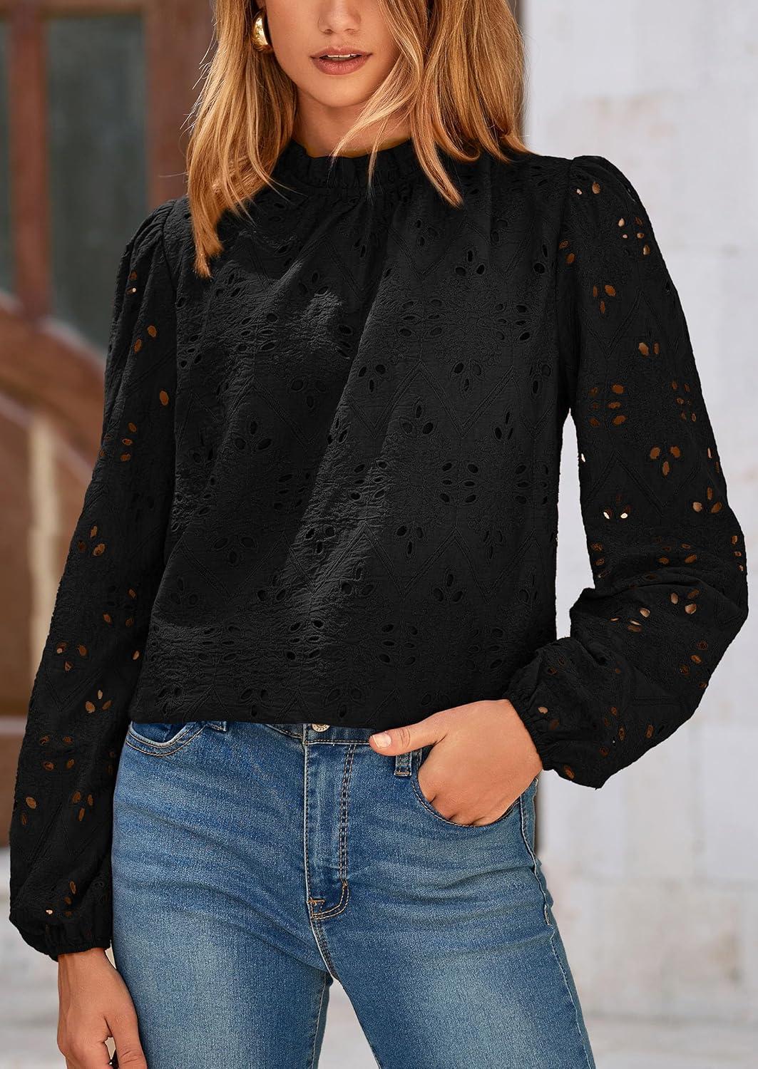 PRETTYGARDEN Tops for Women Trendy 2025 Fall Long Sleeve Blouses Dressy Casual Embroidered Eyelet Shirts Going Out Outfits(Black)
