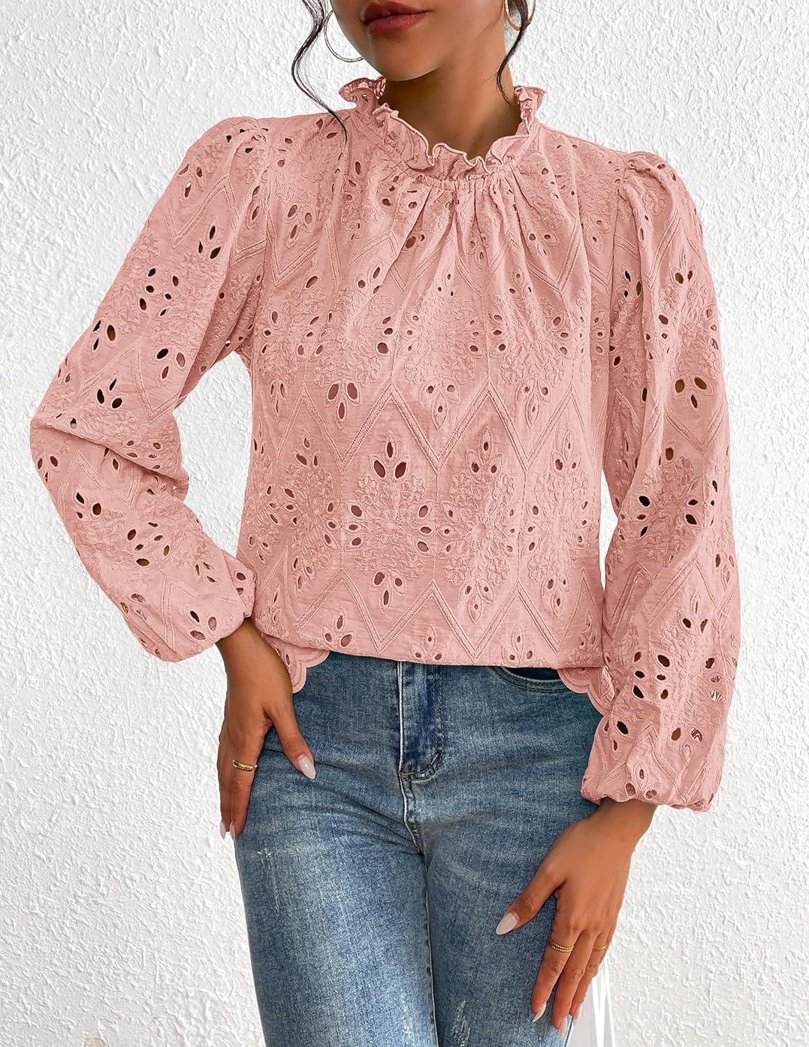 PRETTYGARDEN Tops for Women Trendy 2025 Fall Long Sleeve Blouses Dressy Casual Embroidered Eyelet Shirts Going Out Outfits(Pink)