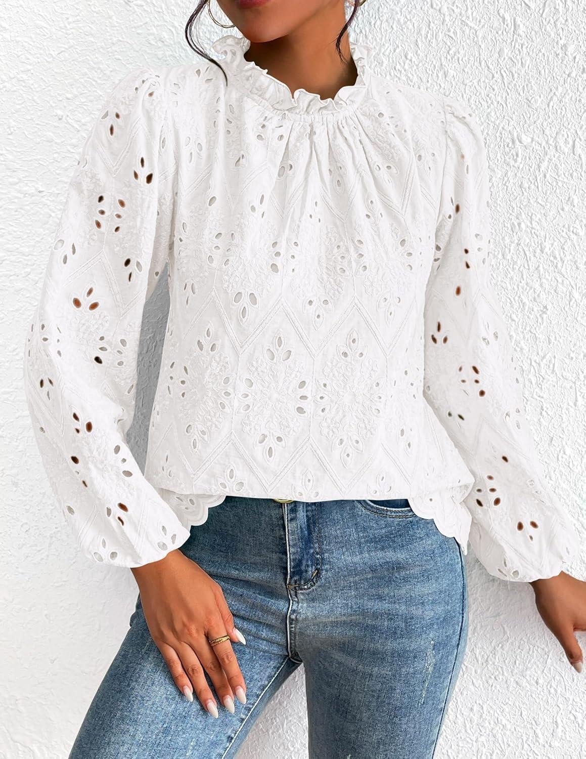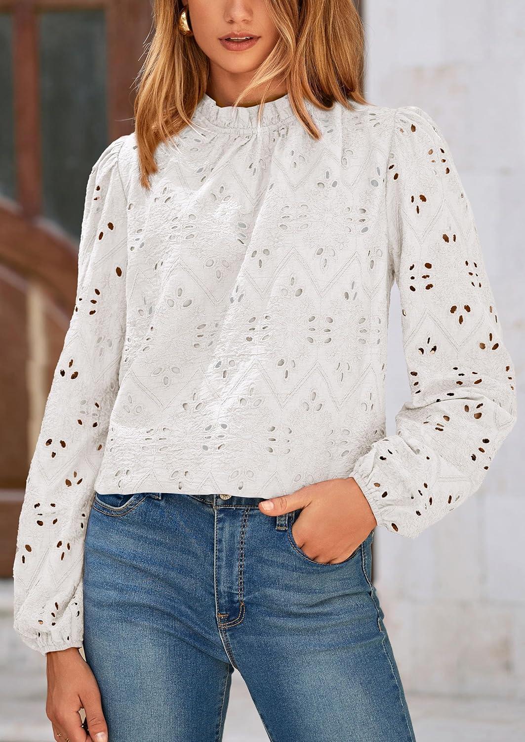 PRETTYGARDEN Tops for Women Trendy 2025 Fall Long Sleeve Blouses Dressy Casual Embroidered Eyelet Shirts Going Out Outfits(White)