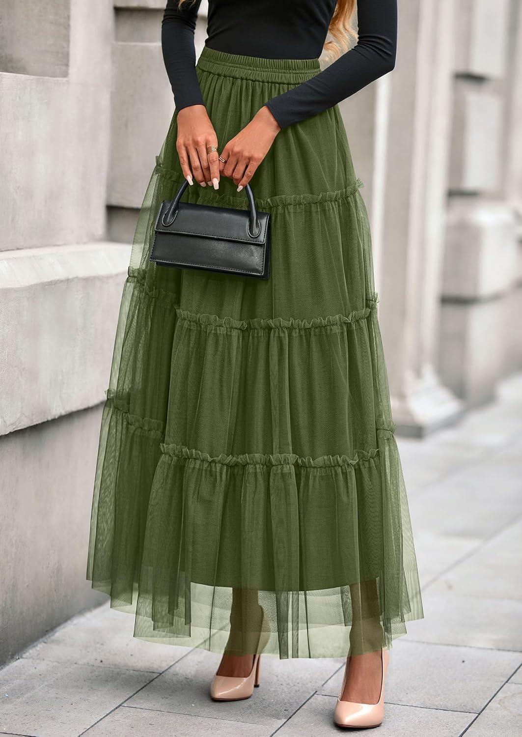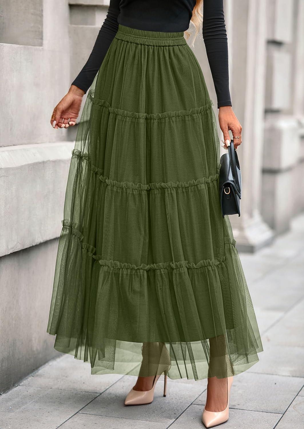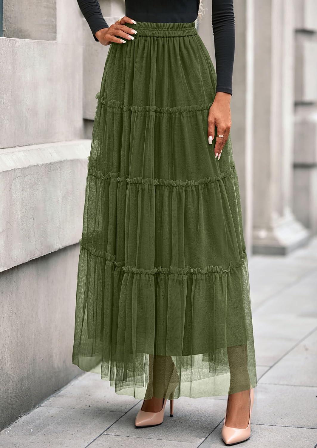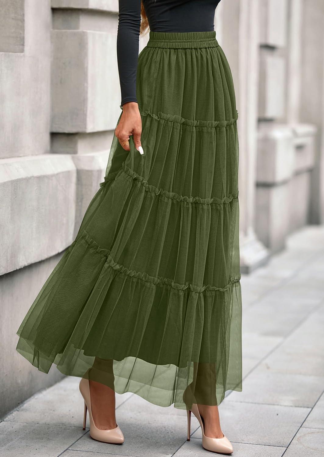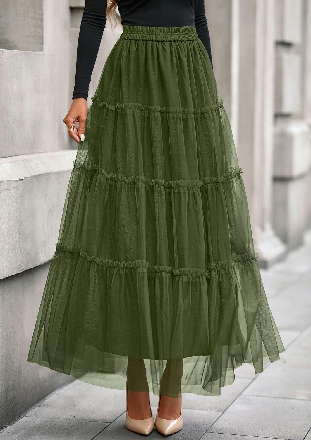 PRETTYGARDEN Tulle Skirts for Women 2025 Fall Fashion Elastic High Waisted Fairy Tiered Flowy A-Line Casual Maxi Long Skirt(Army Green)