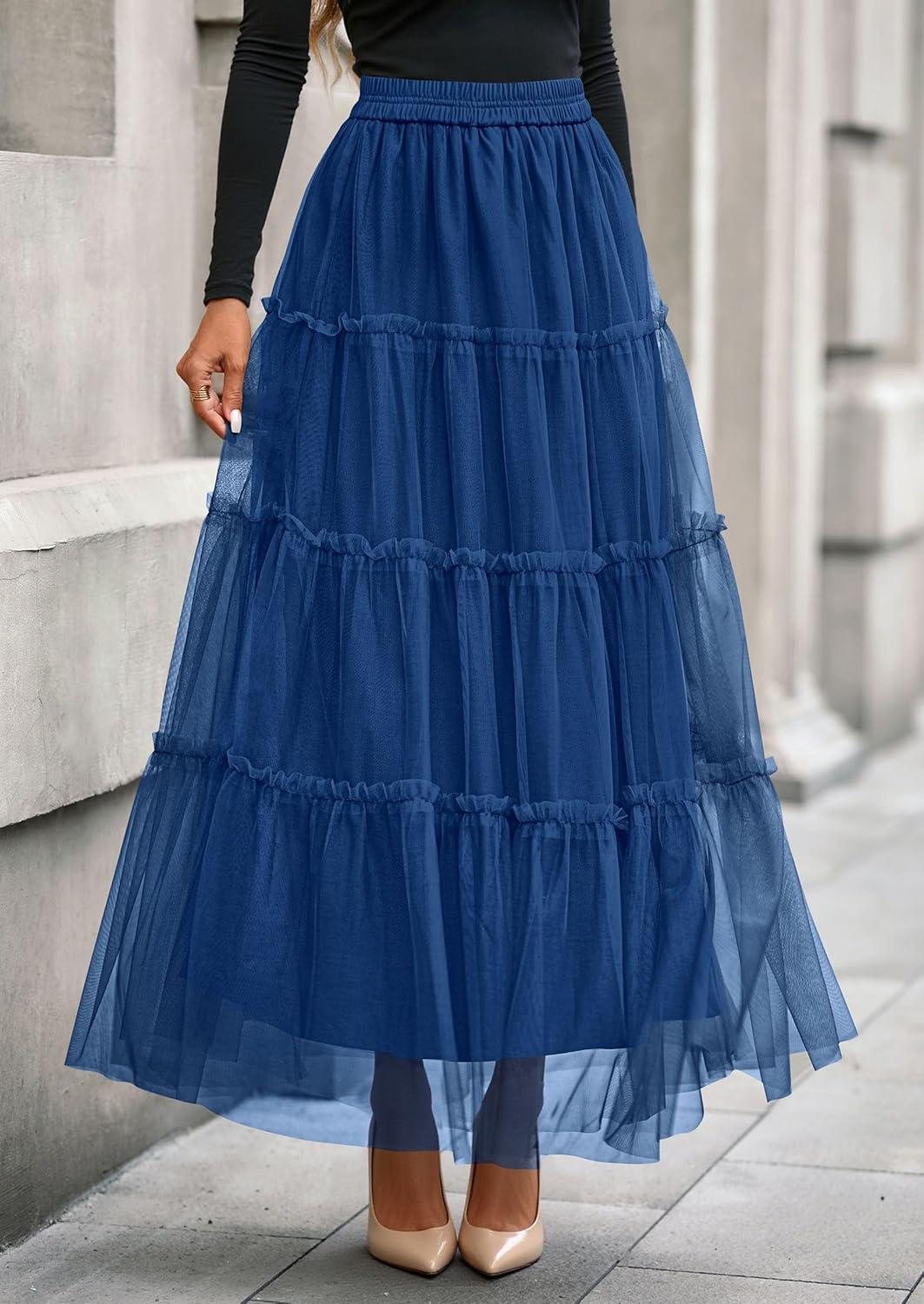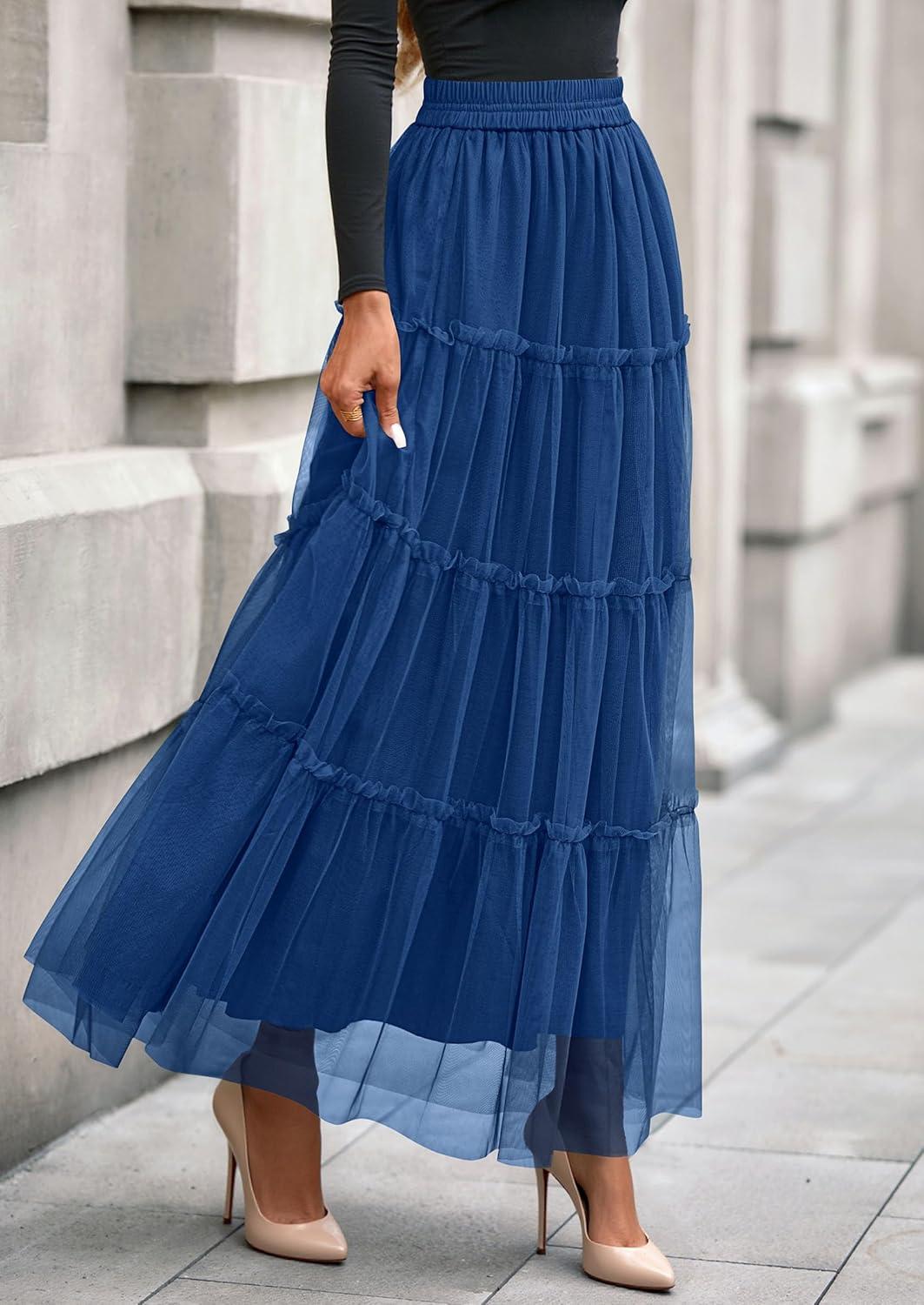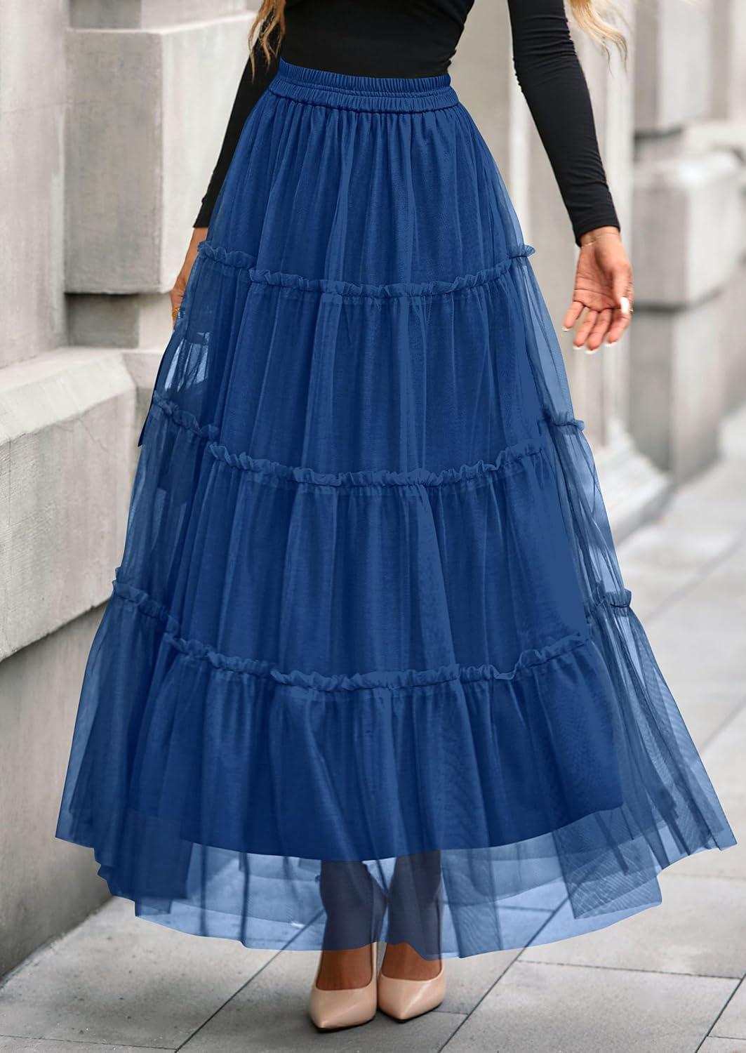 PRETTYGARDEN Tulle Skirts for Women 2025 Fall Fashion Elastic High Waisted Fairy Tiered Flowy A-Line Casual Maxi Long Skirt(Blue)