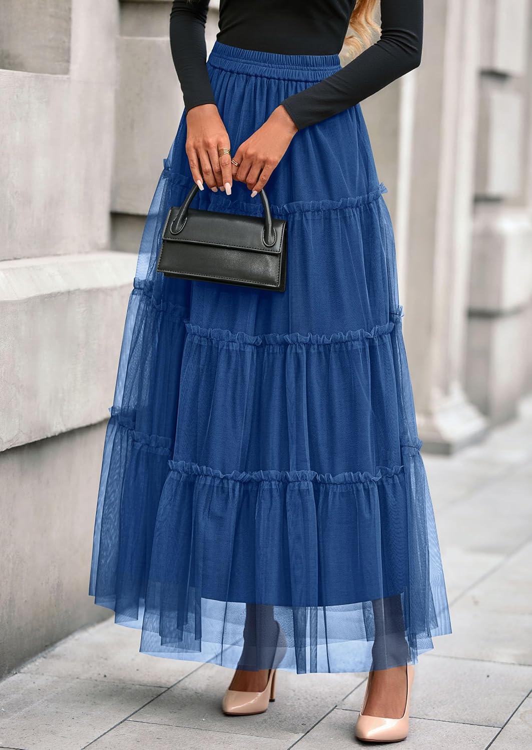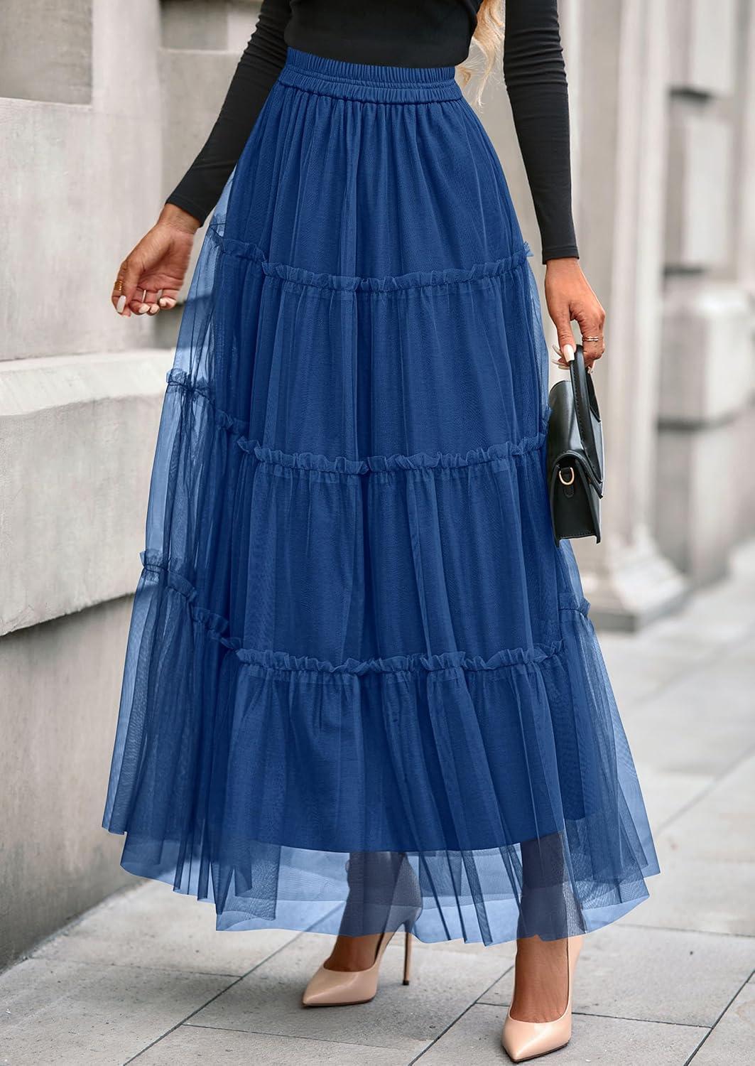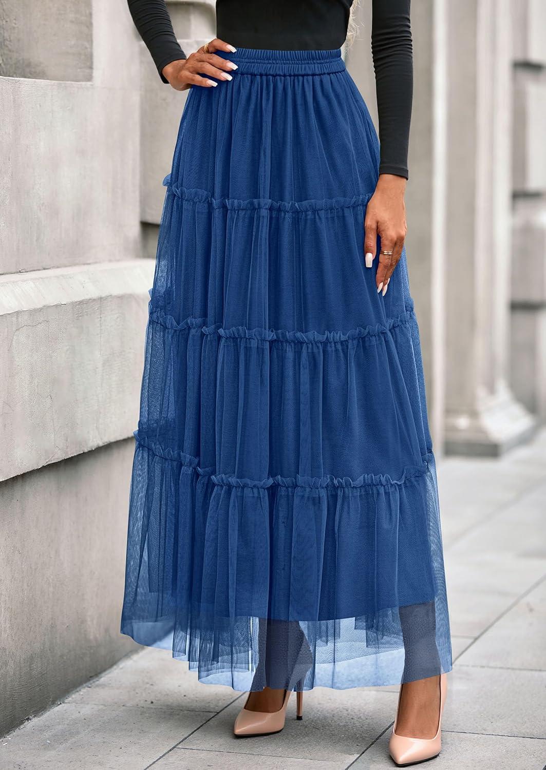 PRETTYGARDEN Tulle Skirts for Women 2025 Fall Fashion Elastic High Waisted Fairy Tiered Flowy A-Line Casual Maxi Long Skirt(Blue)