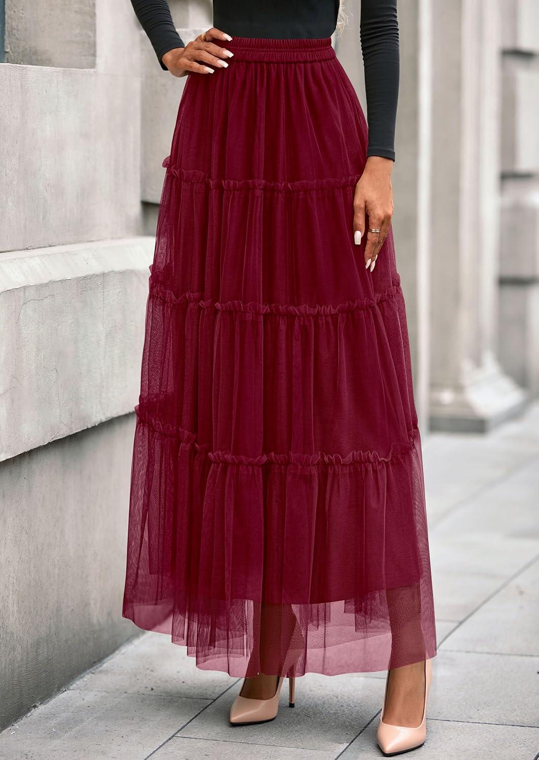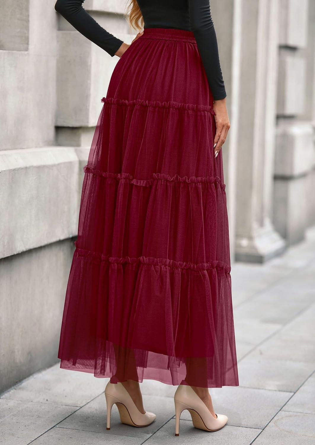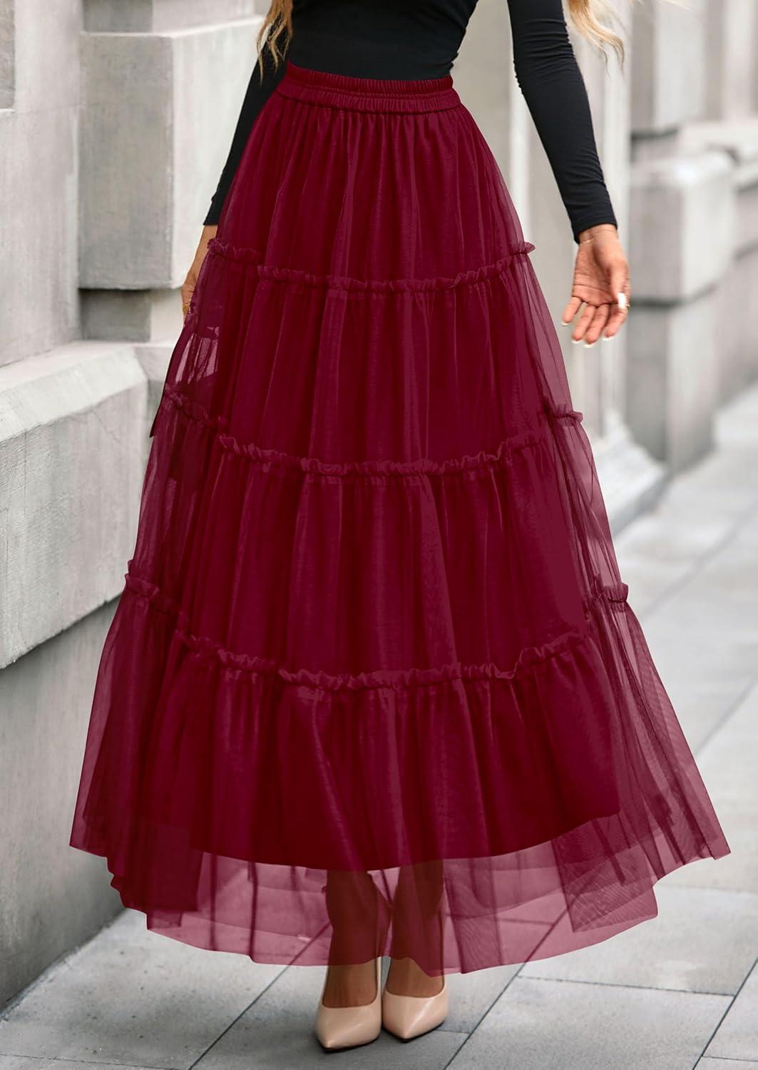 PRETTYGARDEN Tulle Skirts for Women 2025 Fall Fashion Elastic High Waisted Fairy Tiered Flowy A-Line Casual Maxi Long Skirt(Burgundy)