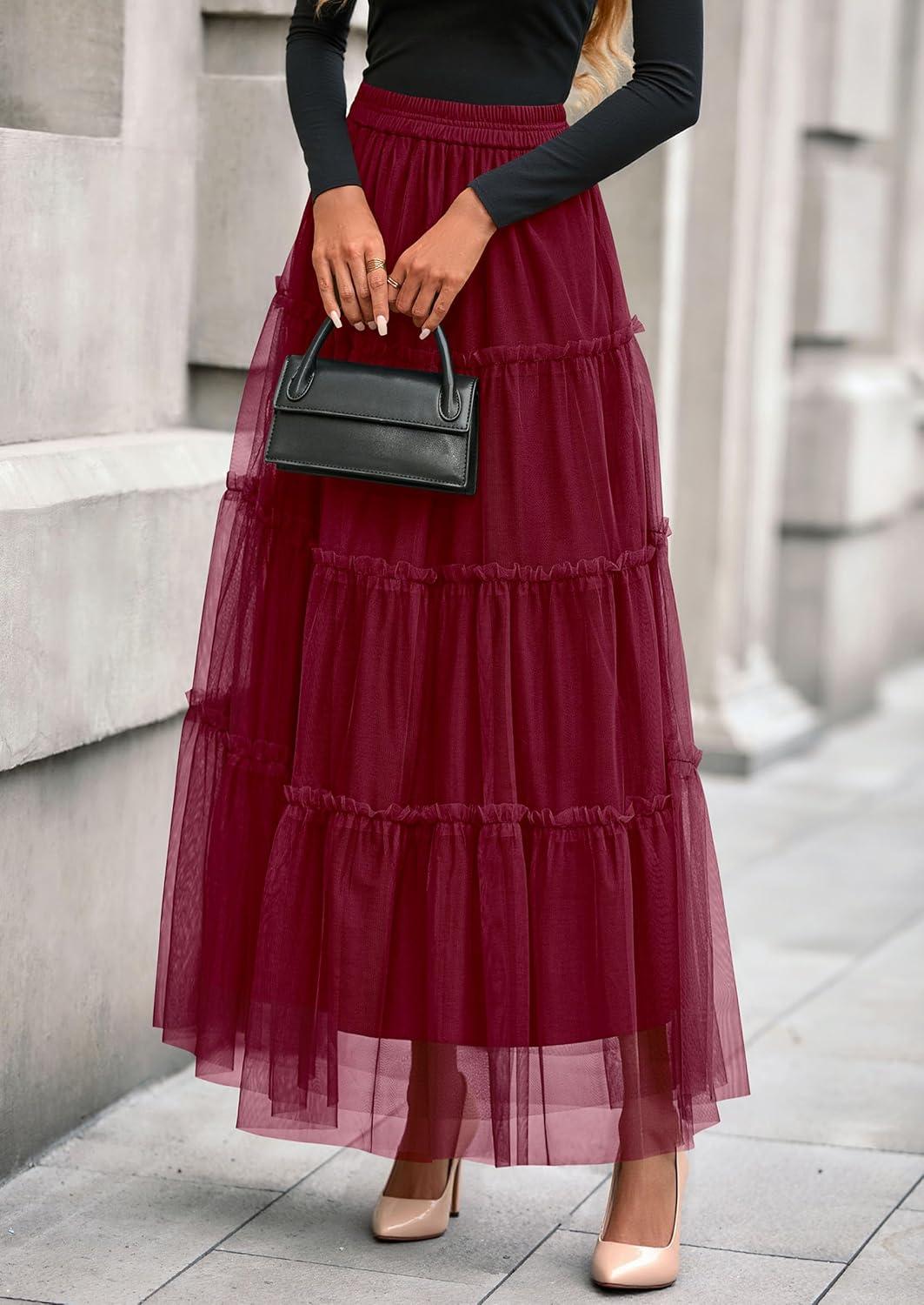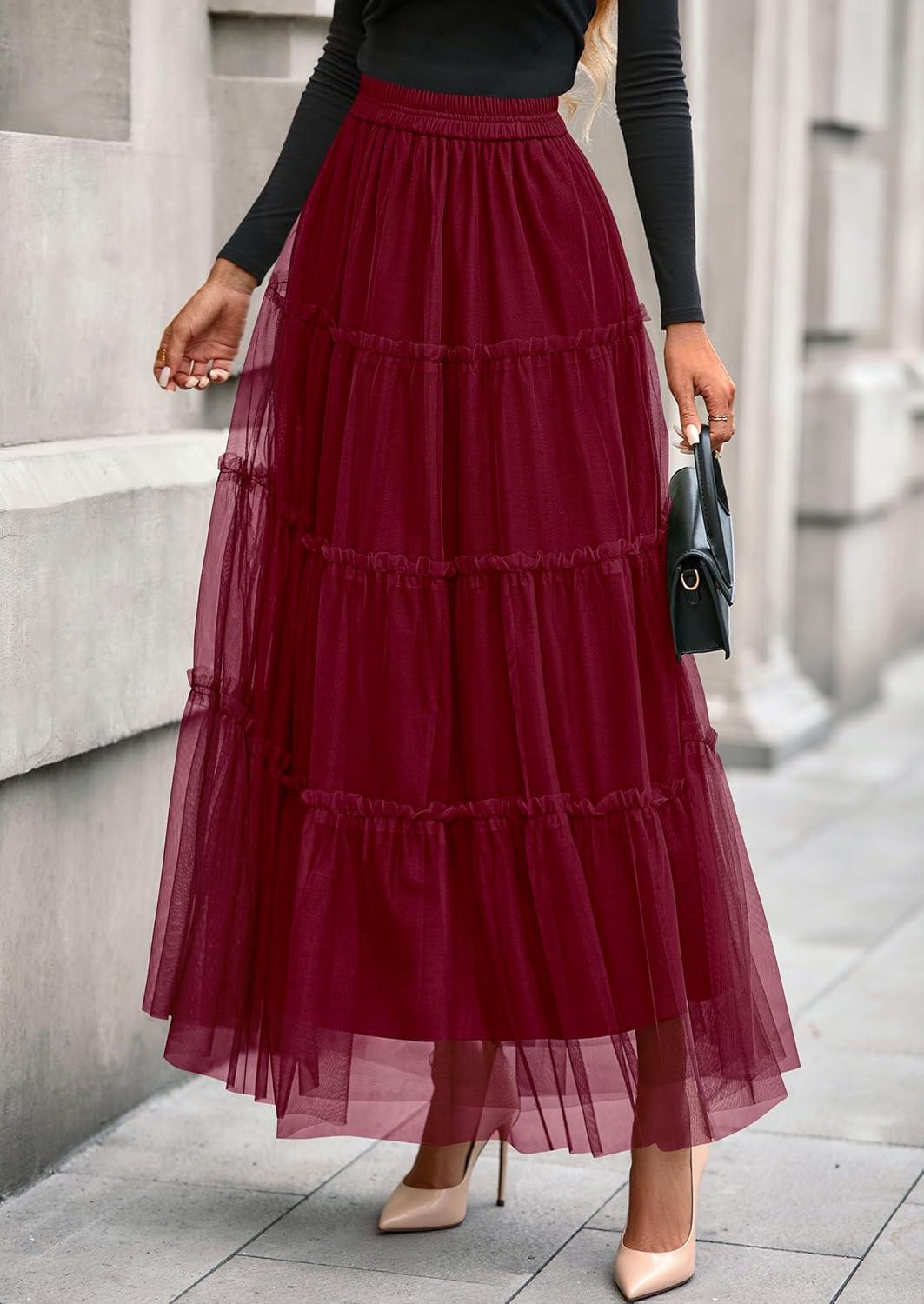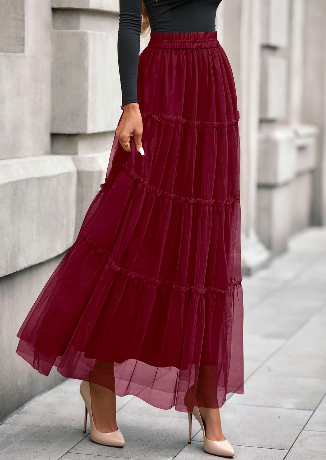 PRETTYGARDEN Tulle Skirts for Women 2025 Fall Fashion Elastic High Waisted Fairy Tiered Flowy A-Line Casual Maxi Long Skirt(Burgundy)