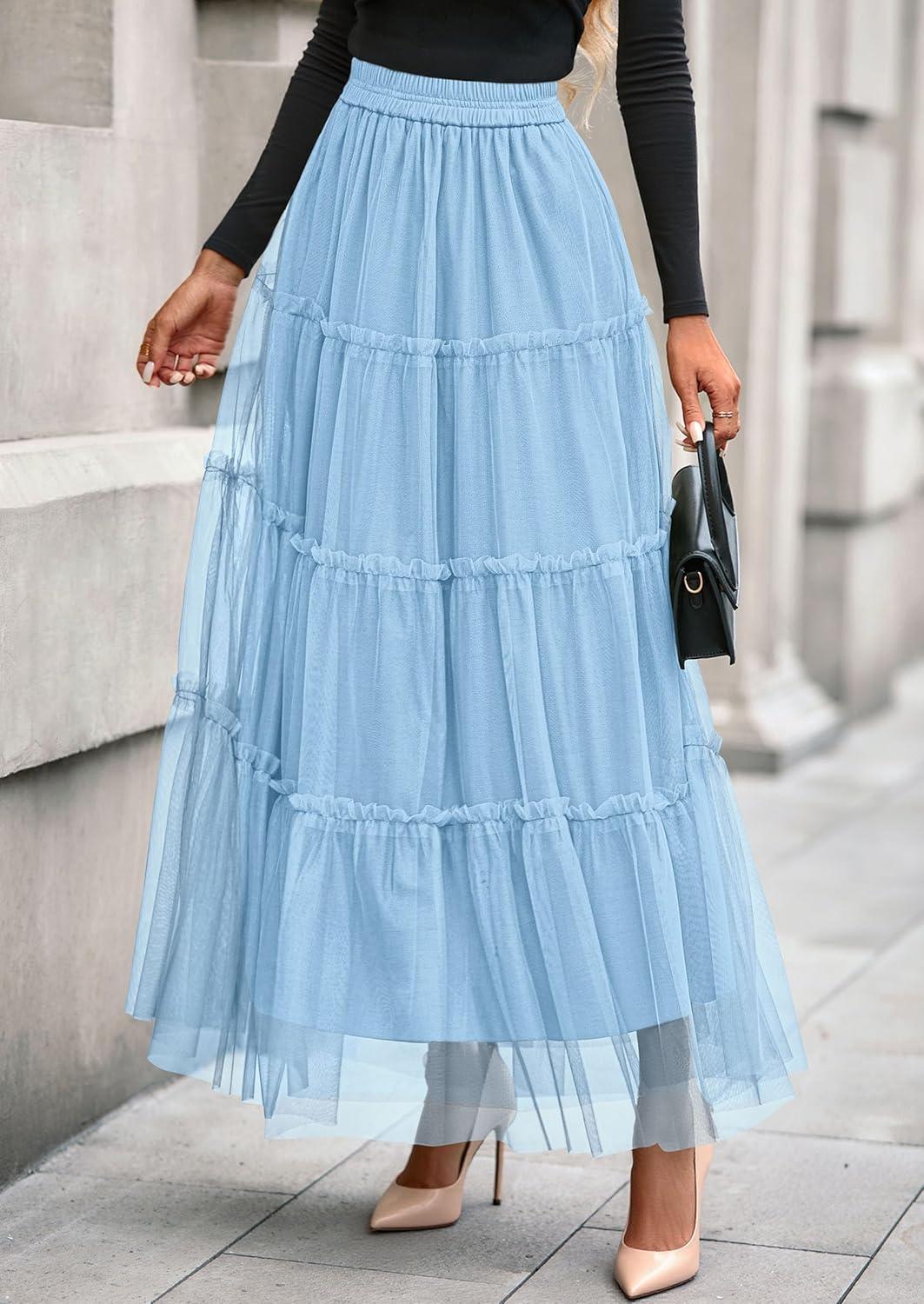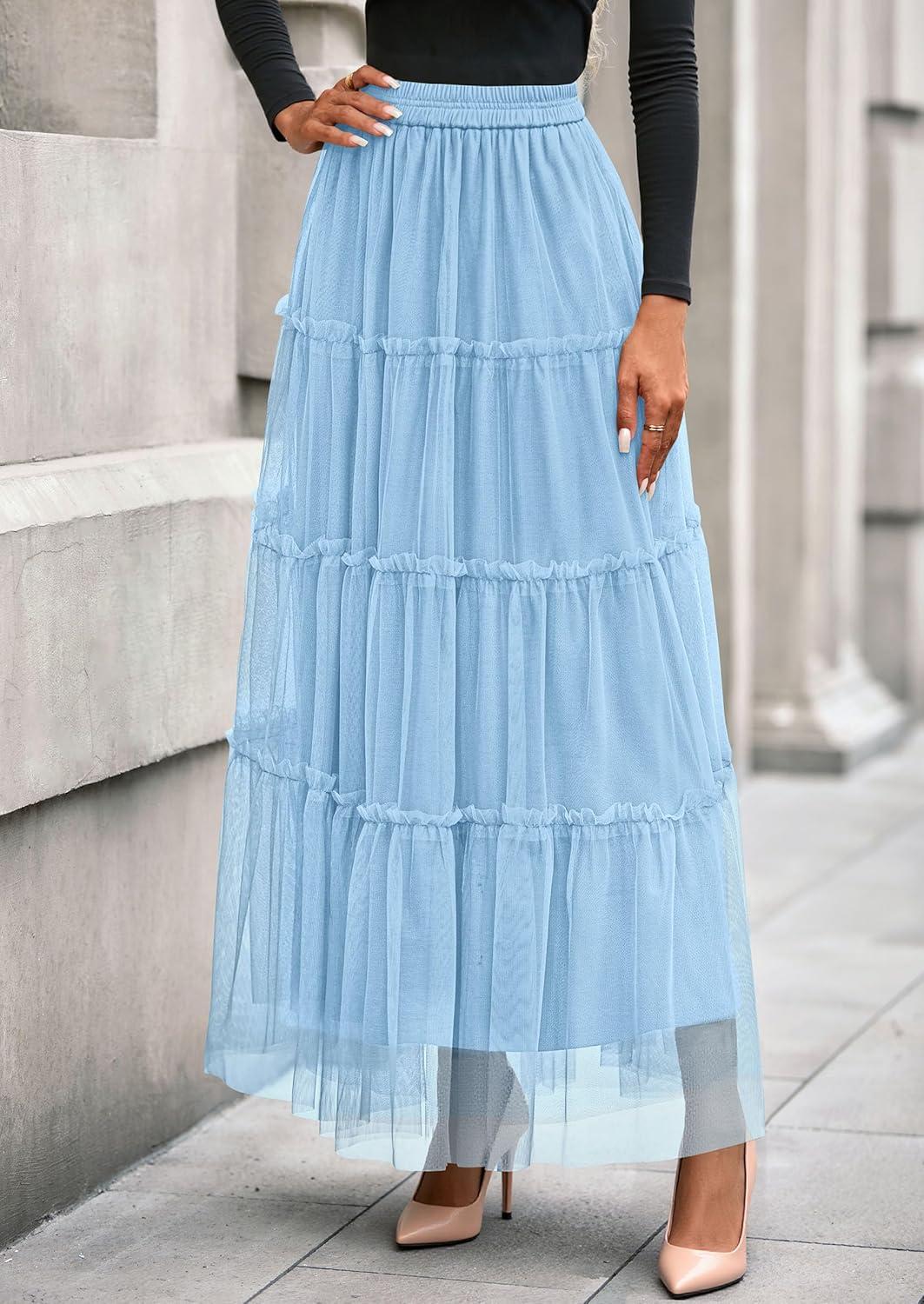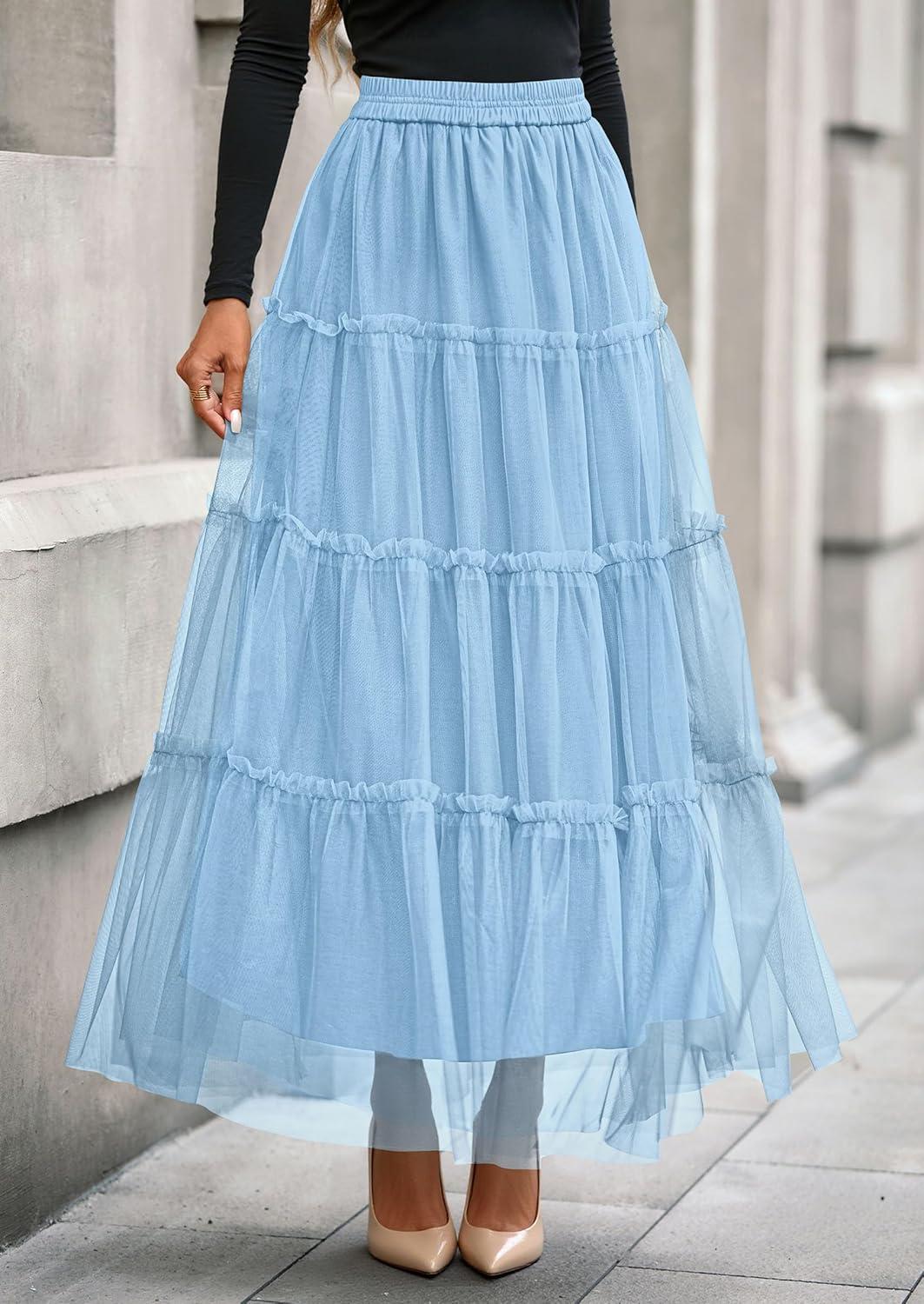 PRETTYGARDEN Tulle Skirts for Women 2025 Fall Fashion Elastic High Waisted Fairy Tiered Flowy A-Line Casual Maxi Long Skirt(Light Blue)