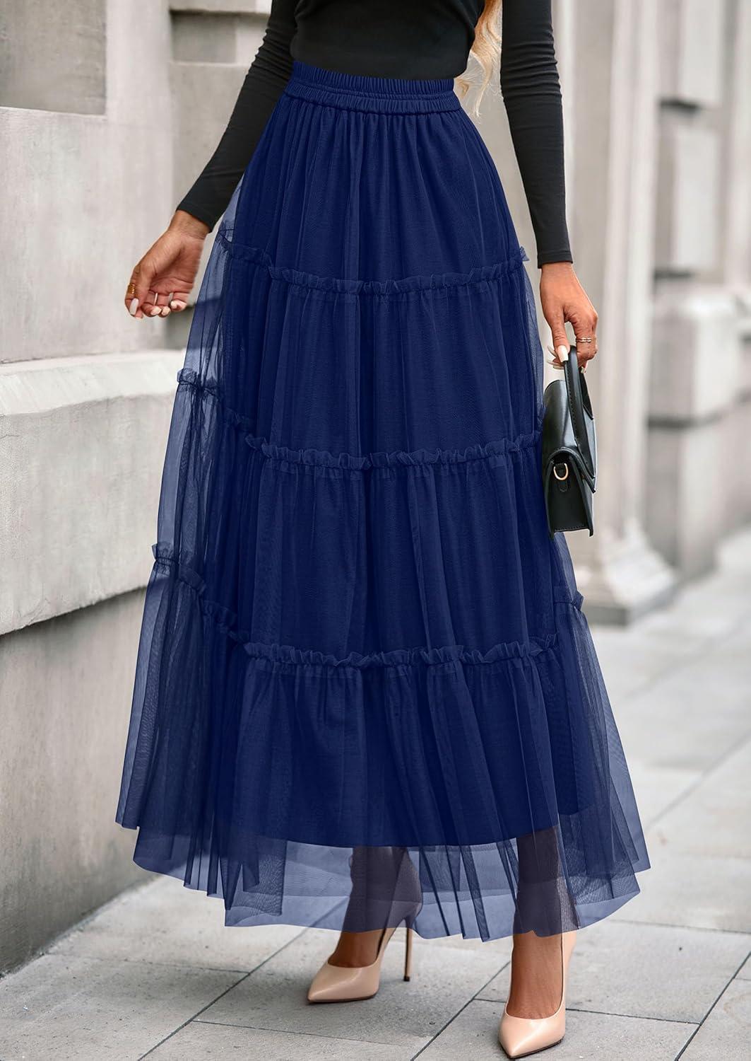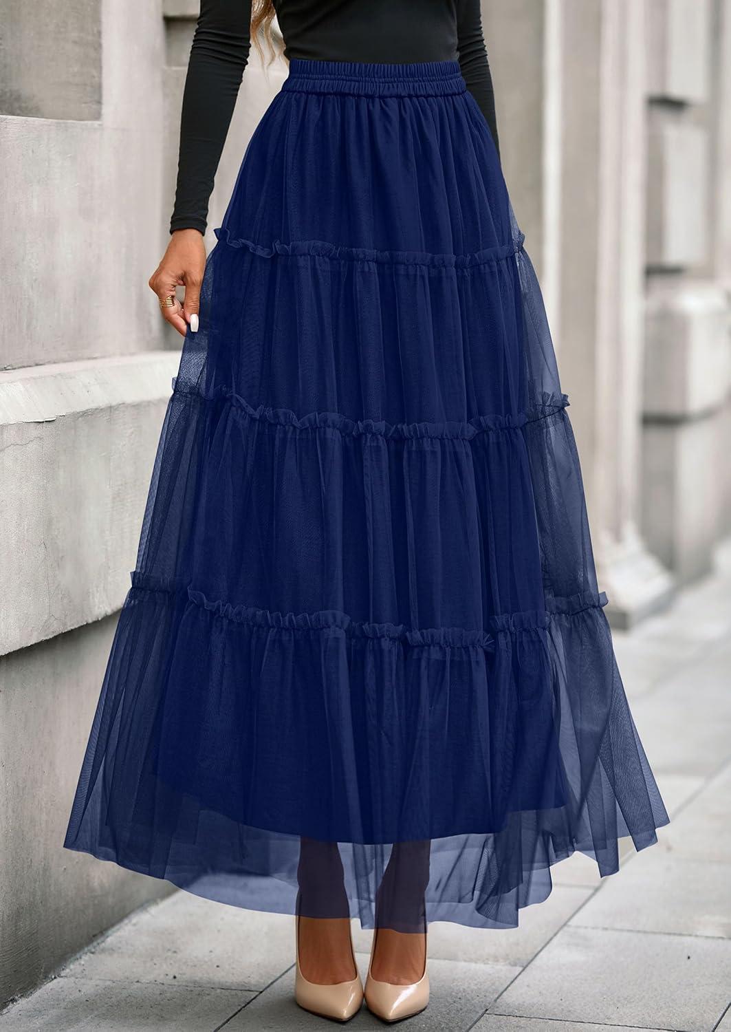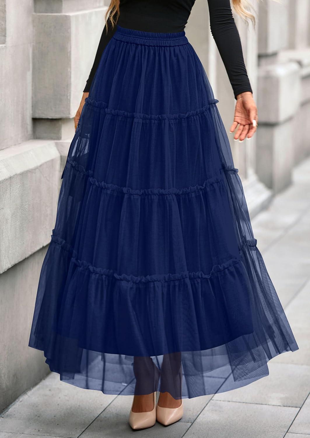 PRETTYGARDEN Tulle Skirts for Women 2025 Fall Fashion Elastic High Waisted Fairy Tiered Flowy A-Line Casual Maxi Long Skirt(Navy Blue)