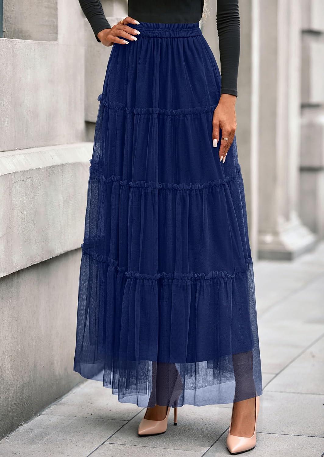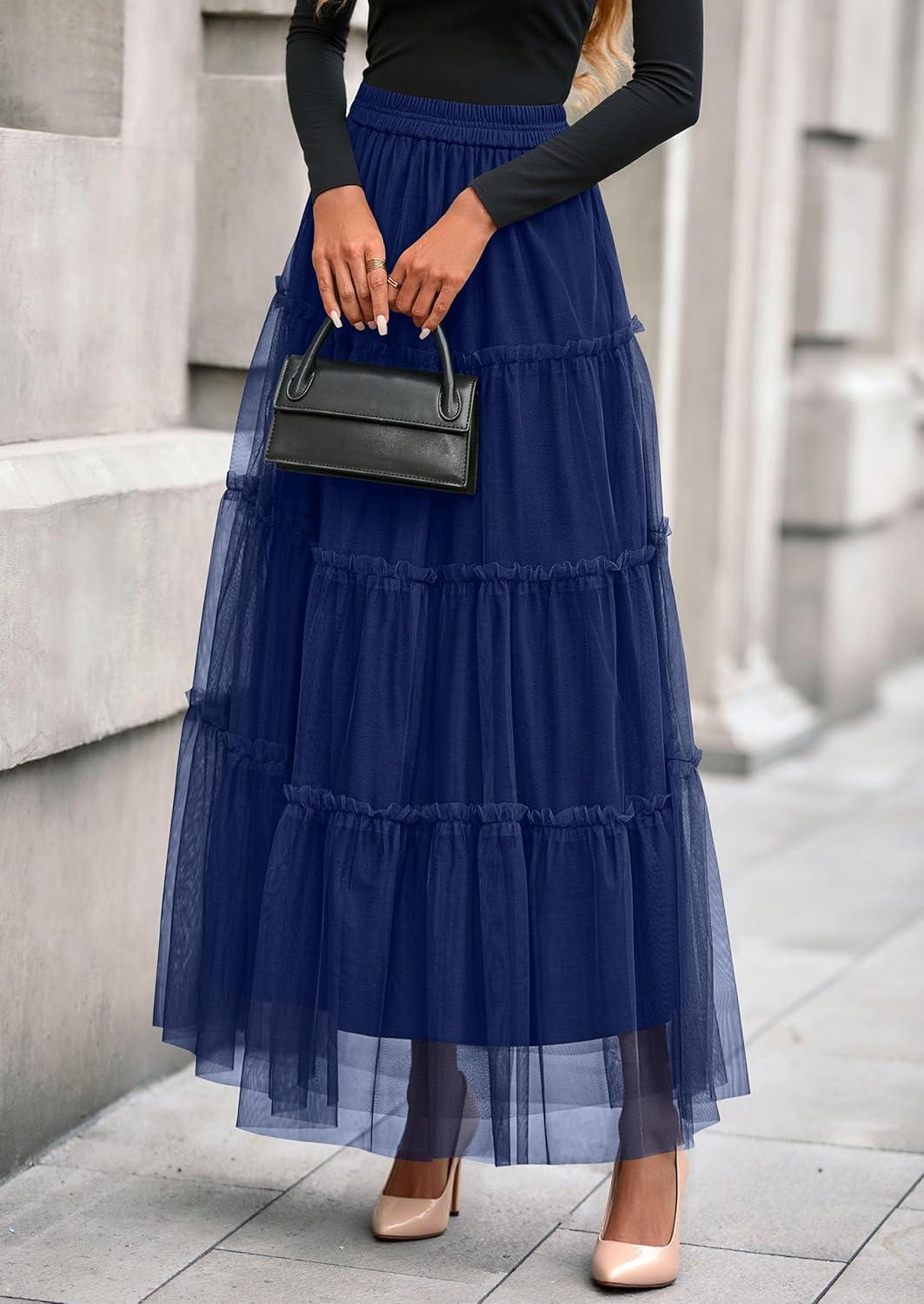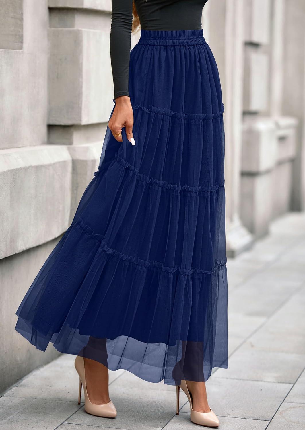 PRETTYGARDEN Tulle Skirts for Women 2025 Fall Fashion Elastic High Waisted Fairy Tiered Flowy A-Line Casual Maxi Long Skirt(Navy Blue)