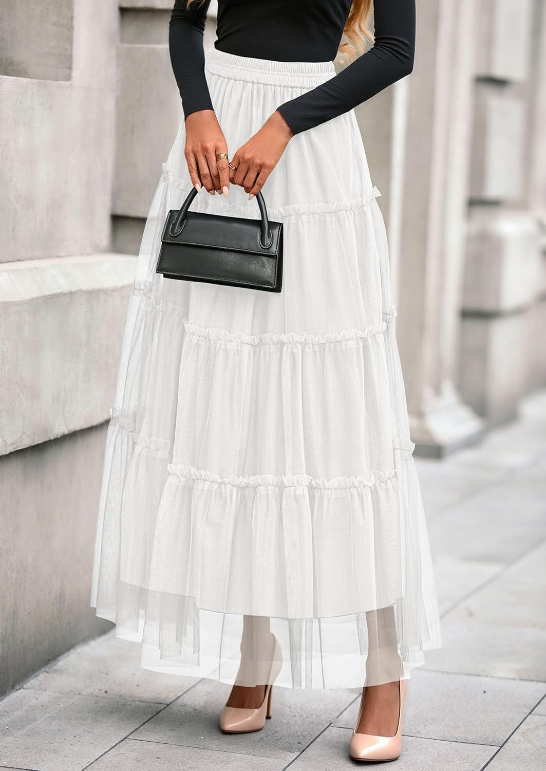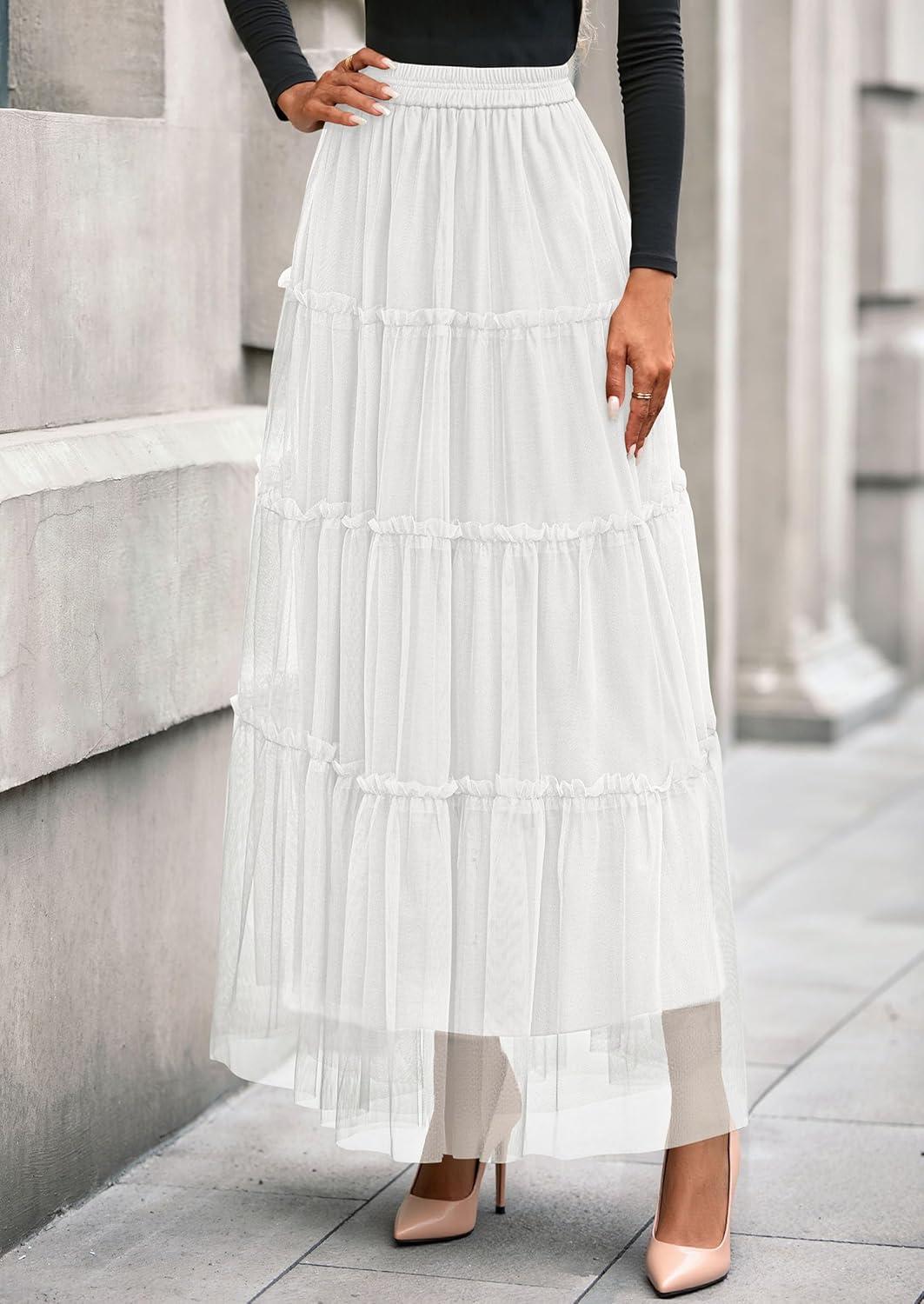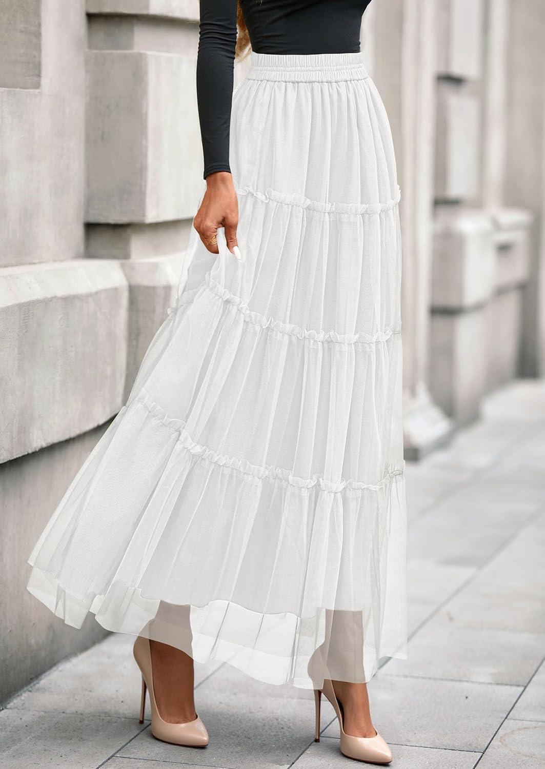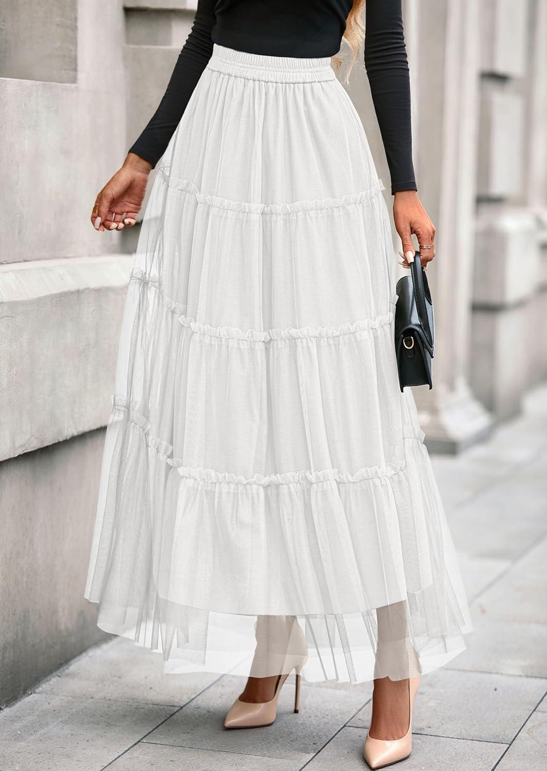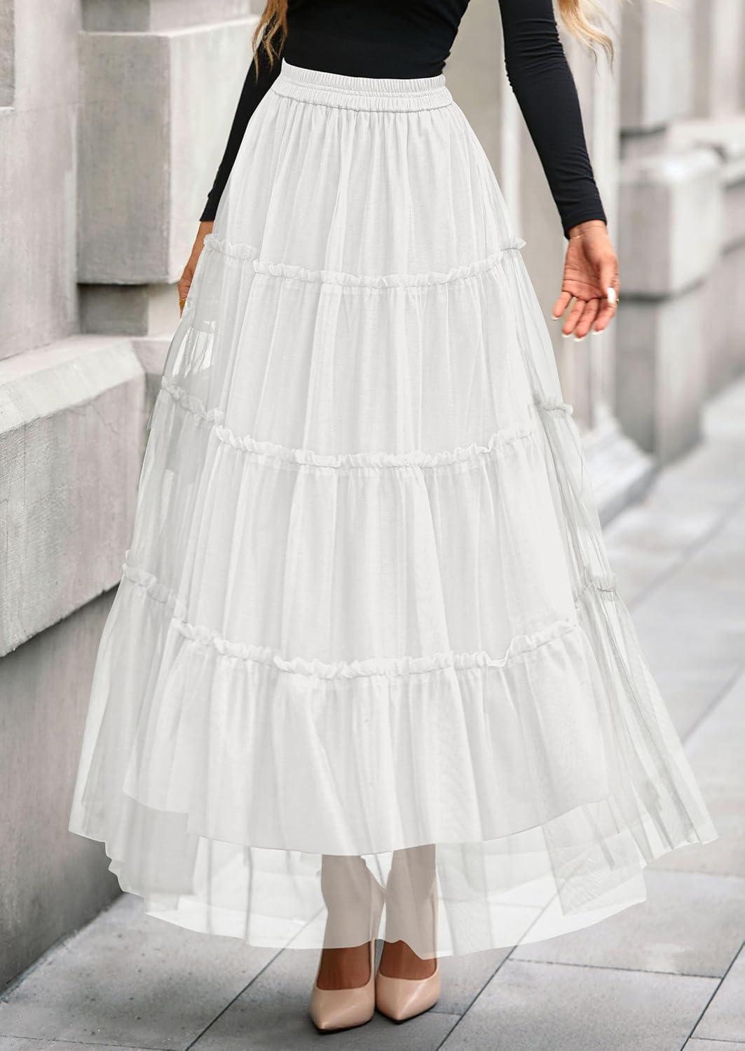 PRETTYGARDEN Tulle Skirts for Women 2025 Fall Fashion Elastic High Waisted Fairy Tiered Flowy A-Line Casual Maxi Long Skirt(White)